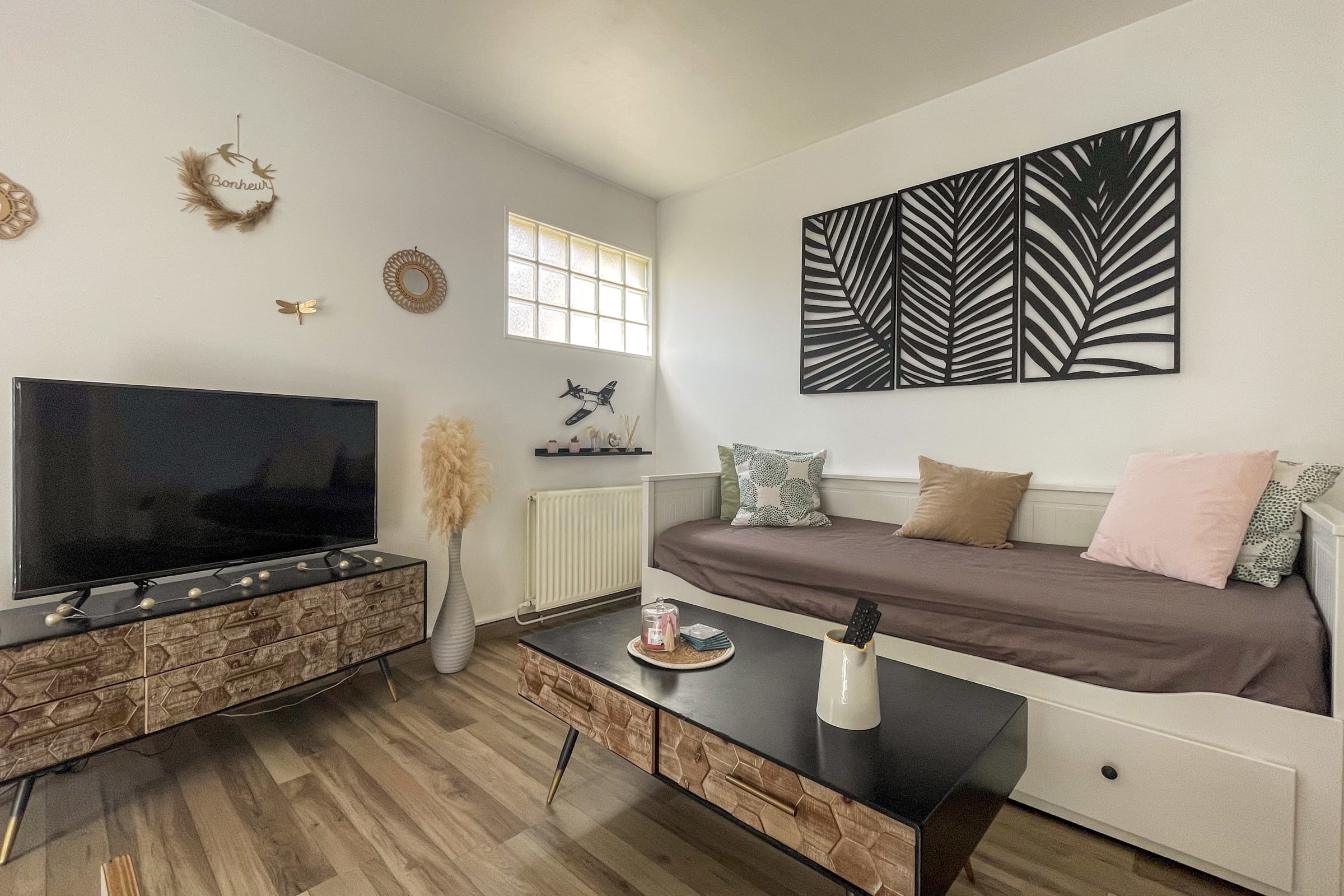 The living area is equipped with a 4K HD smart TV with apps and a TV decoder.