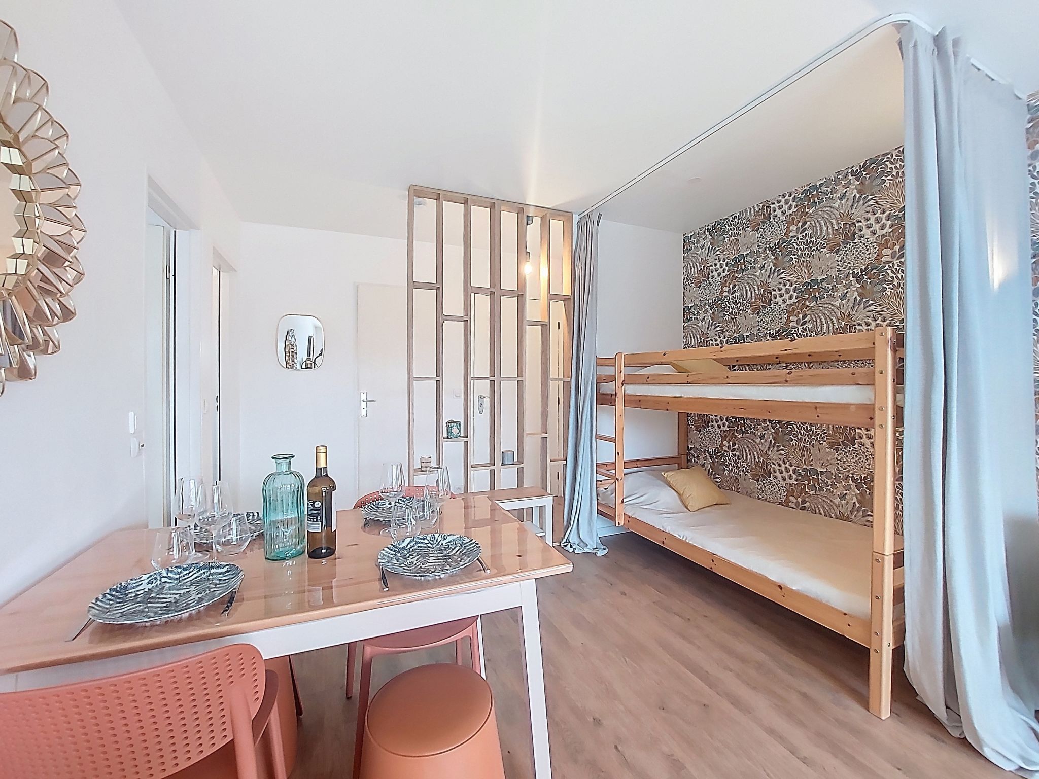 2-room apartment 43 m2 on 2nd floor. Object suitable for 2 adults + 2 children. Renovated, beautiful and tasteful furnishings: living/dining room with 1 x 2 bunk beds (90 cm, length 190 cm), TV (flat screen). Exit to the terrace. 1 room with 1 french bed (1 x 140 cm, length 190 cm). Exit to the terrace. Kitchen (dishwasher, 3 induction hot plates, toaster, kettle, microwave, electric coffee machine, Capsules for coffee machine (Nespresso) extra). Bathroom, sep. WC. Electric heating. Terrace 12 m2, south facing position. Terrace furniture. Facilities: hair dryer. Internet (WiFi, free). Garage (1 car). Please note: suitable for families. Non-smokers only. Smoke alarm. Offer by a private individual according to Art. 155, IV of CGI. 33009004155C4