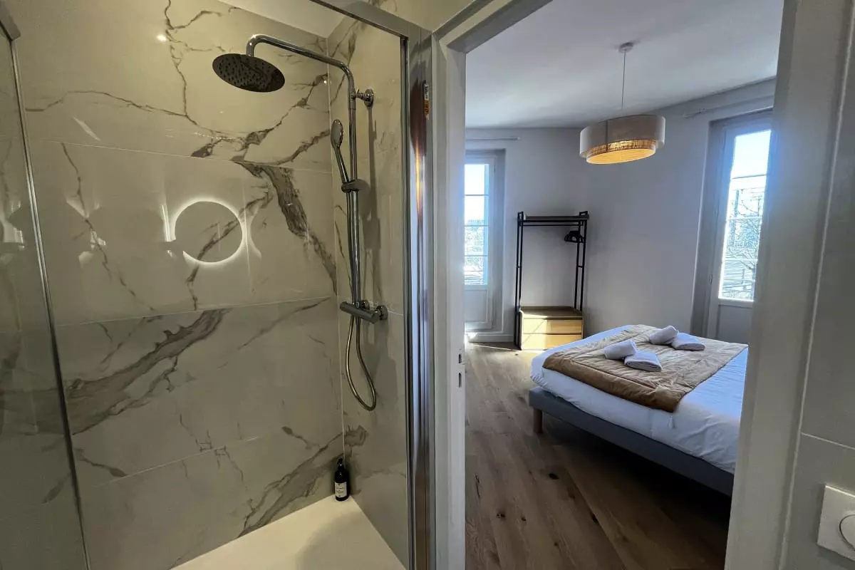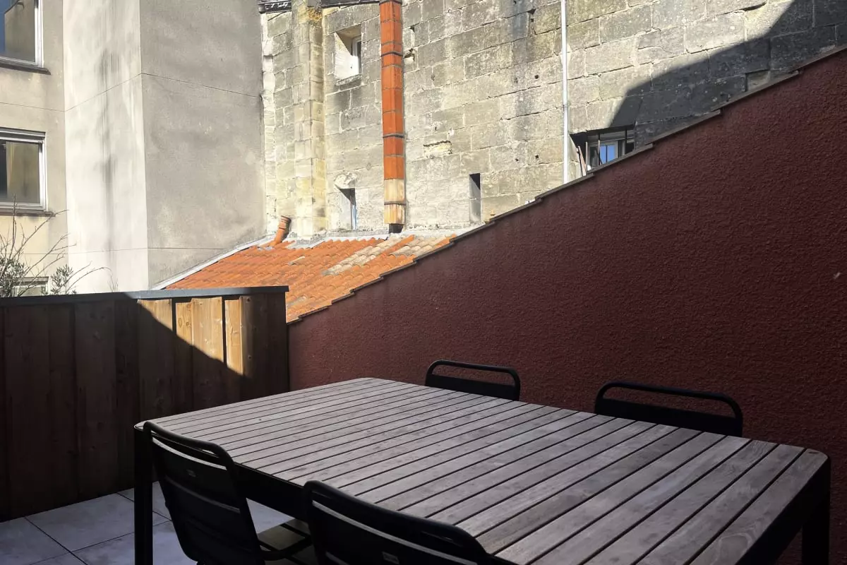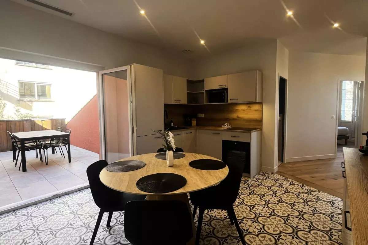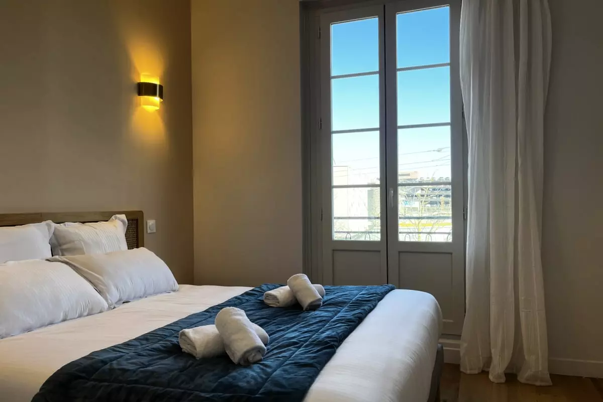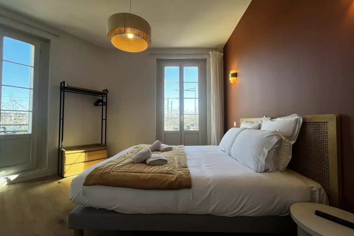 Modern 2-bedroom apartment with a terrace, accommodating up to 4 people, located opposite Saint-Jean train station. Features include air conditioning, private bathrooms, Wi-Fi, and a fully equipped kitchen. Comfortable, secure, and ideal for exploring the city.
