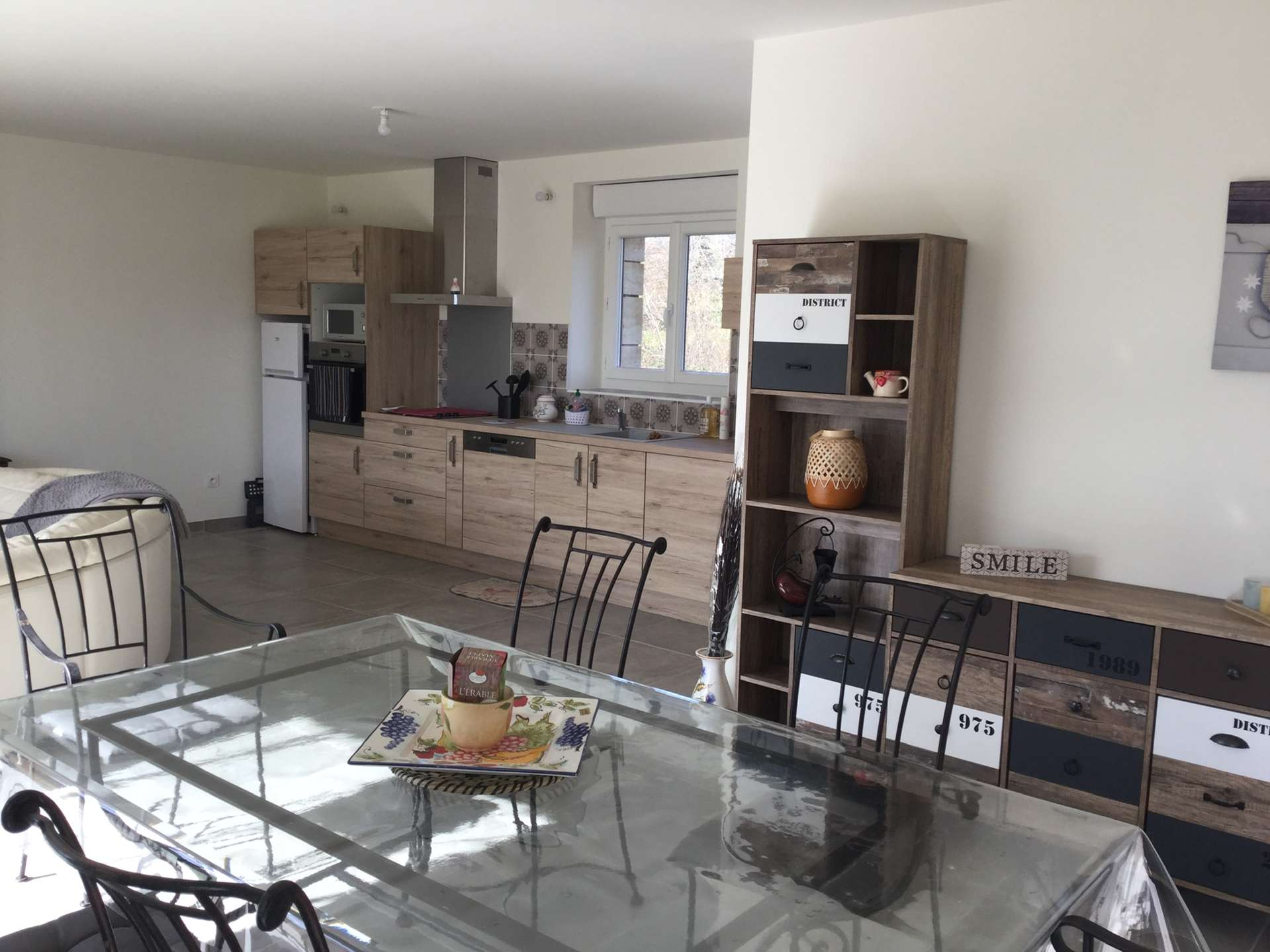 The fully equipped kitchen opens onto a spacious living area comprising a lounge and dining room, bathed in light thanks to the large bay windows overlooking the garden. The wood-burning stove at the heart of the living area creates a cosy atmosphere for cool evenings at the start and end of the season.
