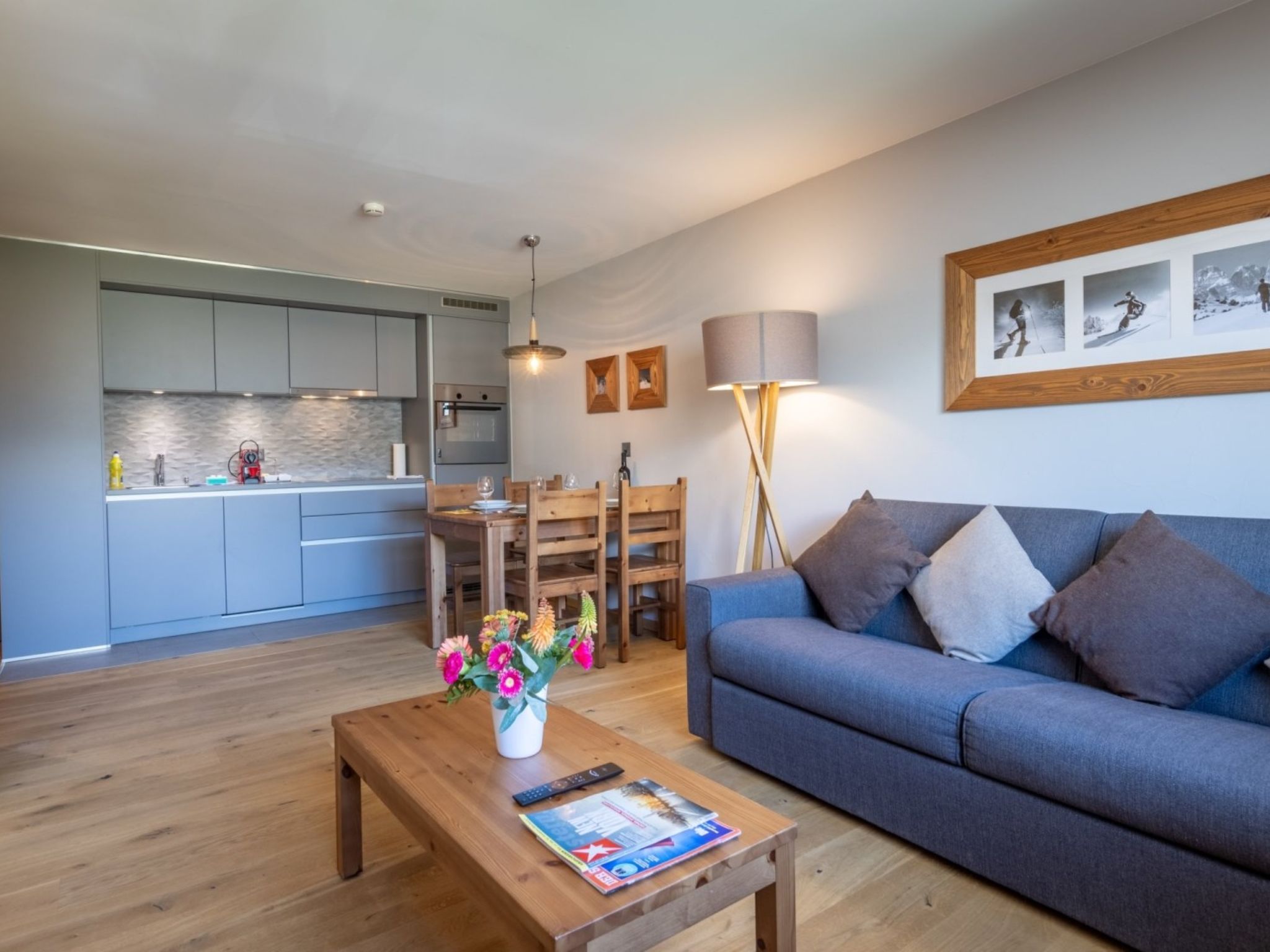 "6 personnes 2 chambres Supérieur", 3-room apartment 58 m2. Tasteful and cosy furnishings: living/dining room with dining table, digital TV, international TV channels and flat screen. 1 room with 1 double bed (2 x 90 cm, length 200 cm). 1 room with 1 x 2 bunk beds (90 cm, length 200 cm), 1 double bed (2 x 90 cm, length 200 cm), shower/WC. Open kitchen (oven, dishwasher, 4 ceramic glass hob hotplates, electric coffee machine, Capsules for coffee machine (Nespresso) extra). Shower/WC. Underfloor heating. Parquet floors. Facilities: hair dryer. Internet (WiFi, free). Please note: non-smoking house. Maximum 1 pet/ dog allowed. The property is one of a type of property or apartment. A fondue set (meet or cheese) as well as a raclette grill can be borrowed at the reception against a deposit.
