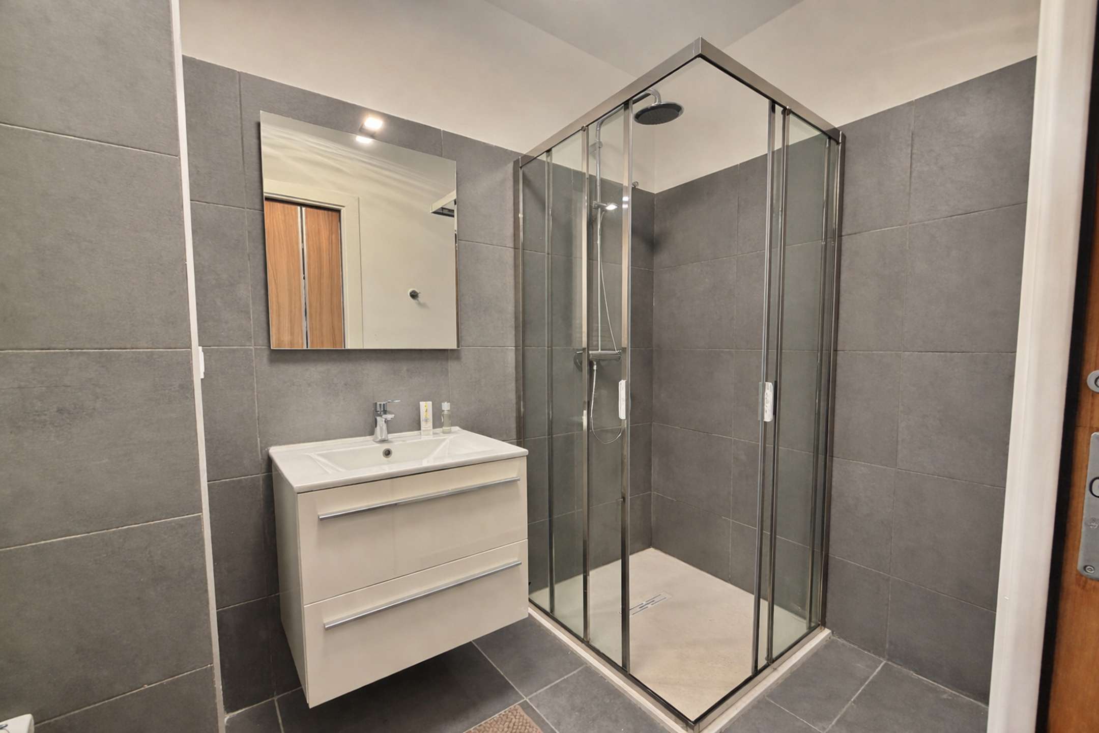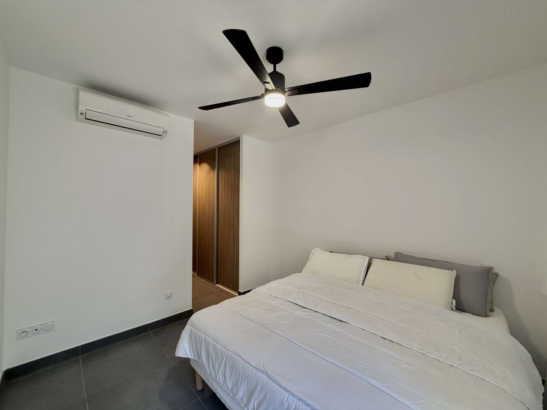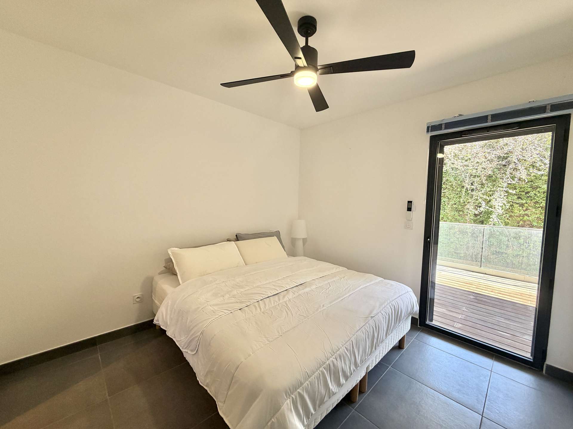 This apartment features a fully equipped kitchen open to the living room, leading onto a balcony, as well as a separate toilet. The sleeping area consists of two suites, each with a 180 cm bed, a shower room with toilet, and a dressing area.