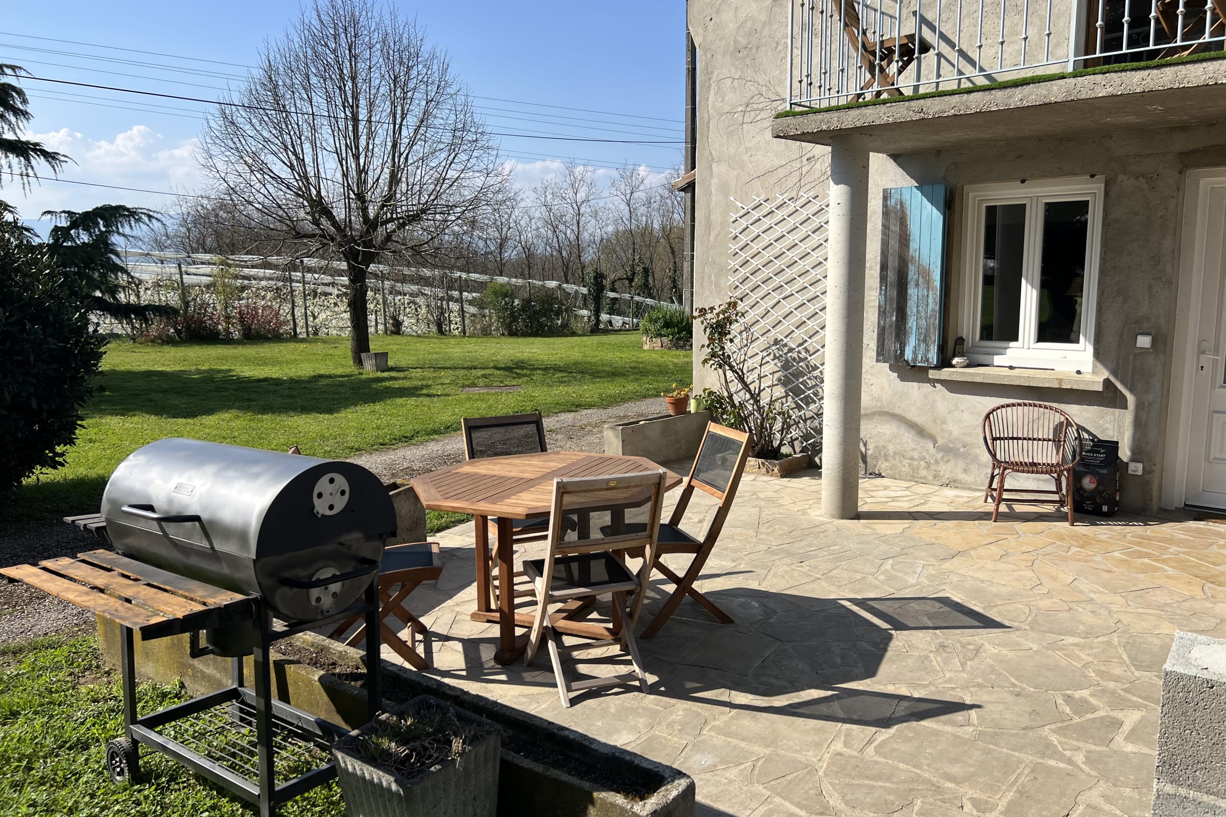 Upstairs, you’ll find a cozy, fully equipped kitchen that opens onto the dining room. You’ll also enjoy a pleasant terrace offering unobstructed views of the Pilat and the surrounding orchards—the perfect spot to relax and soak up the sun while enjoying breakfast or a gourmet snack surrounded by nature.