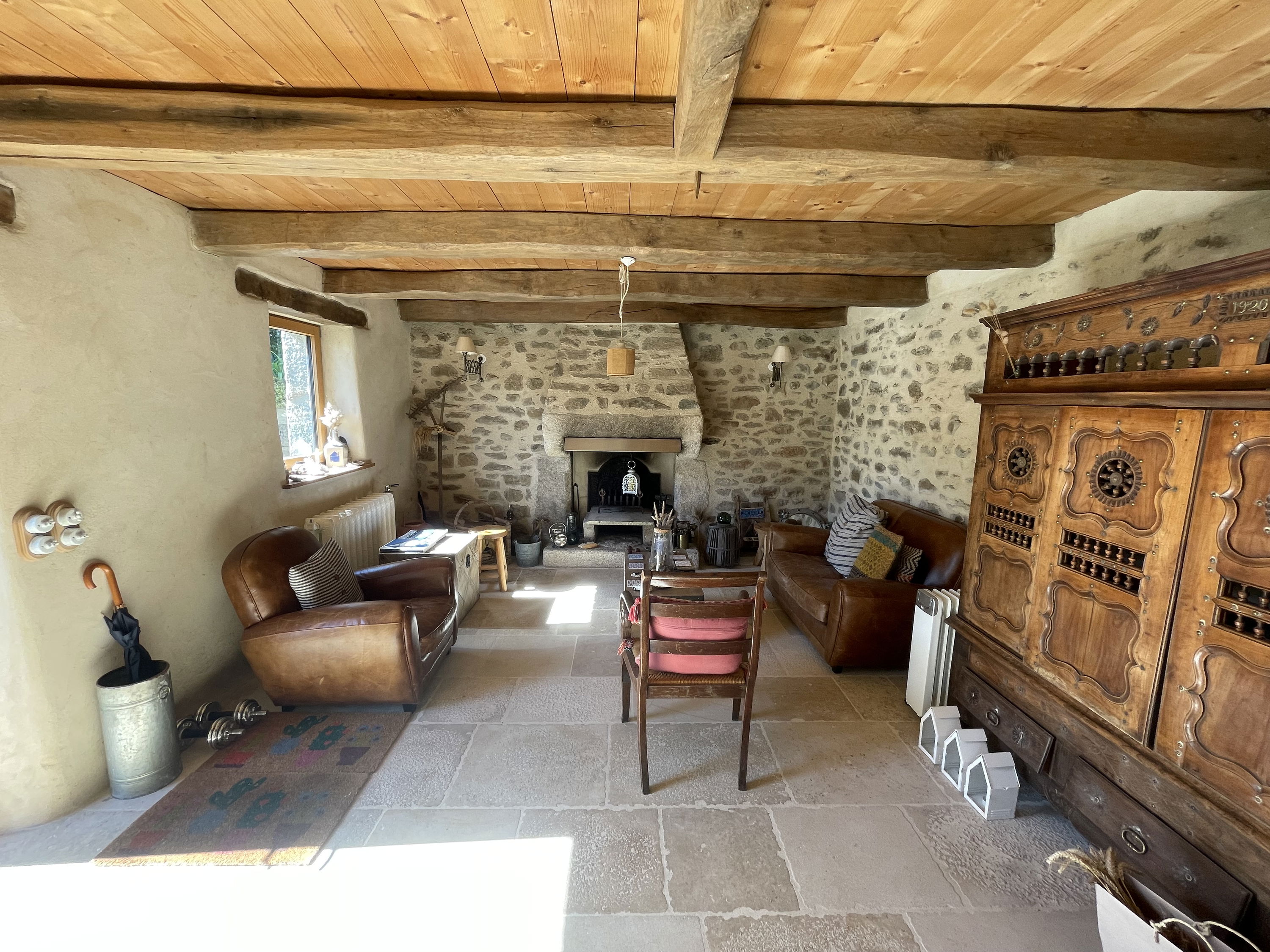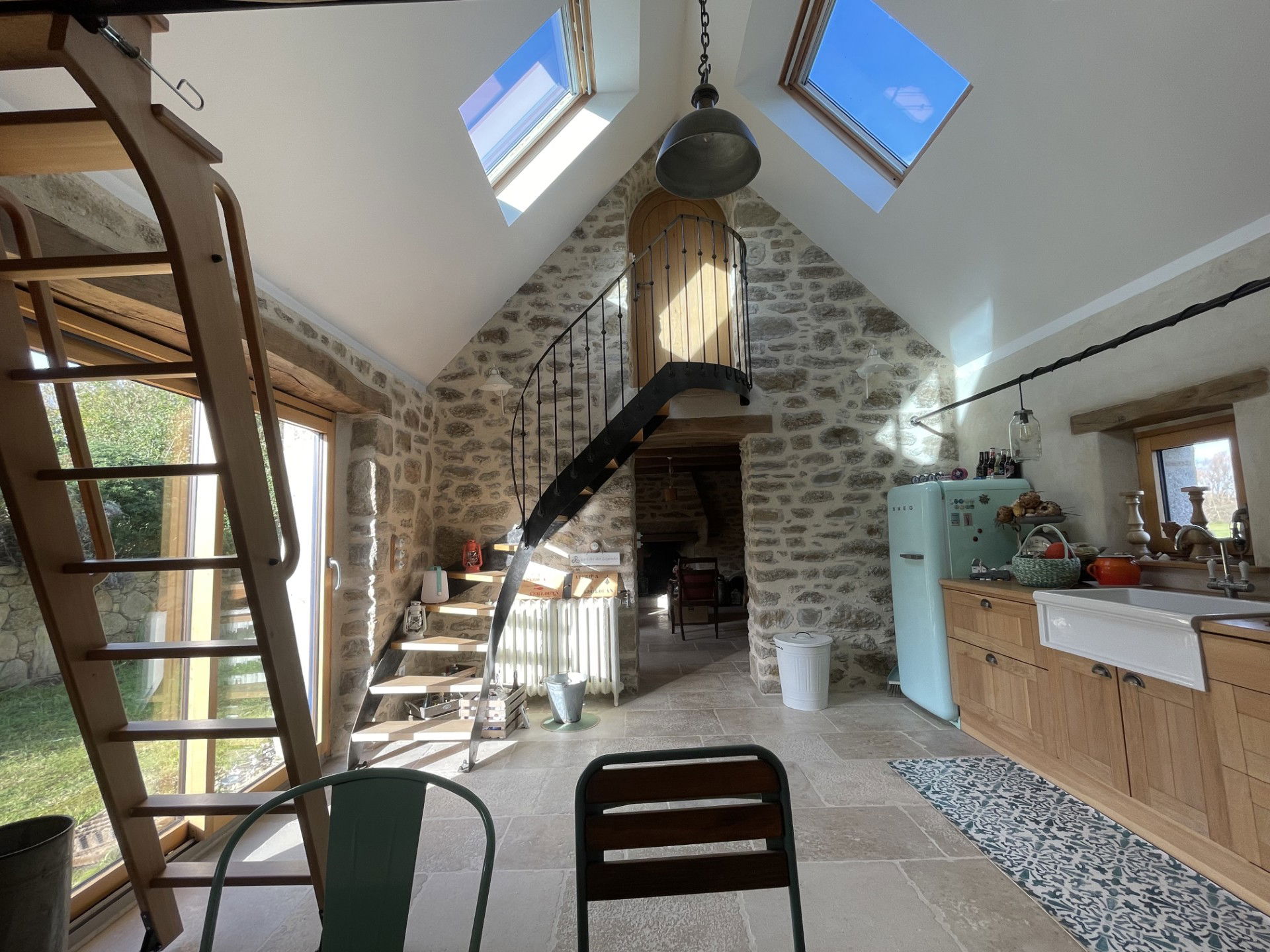 • A large, comfortable, and bright open-plan living area (lounge & kitchen), a mix of raw materials, vintage furniture, and found objects. A wood-burning stove for relaxing by the fire and a bread oven on the terrace.