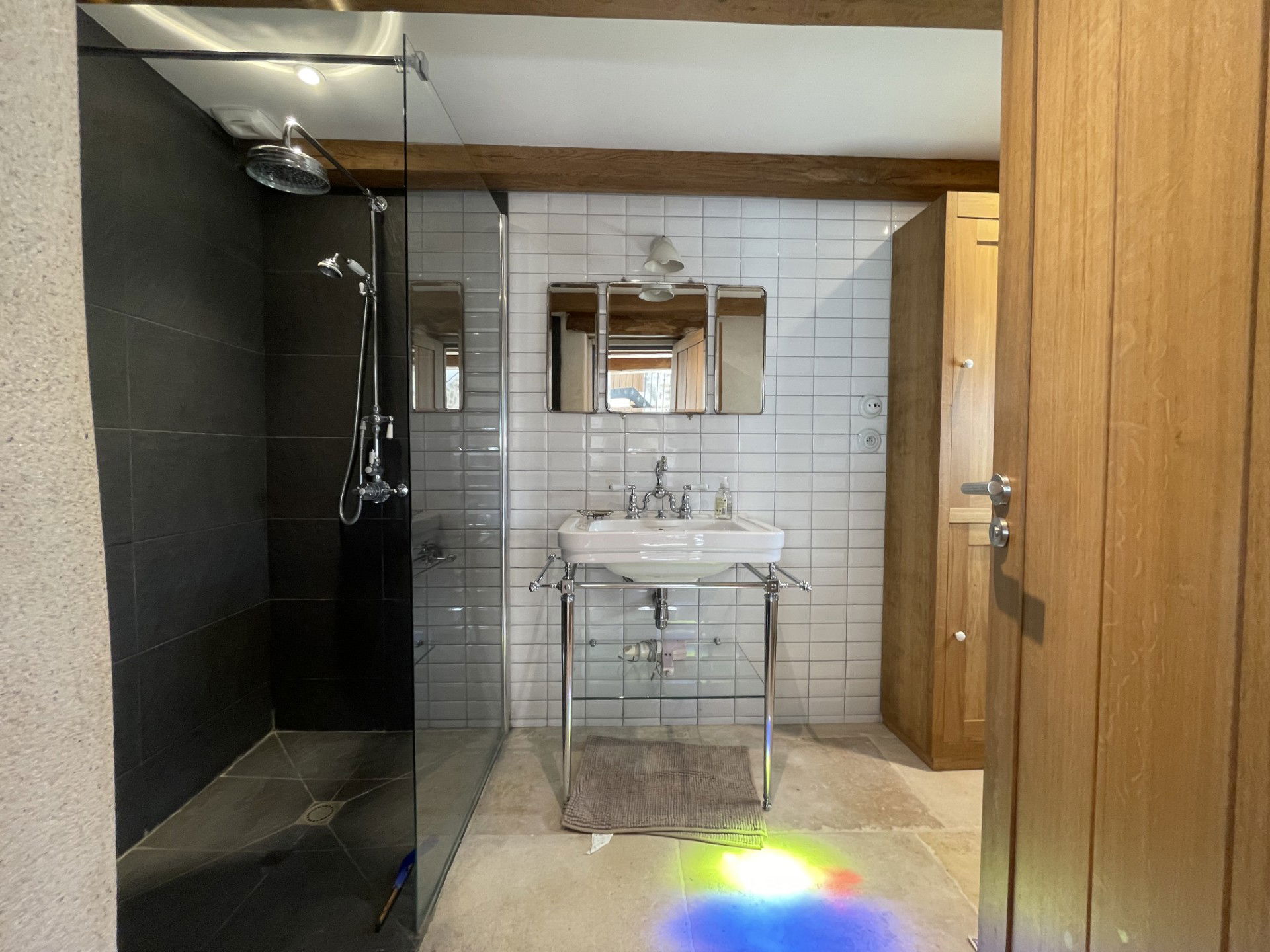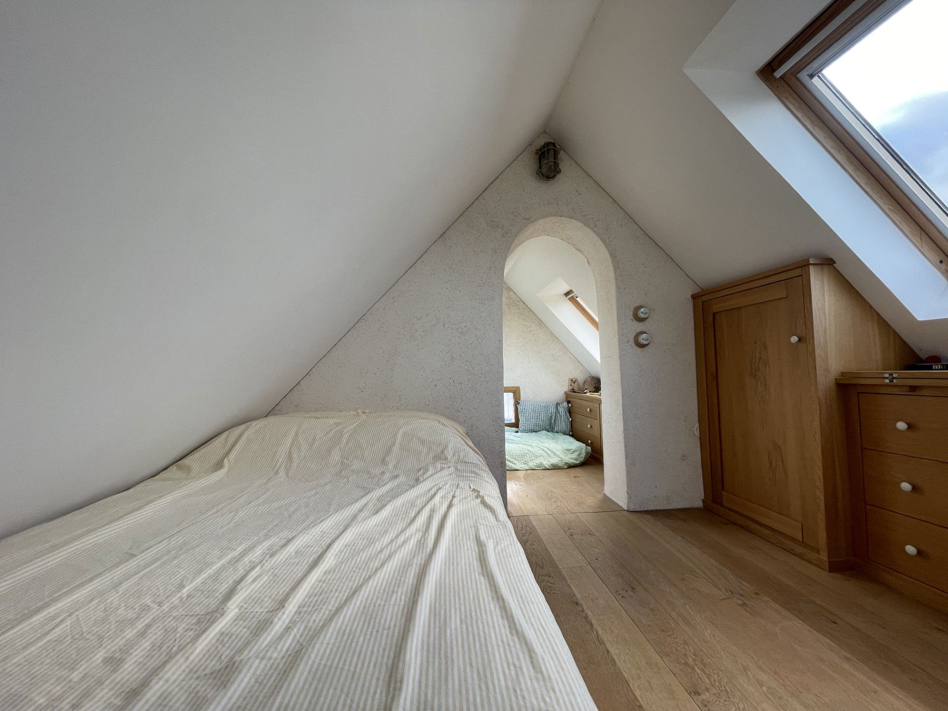 • 3 unique bedrooms: each is tastefully decorated. Very comfortable bedding includes two double beds and one single bed suitable for a child or young teenager. The bedrooms are located upstairs, accessible by stairs or, in the case of the mezzanine, by a sliding ladder reminiscent of those found in old libraries. The mezzanine comprises two sleeping areas. The bedroom includes a dressing room, a retractable shelf that can be used as a desk, and a double bed. Adjoining it is a smaller bedroom where a child or teenager can also sleep, subject to the safety precautions deemed appropriate by their parents.
