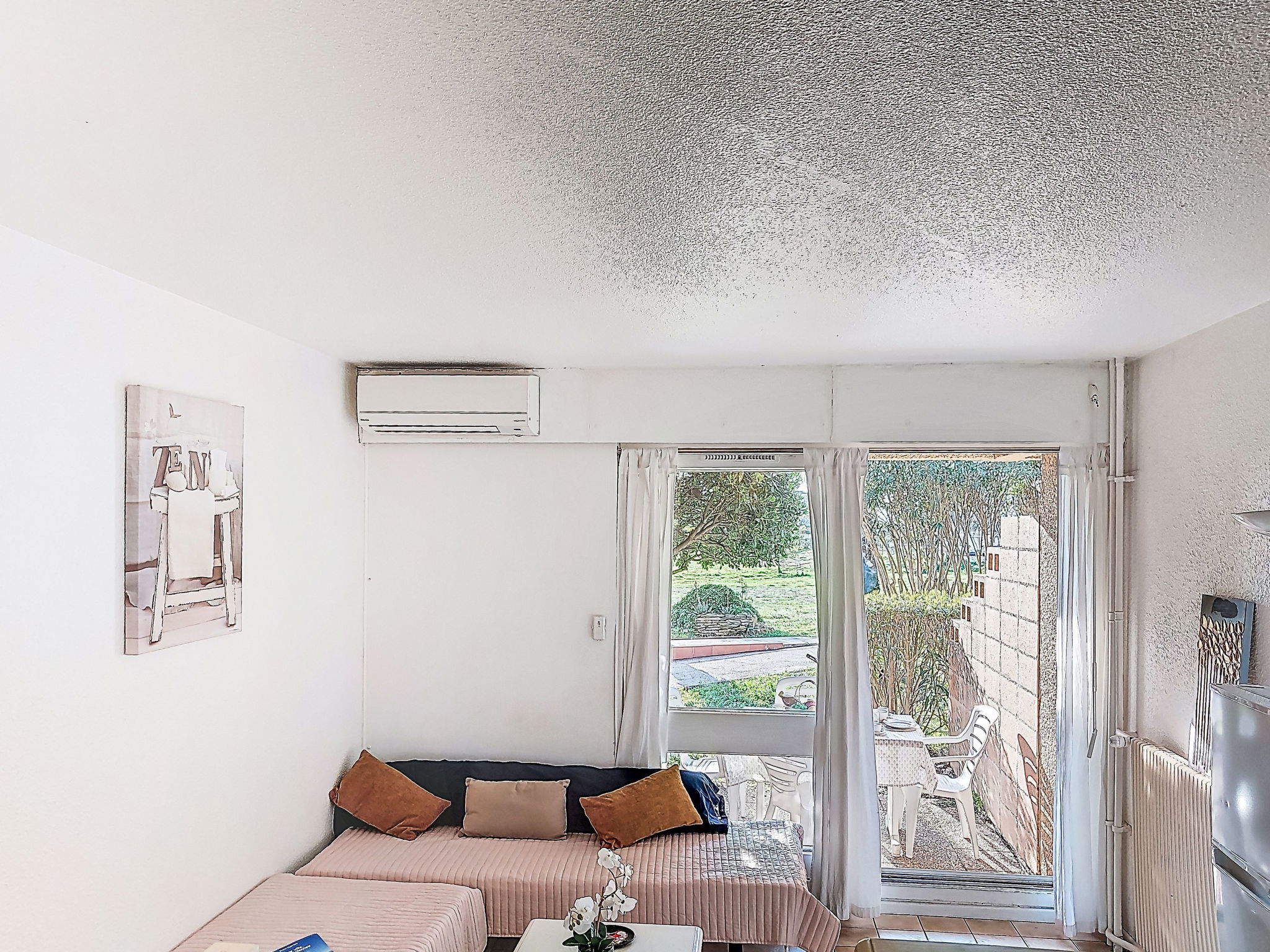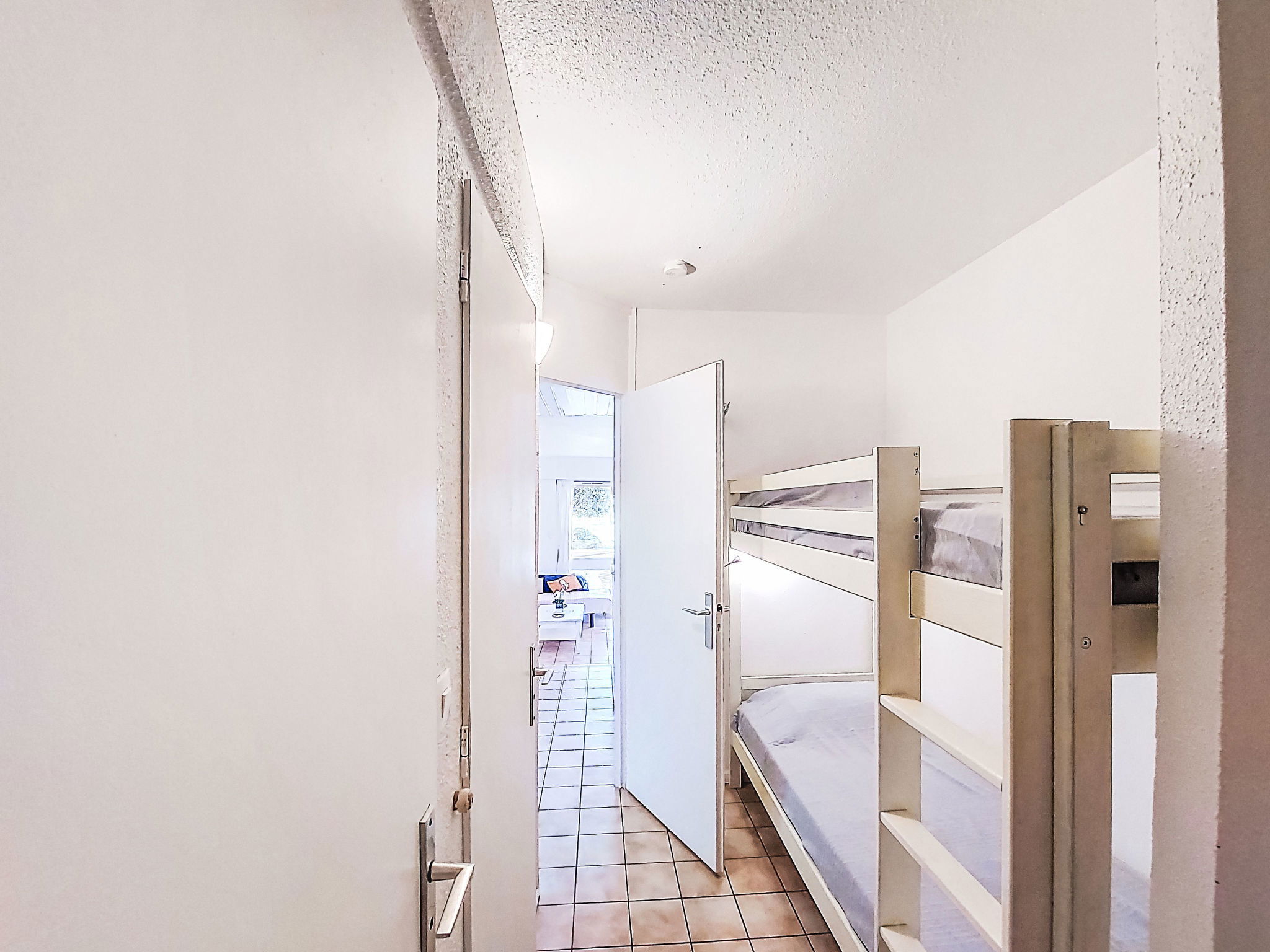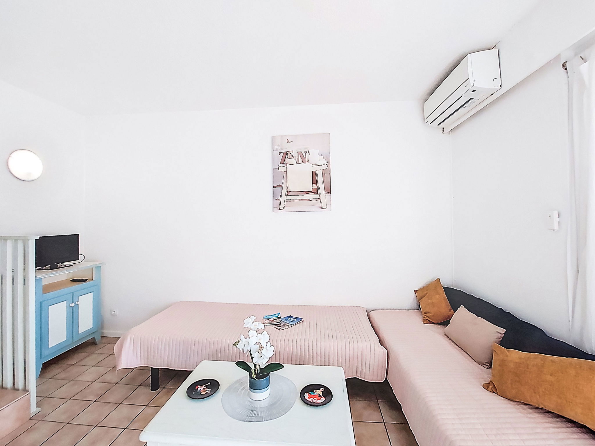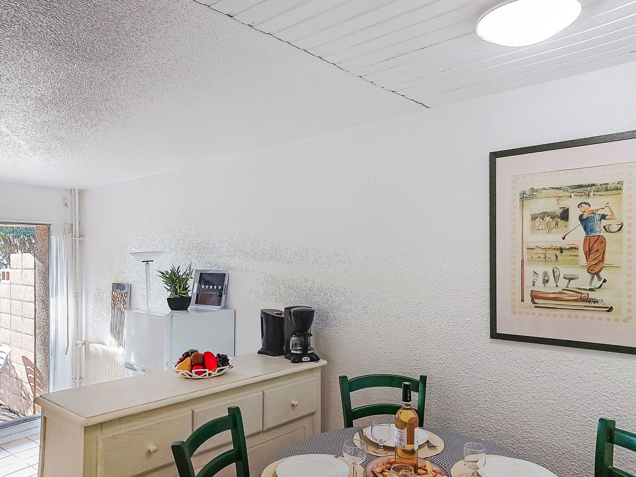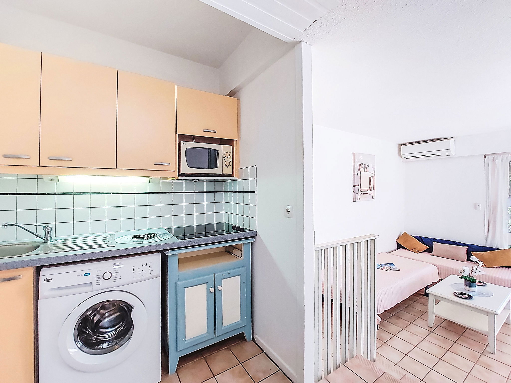 1-room studio 28 m2, on the ground floor. Simple furnishings: entrance hall with 1 x 2 bunk beds (80 cm, length 190 cm). Living/dining room with 2 beds (80 cm, length 190 cm), TV (flat screen), air conditioning. Exit to the terrace. Kitchenette (3 ceramic glass hob hotplates, toaster, kettle, microwave, freezer, electric coffee machine). Bathroom, sep. WC. Heating. Terrace 10 m2, north-west facing position. Terrace furniture. View of the garden and golf course. Facilities: washing machine. Internet (WiFi, extra). Please note: non-smokers only. Maximum 1 small pet/ dog allowed. Smoke alarm. Offer by a private individual according to Art. 155, IV of CGI.