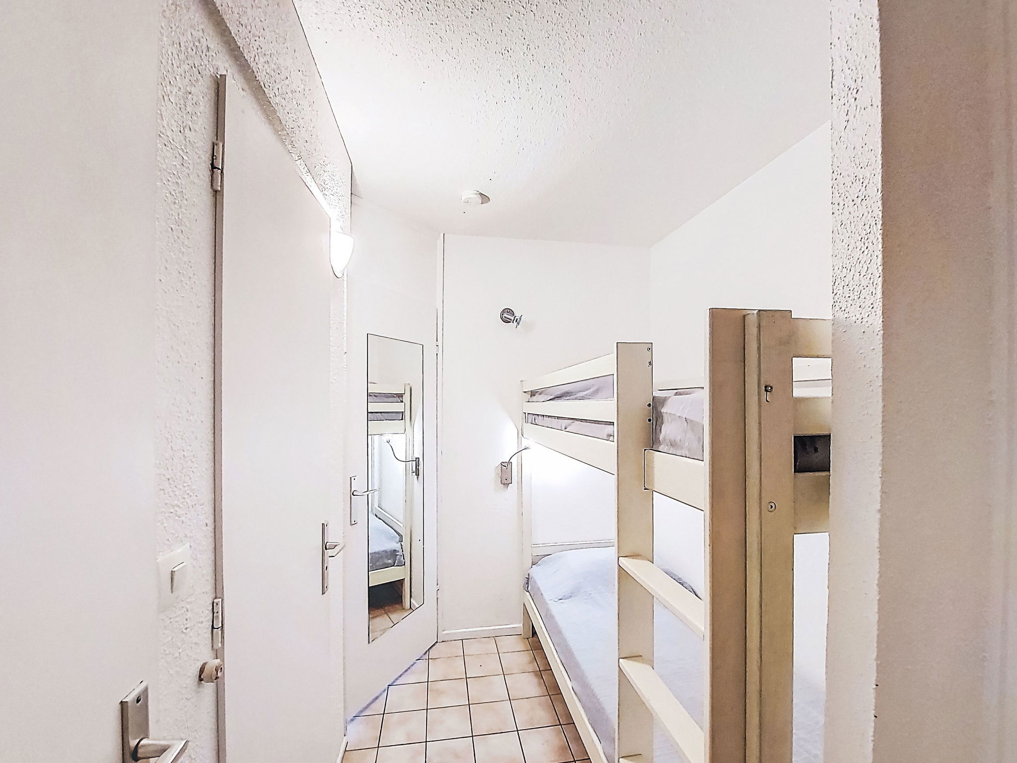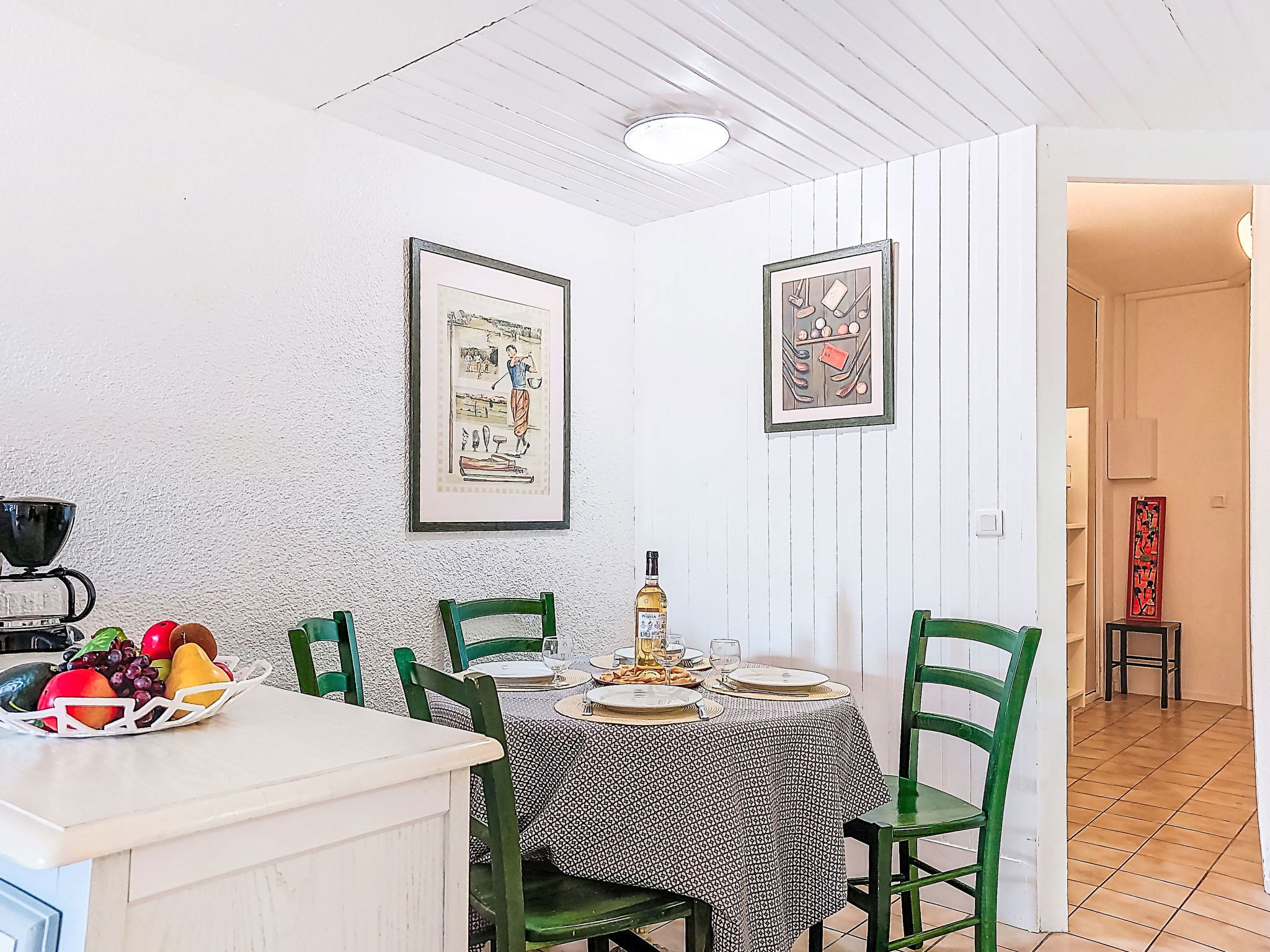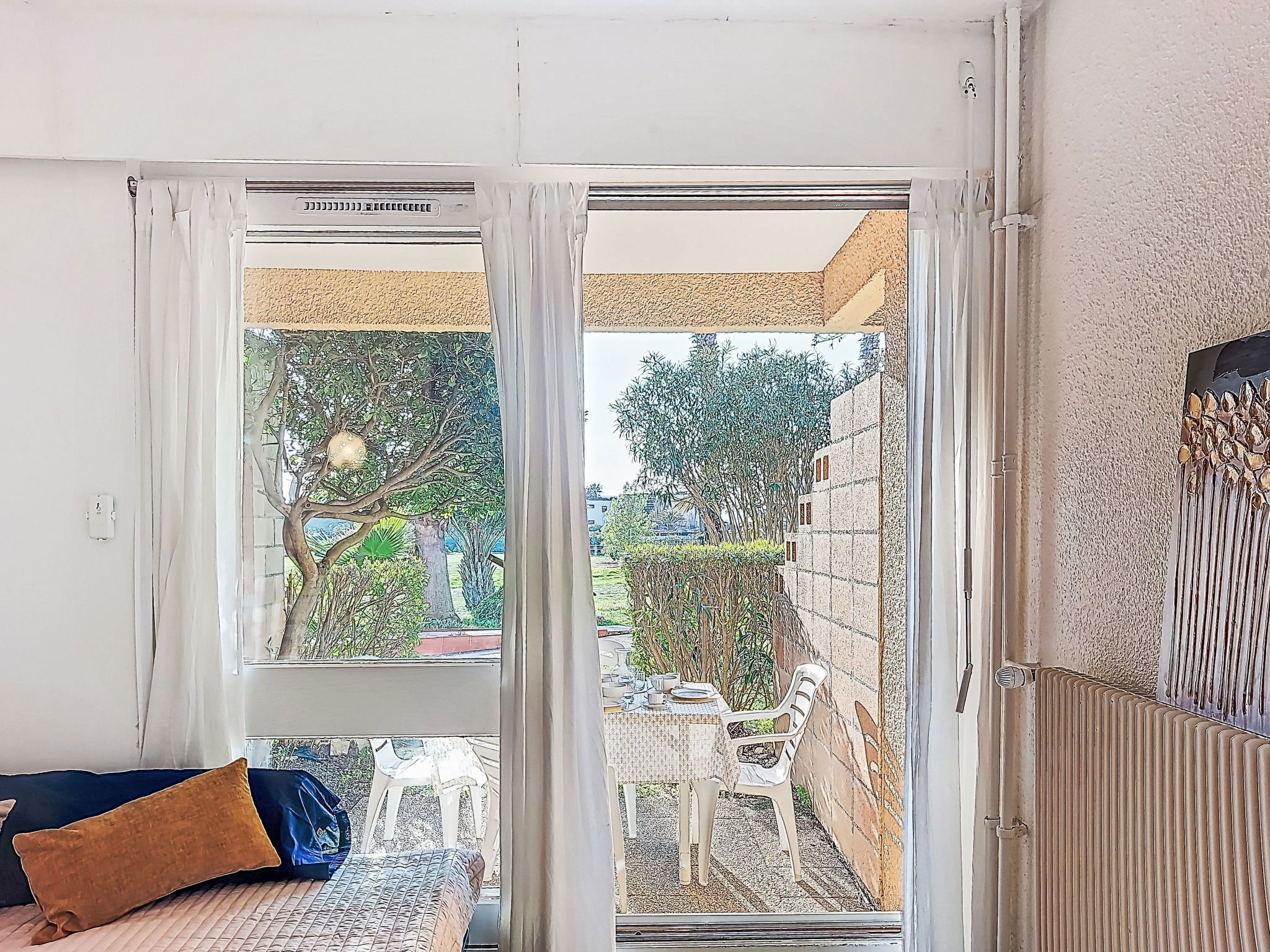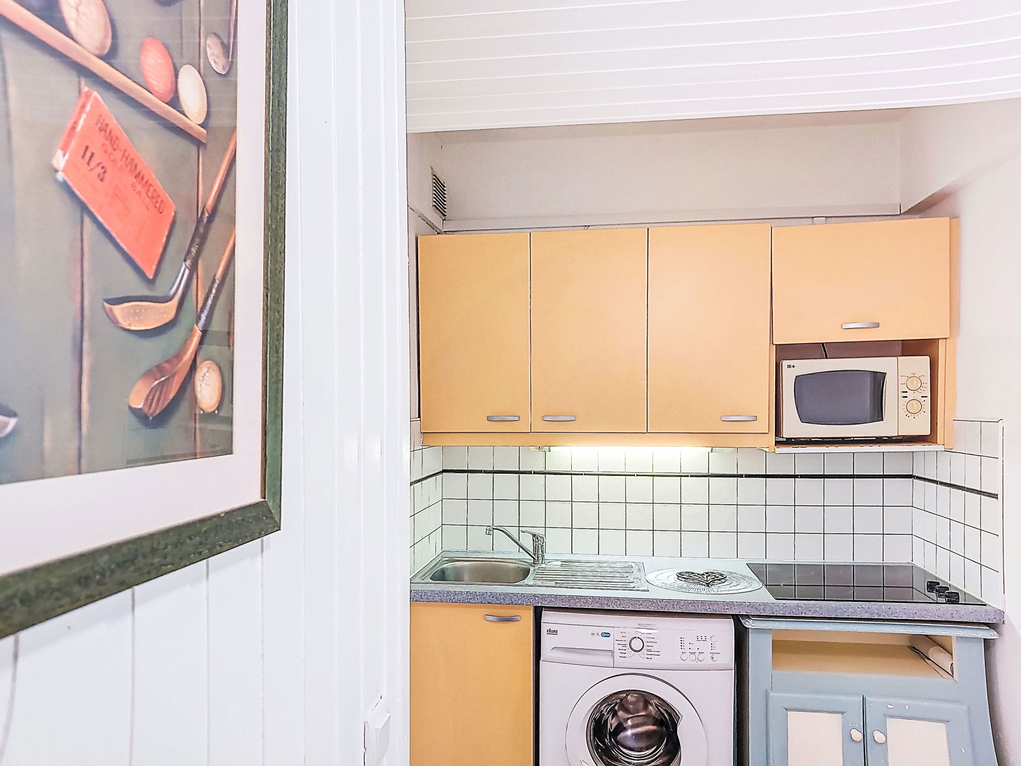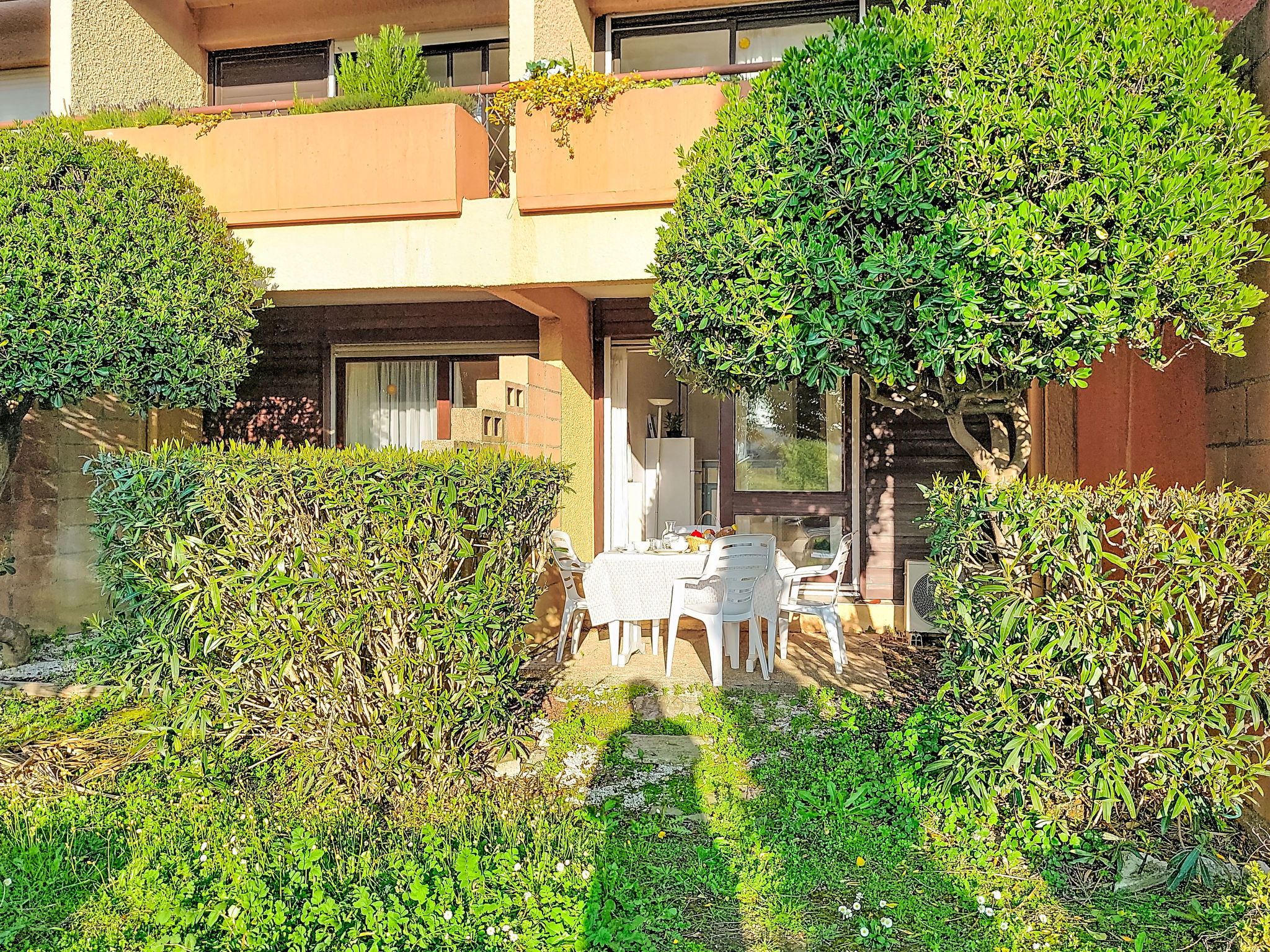 1-room studio 28 m2, on the ground floor. Simple furnishings: entrance hall with 1 x 2 bunk beds (80 cm, length 190 cm). Living/dining room with 2 beds (80 cm, length 190 cm), TV (flat screen), air conditioning. Exit to the terrace. Kitchenette (3 ceramic glass hob hotplates, toaster, kettle, microwave, freezer, electric coffee machine). Bathroom, sep. WC. Heating. Terrace 10 m2, north-west facing position. Terrace furniture. View of the garden and golf course. Facilities: washing machine. Internet (WiFi, extra). Please note: non-smokers only. Maximum 1 small pet/ dog allowed. Smoke alarm. Offer by a private individual according to Art. 155, IV of CGI.