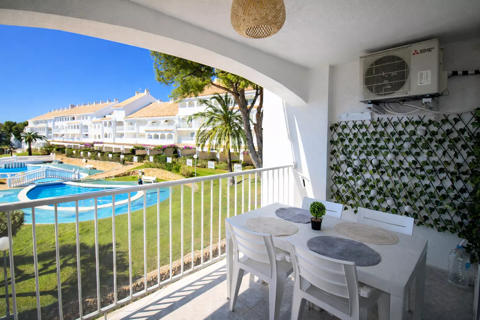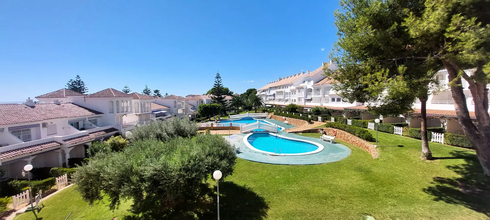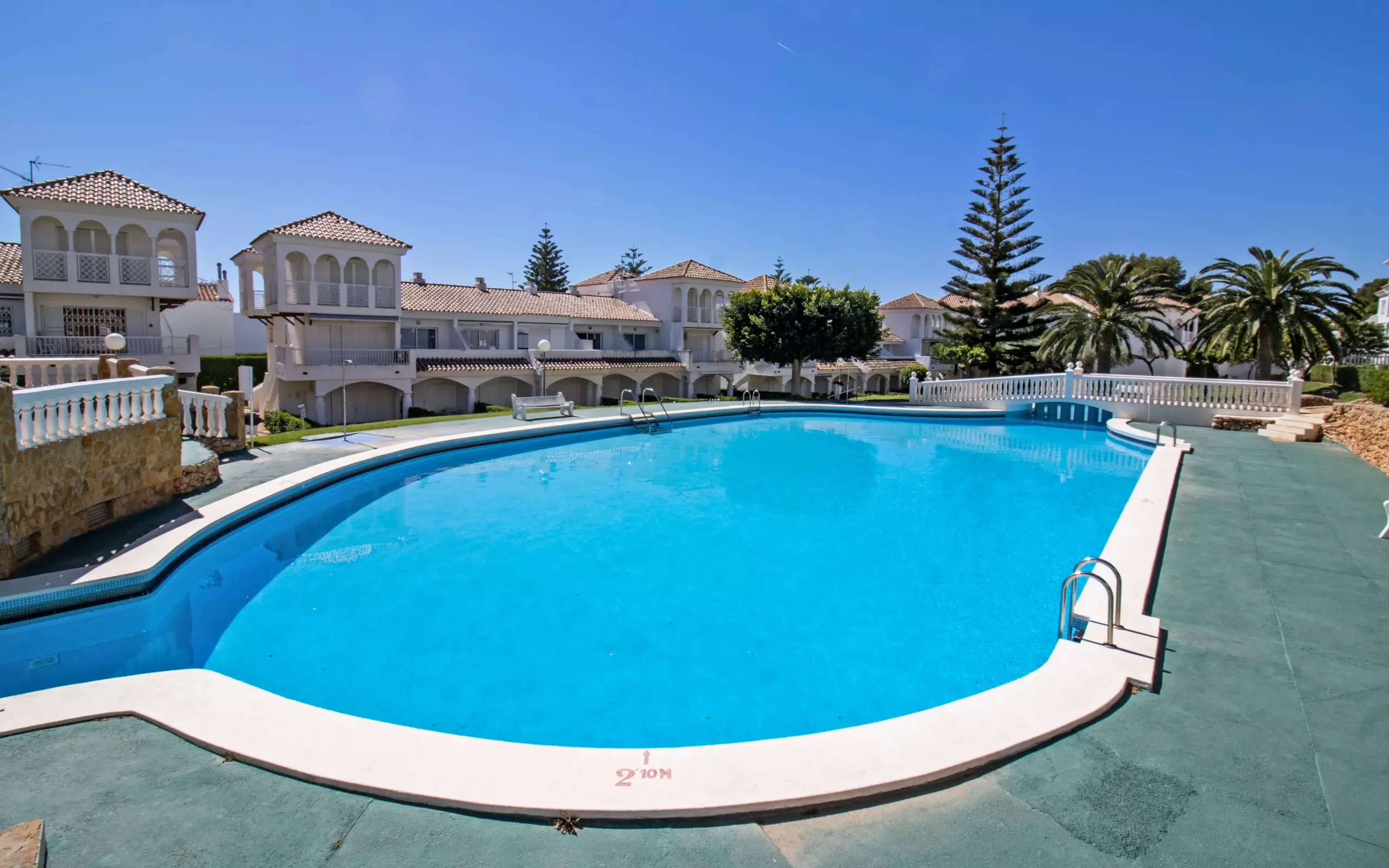 It has a washing machine, heat pump heating, air conditioning in the living room, communal swimming pool + children's pool, 1 fan, 1 television.