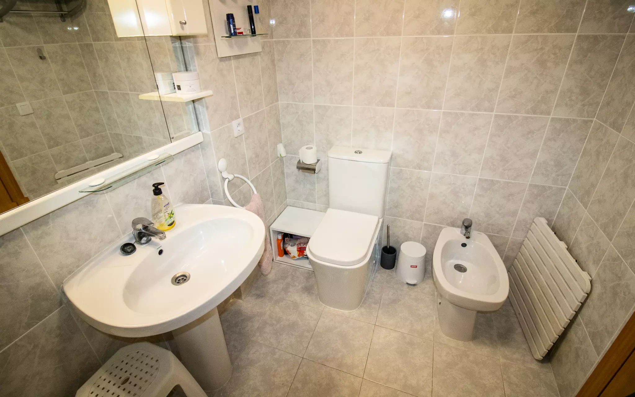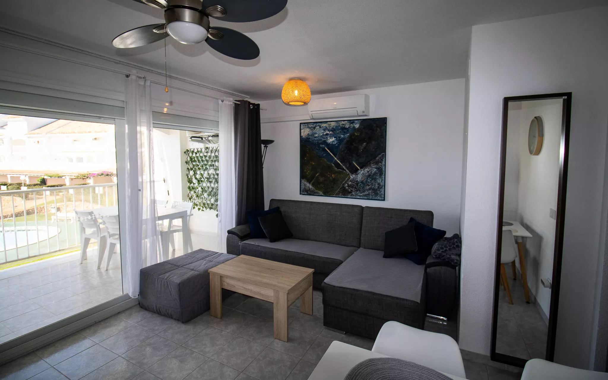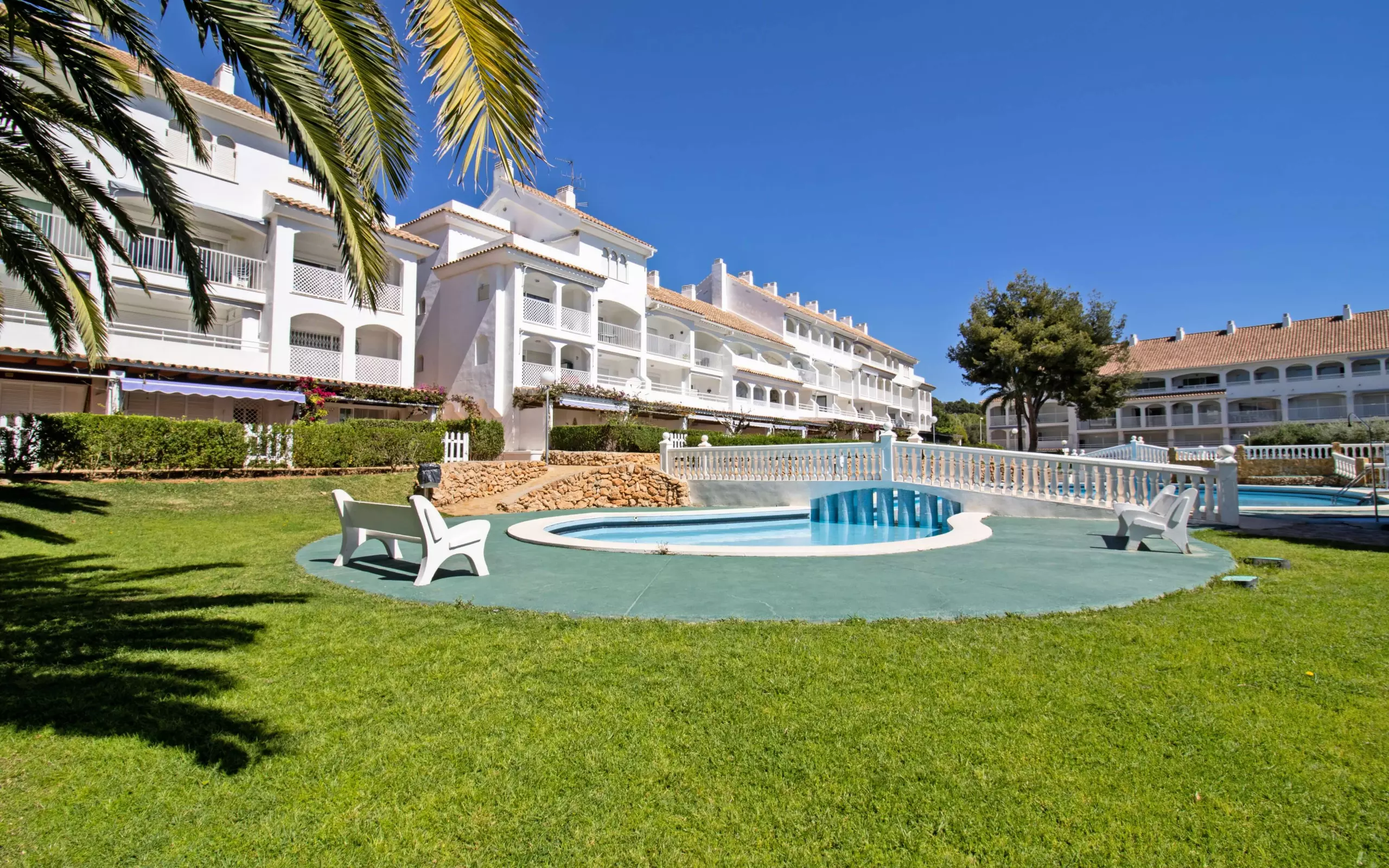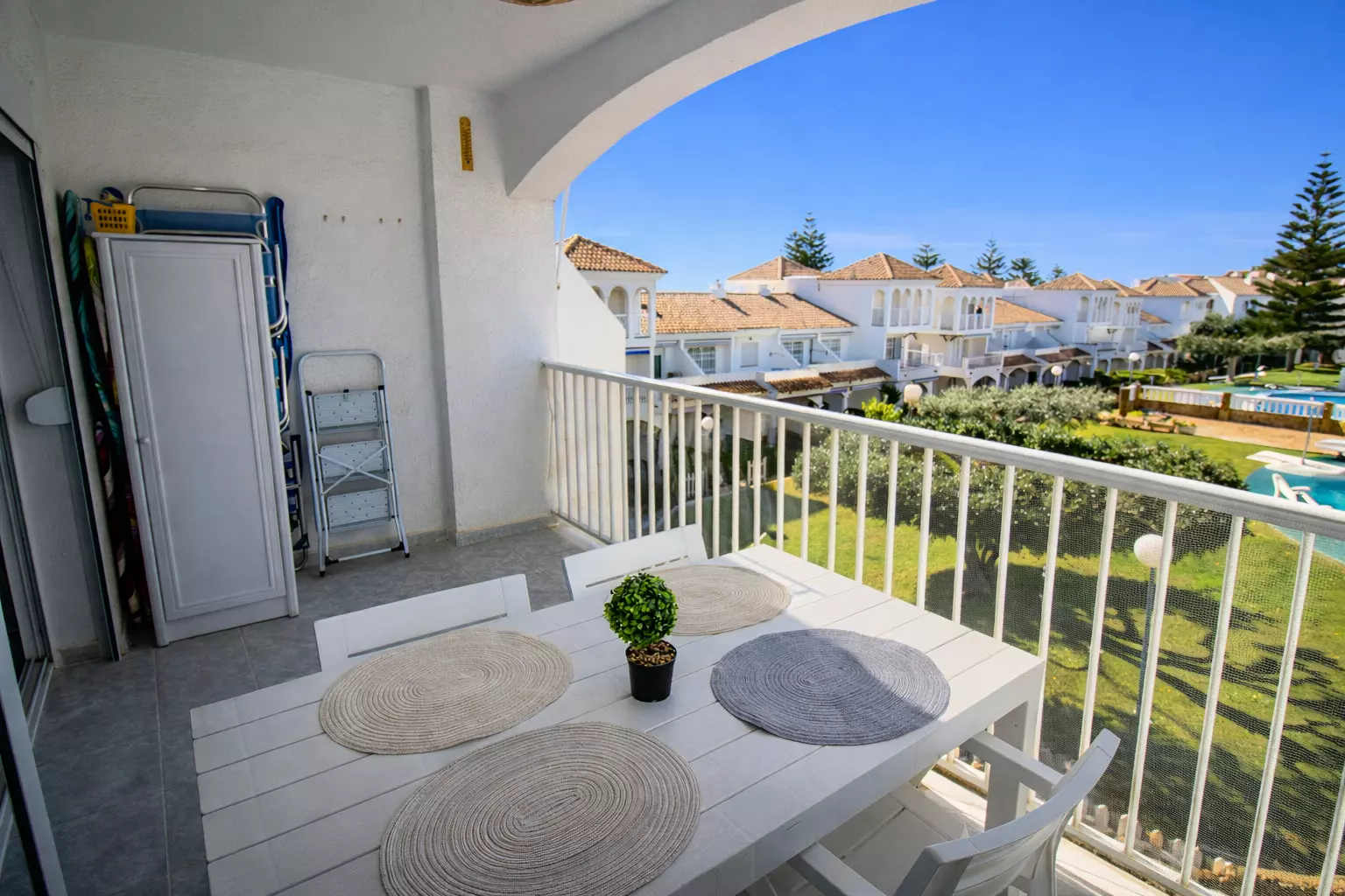 It has a washing machine, heat pump heating, air conditioning in the living room, communal swimming pool + children's pool, 1 fan, 1 television.