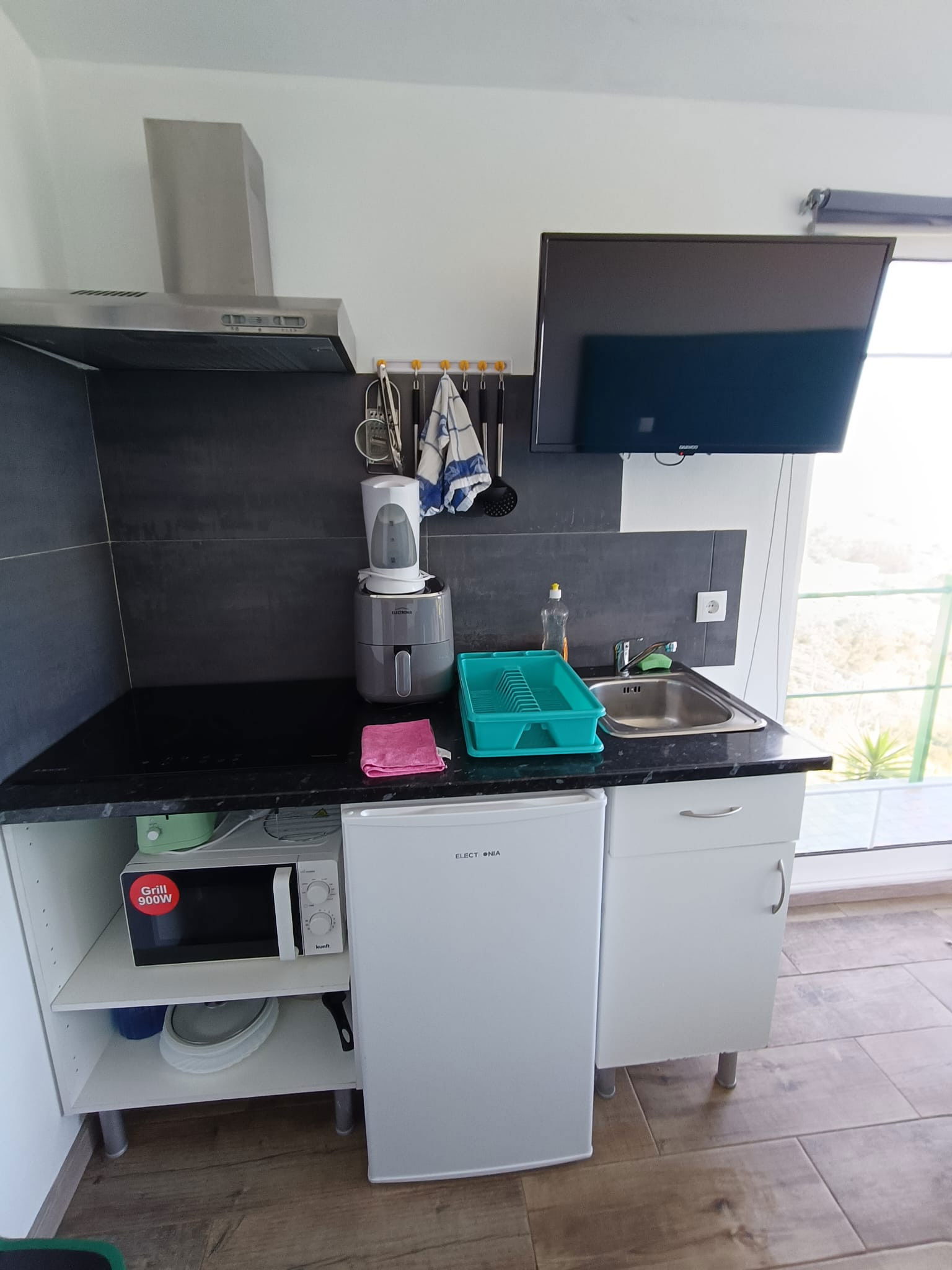 The open plan kitchen, of induction, is equipped with refrigerator, microwave, freezer, dishes/cutlery, kitchen utensils, toaster and kettle.