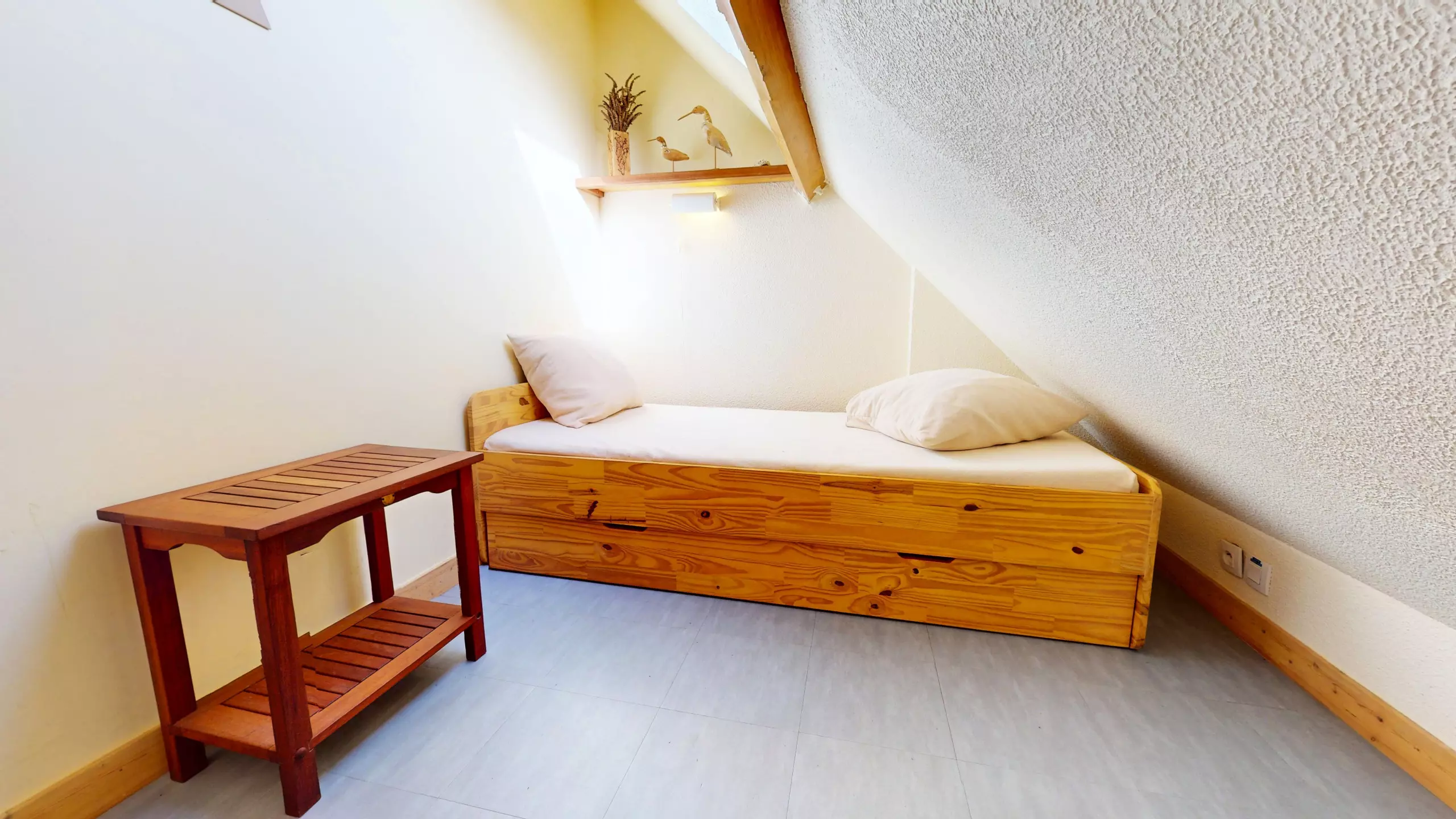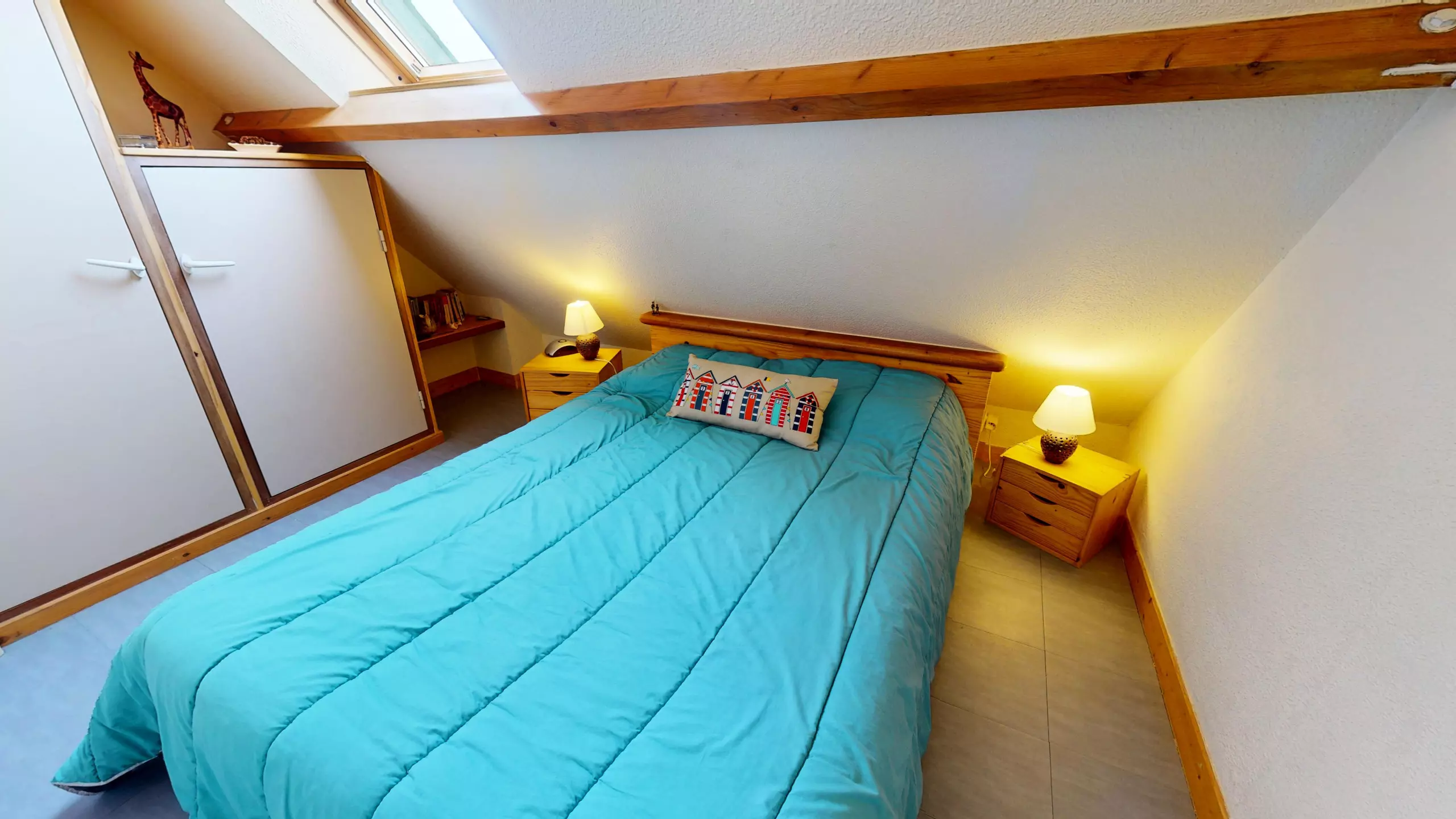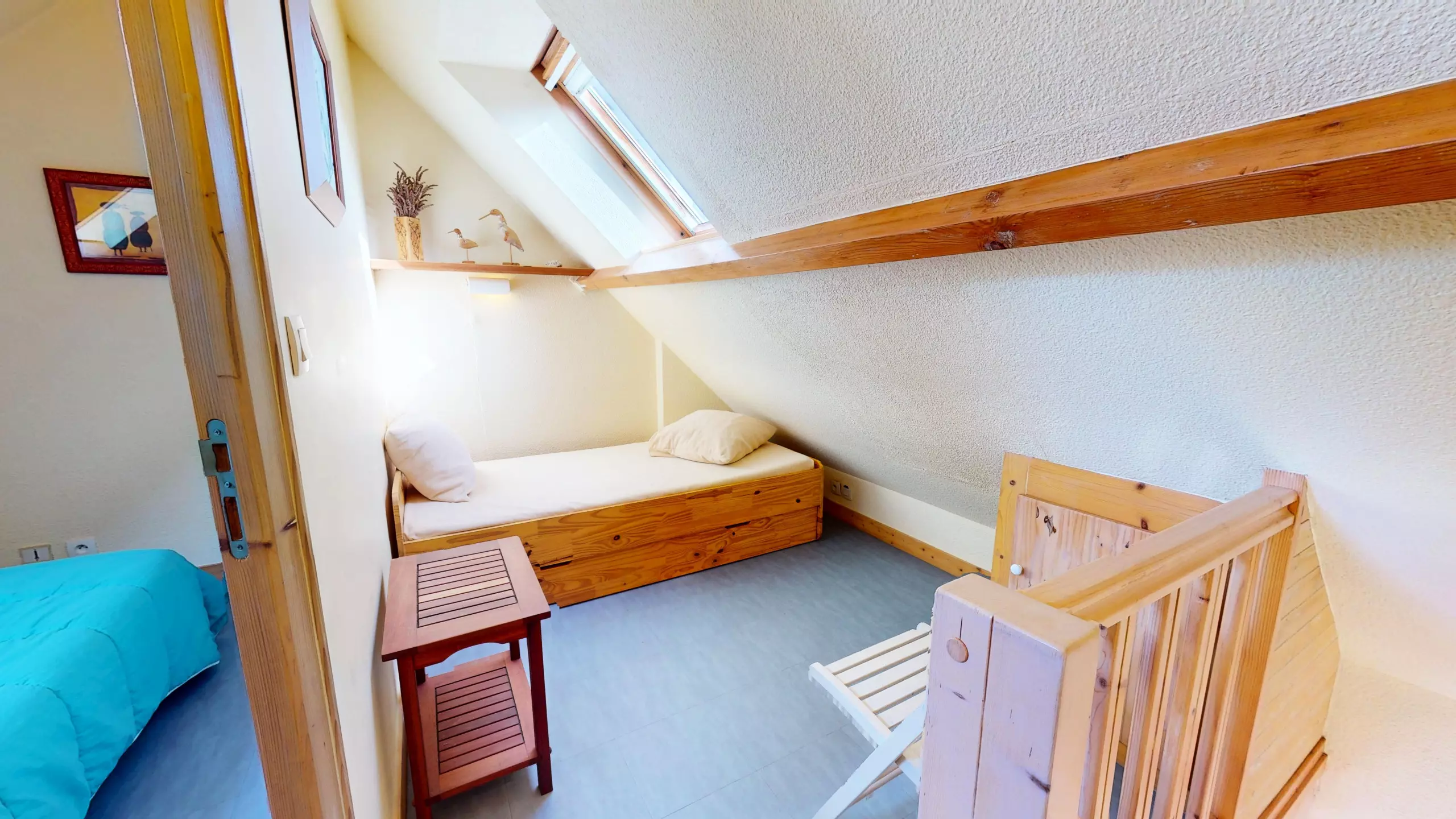 Upstairs sleeping area: For more privacy, the upper floor is dedicated to rest with a bedroom featuring a double bed (140x190) and an adjoining mezzanine with a single bed (90x190).