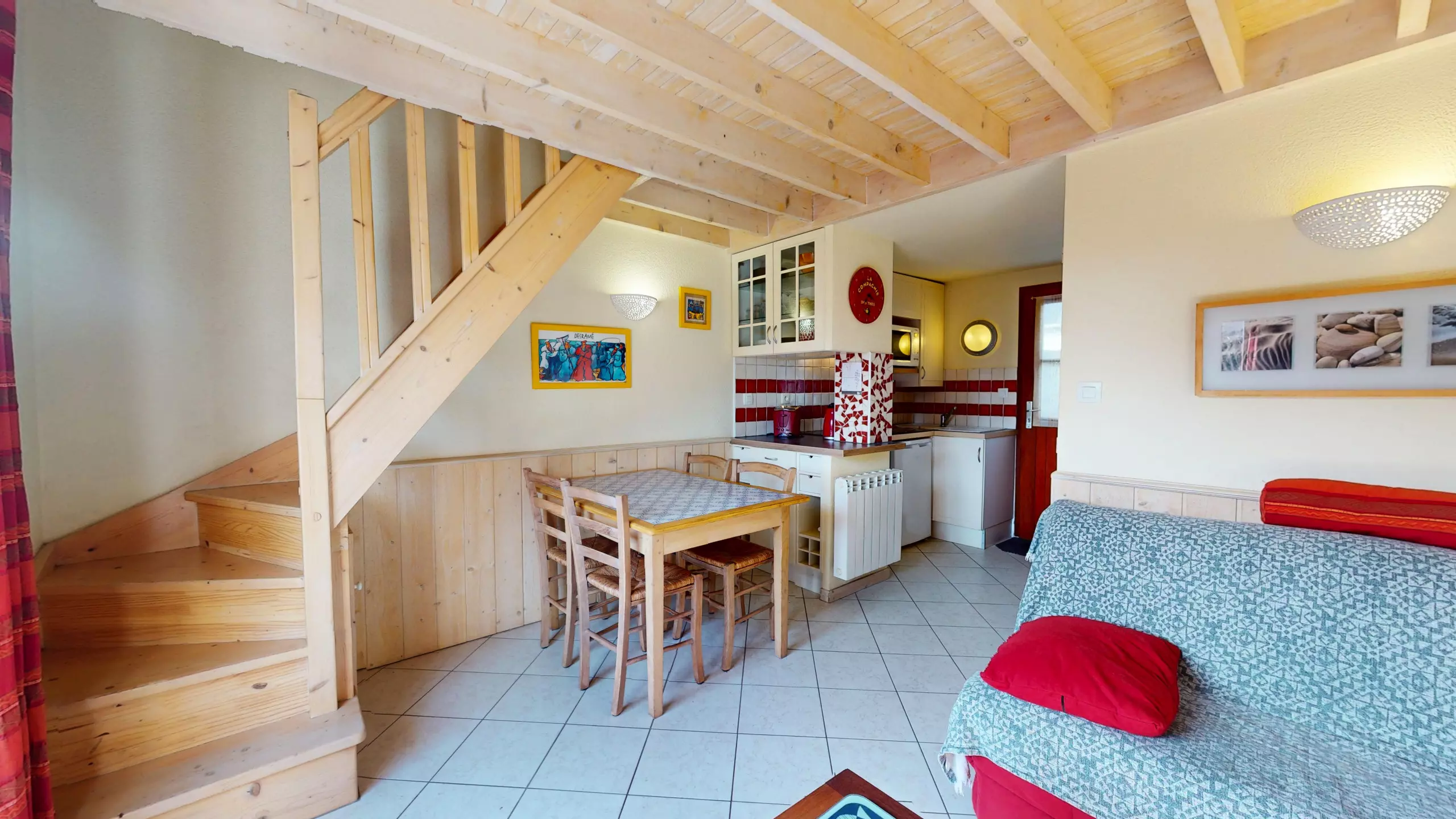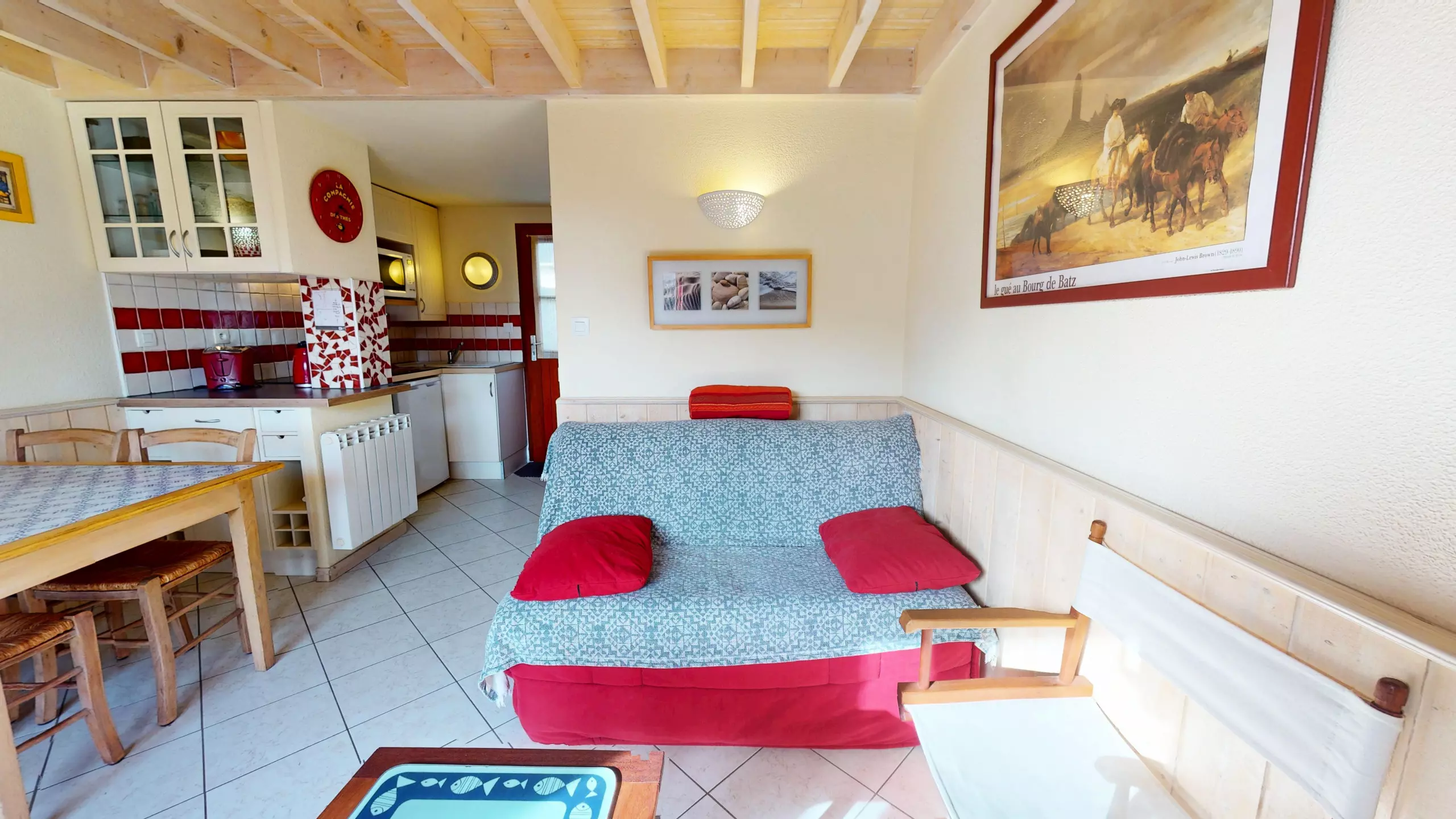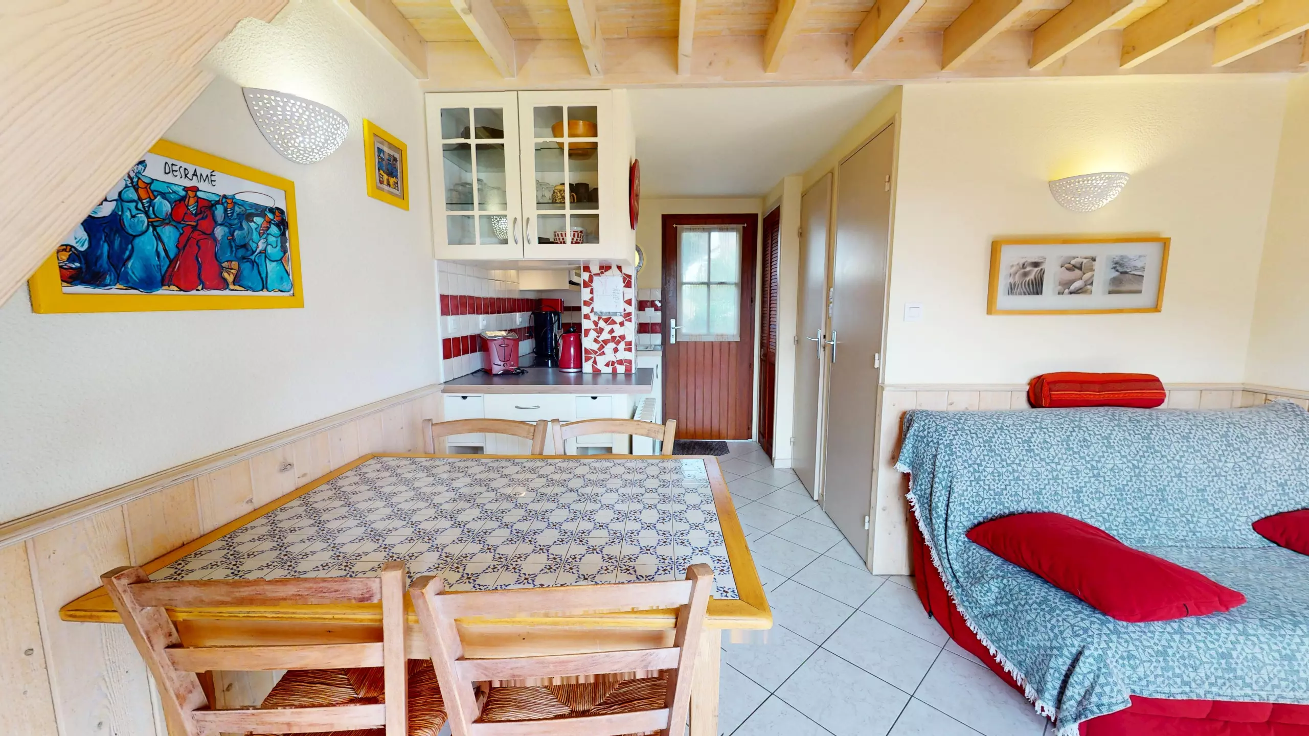 Upon entering, you'll discover a bright and welcoming living space. The living room, equipped with a television and a double sofa bed (140x190), invites you to relax after a day at the beach. The dining area features a lovely dining table, adjacent to a charming and functional open-plan kitchen, fully equipped with everything you need and induction hobs for preparing your holiday meals.
