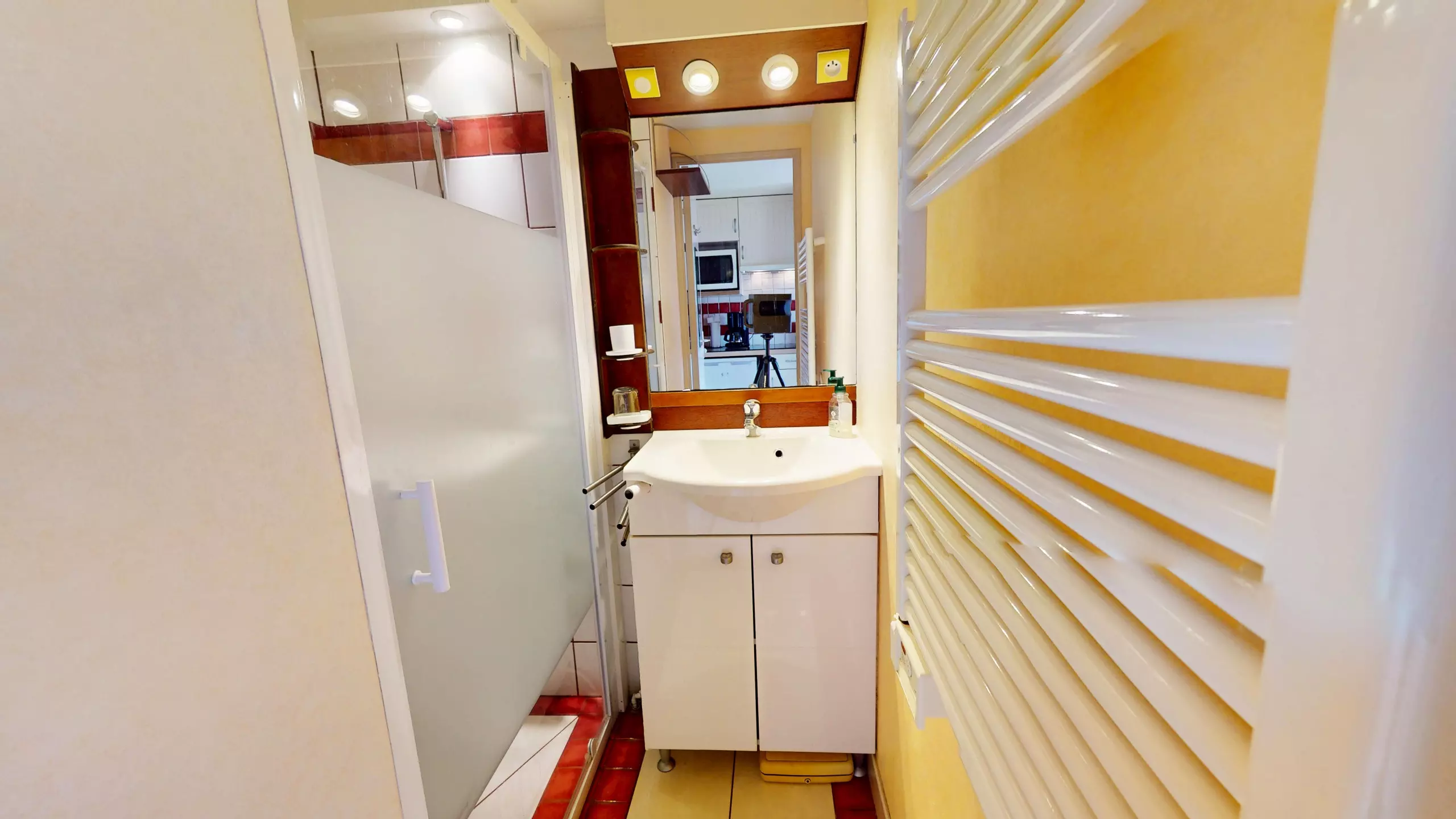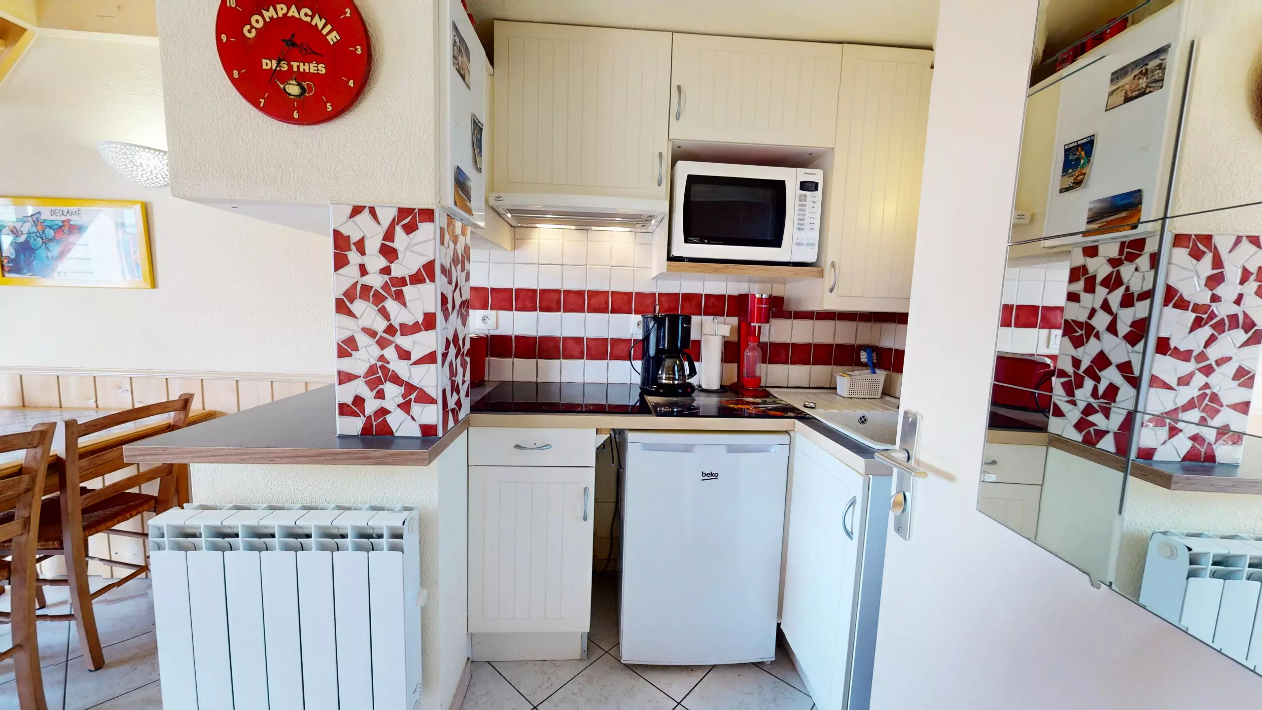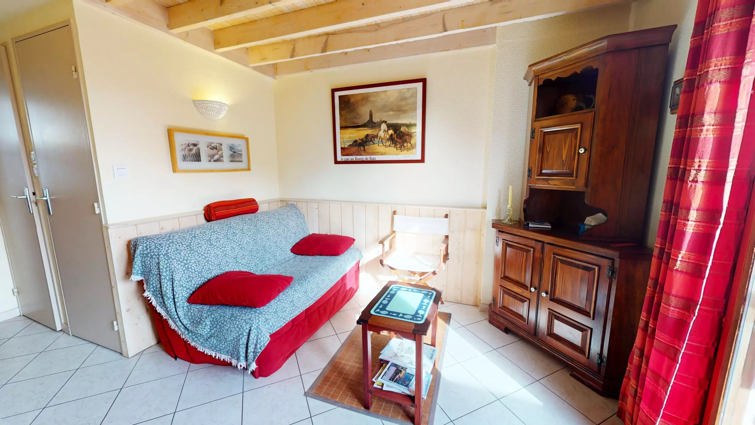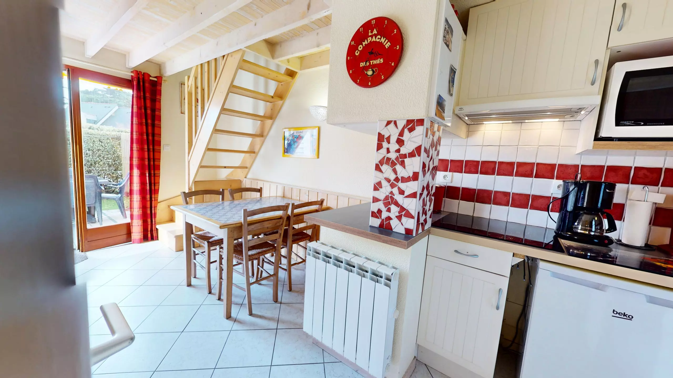 Upon entering, you'll discover a bright and welcoming living space. The living room, equipped with a television and a double sofa bed (140x190), invites you to relax after a day at the beach. The dining area features a lovely dining table, adjacent to a charming and functional open-plan kitchen, fully equipped with everything you need and induction hobs for preparing your holiday meals.