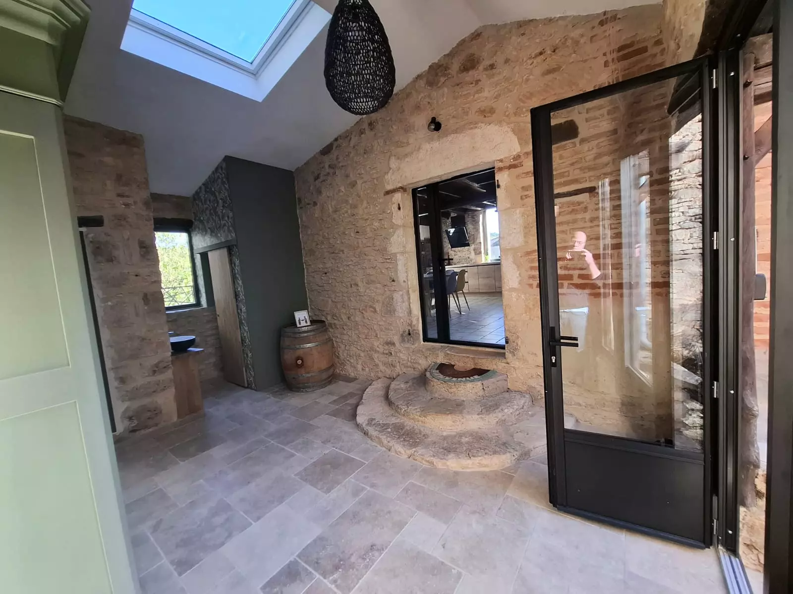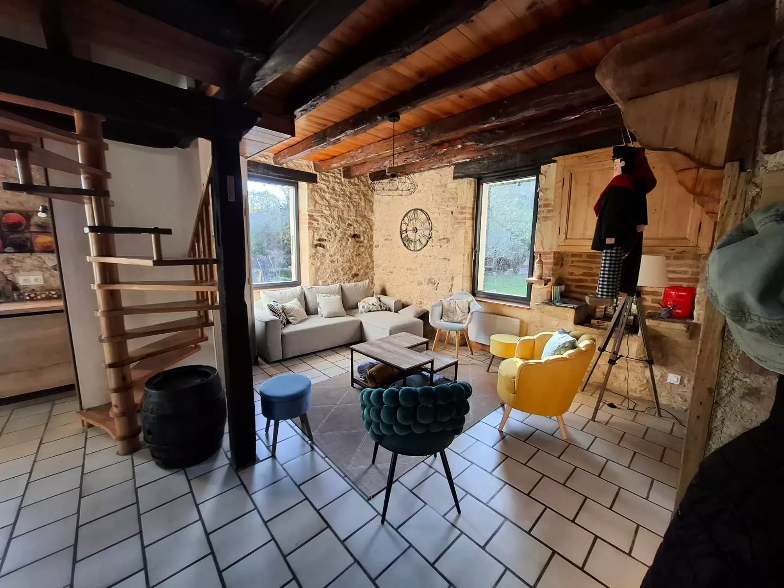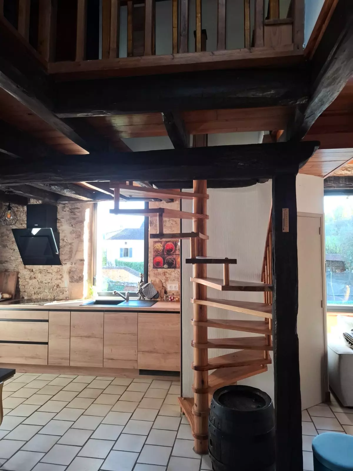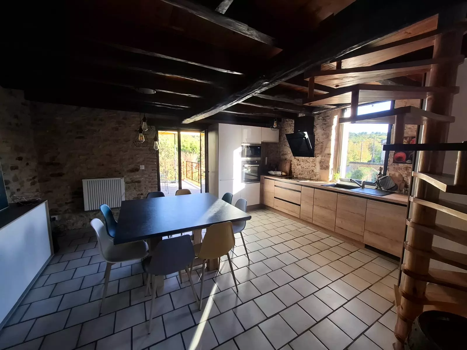 On the ground floor, you'll enjoy a superb, charming living space where stone, wood, and light blend harmoniously. The cozy living room opens onto a large dining room with a beautiful, inviting table, ideal for sharing meals and long, convivial moments. The open-plan kitchen, connected to the living area, is fully equipped with a ceramic hob and everything you need for comfortable everyday cooking. The whole space is very welcoming, both functional and authentic.