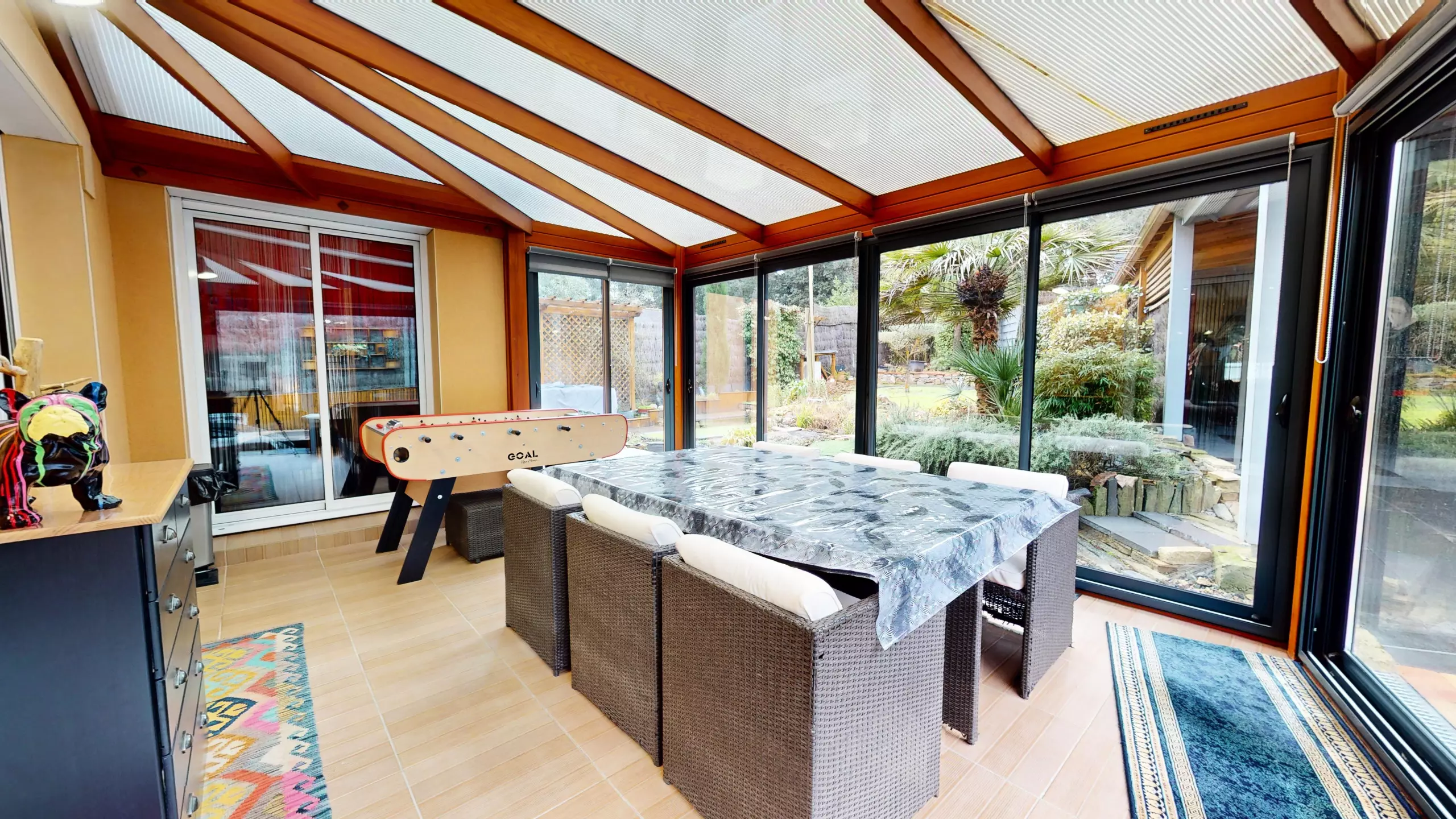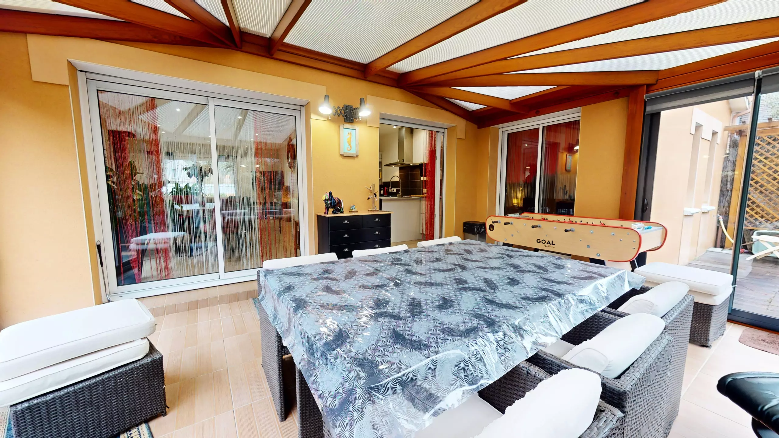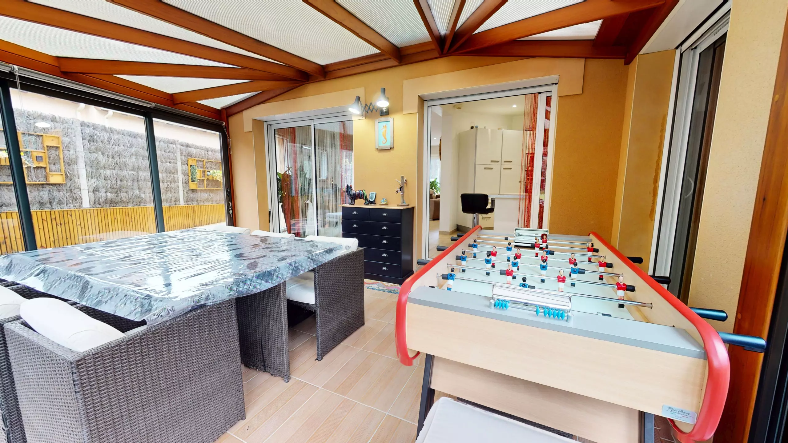 A real asset of the house is its large veranda, furnished with a lounge area and games, perfect for relaxing in any season. You will also find a laundry room with a large freezer, washing machine and dryer, a separate toilet, and a ground-floor bedroom with a queen-size bed, wardrobe, television and en-suite shower room, ideal for added comfort and privacy.