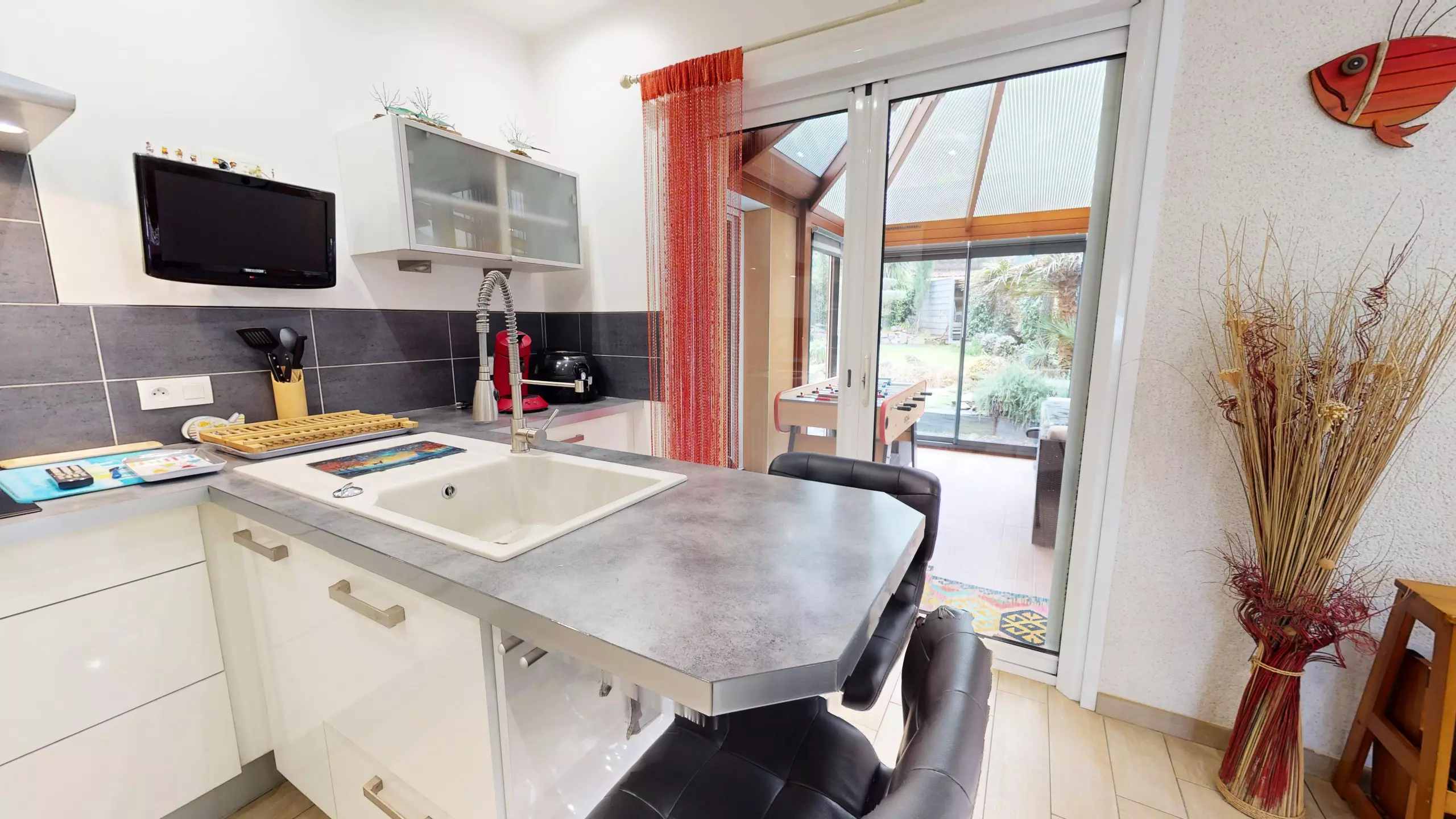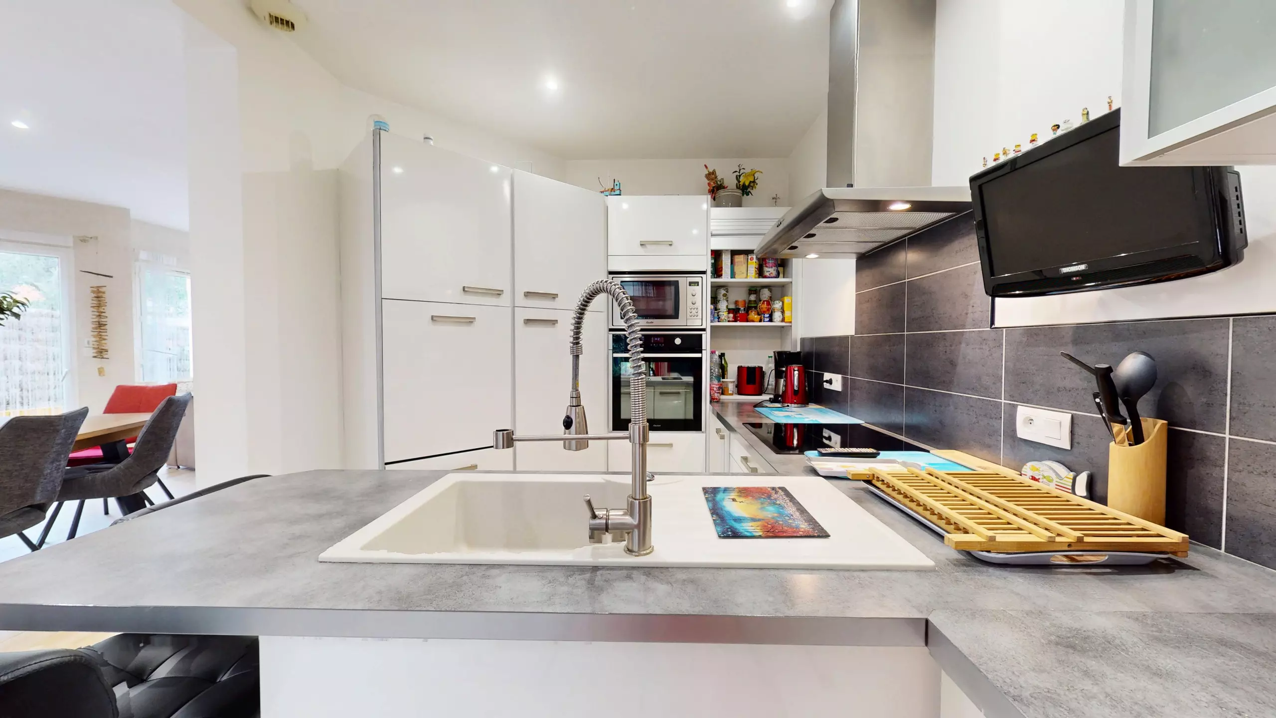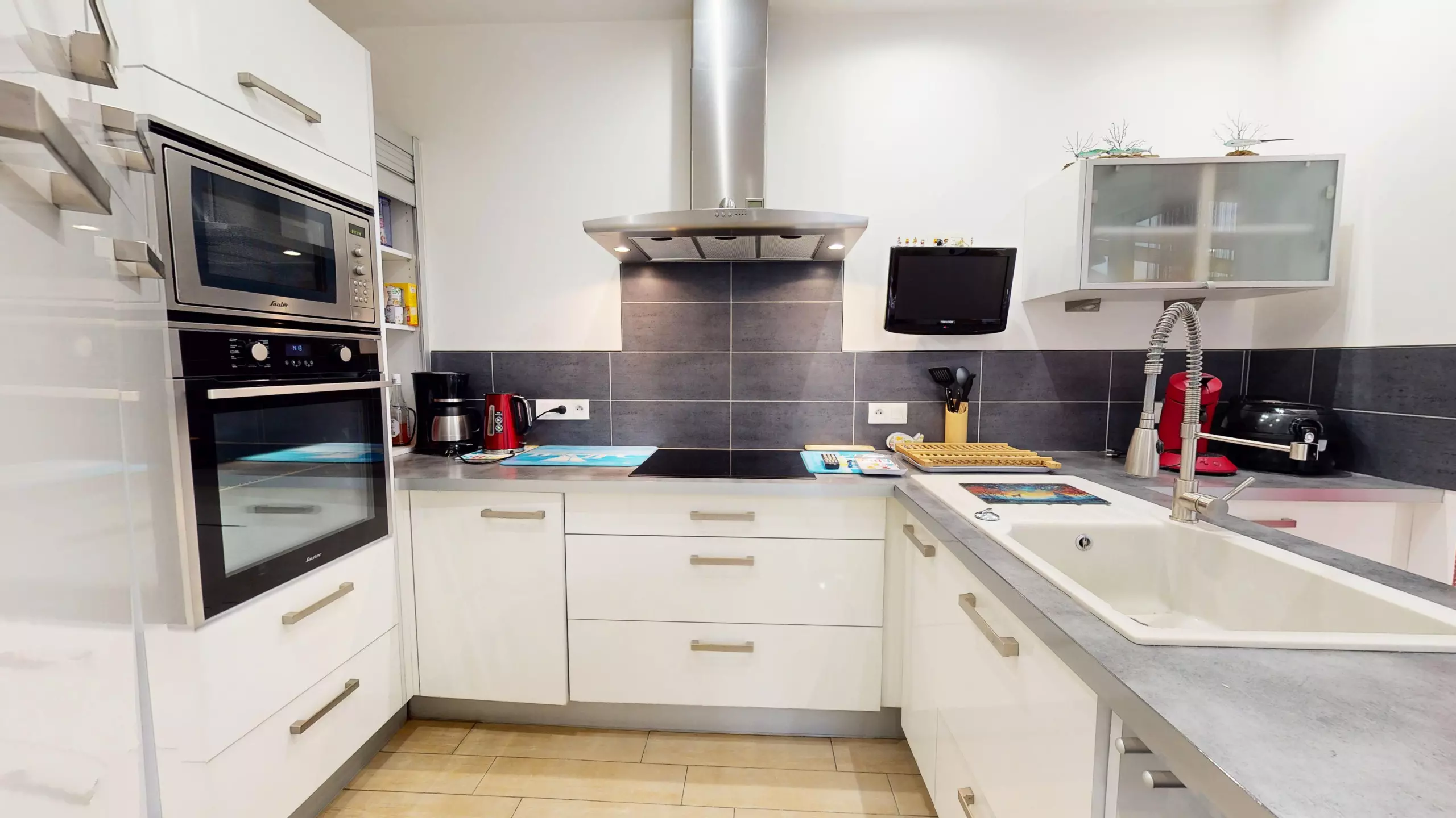 The fitted and fully equipped kitchen (refrigerator, freezer, induction hobs, extractor hood and necessary everyday equipment) also has its own television, offering real comfort during meals with family or friends.
