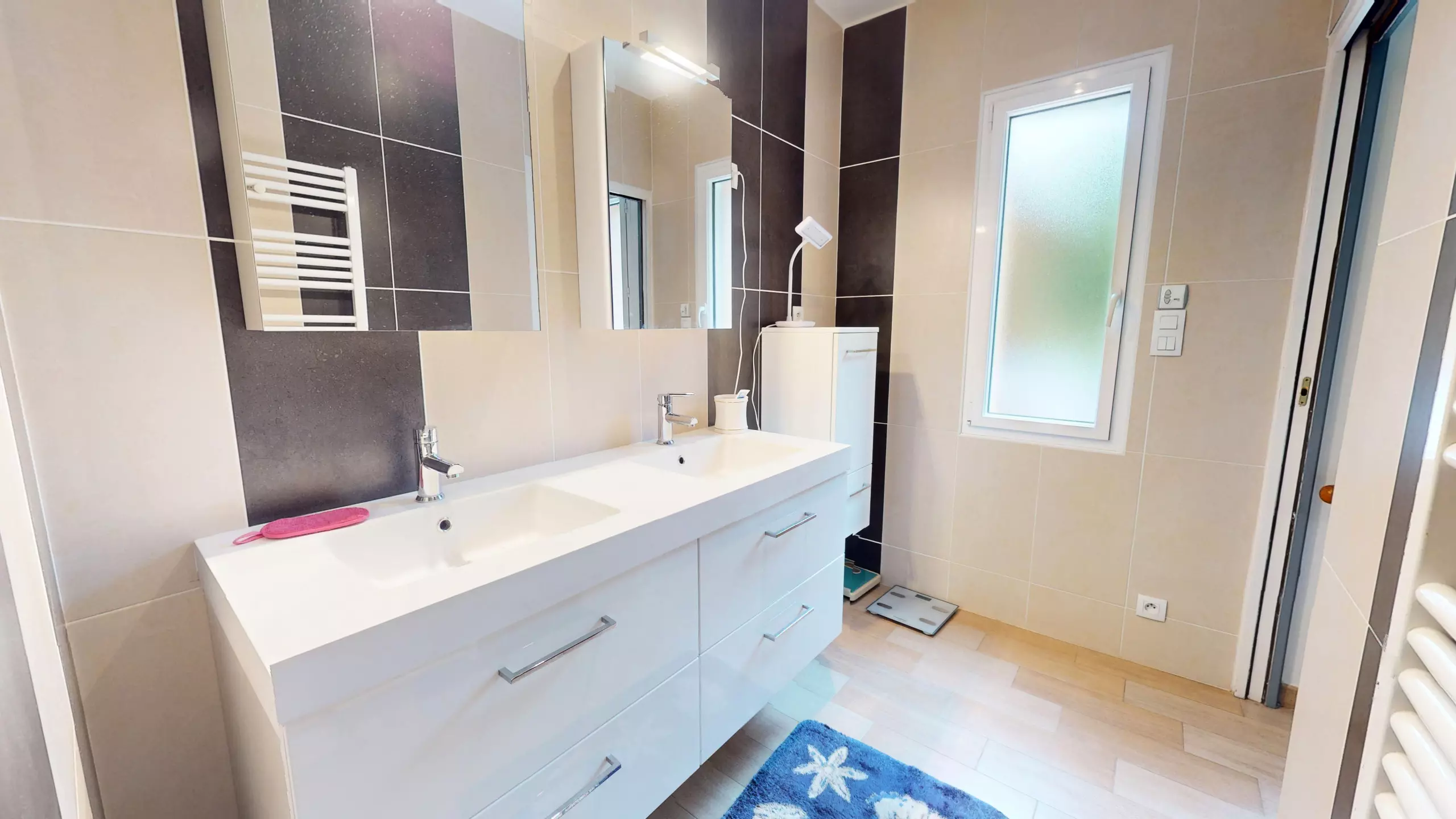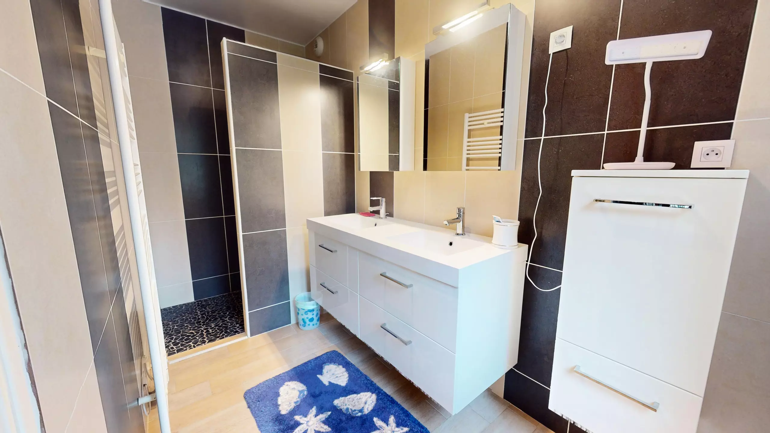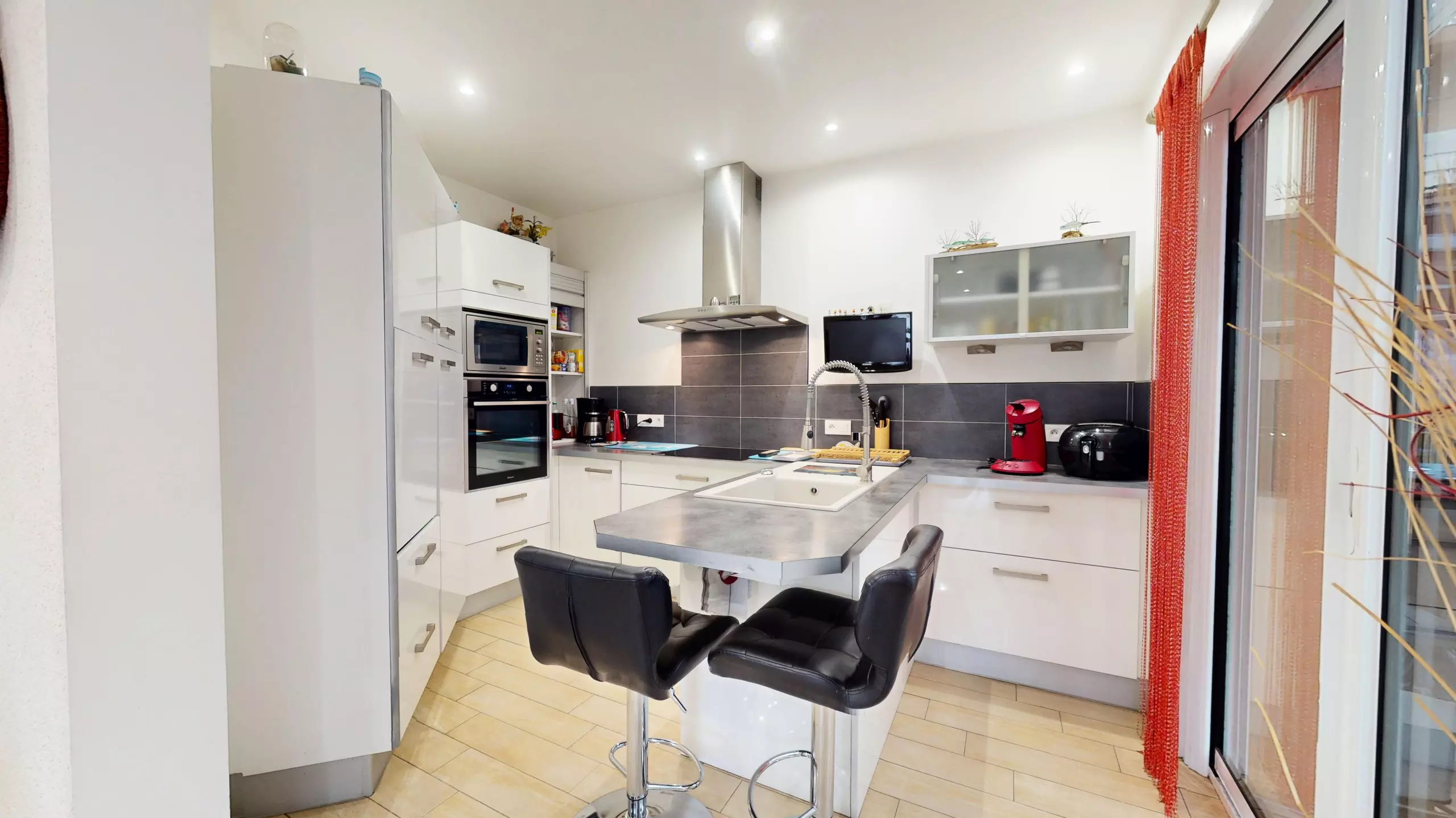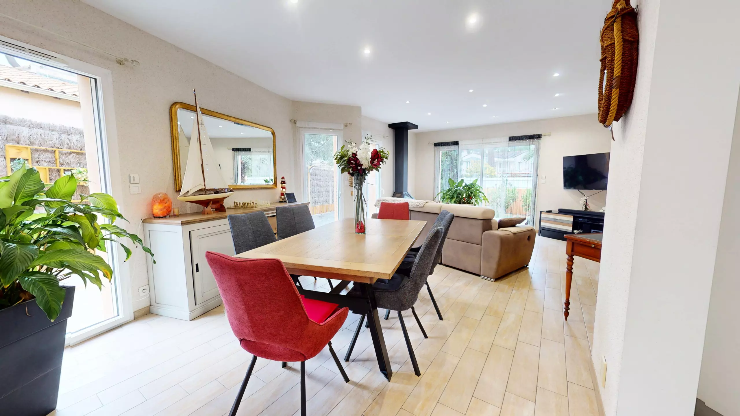 The fitted and fully equipped kitchen (refrigerator, freezer, induction hobs, extractor hood and necessary everyday equipment) also has its own television, offering real comfort during meals with family or friends.