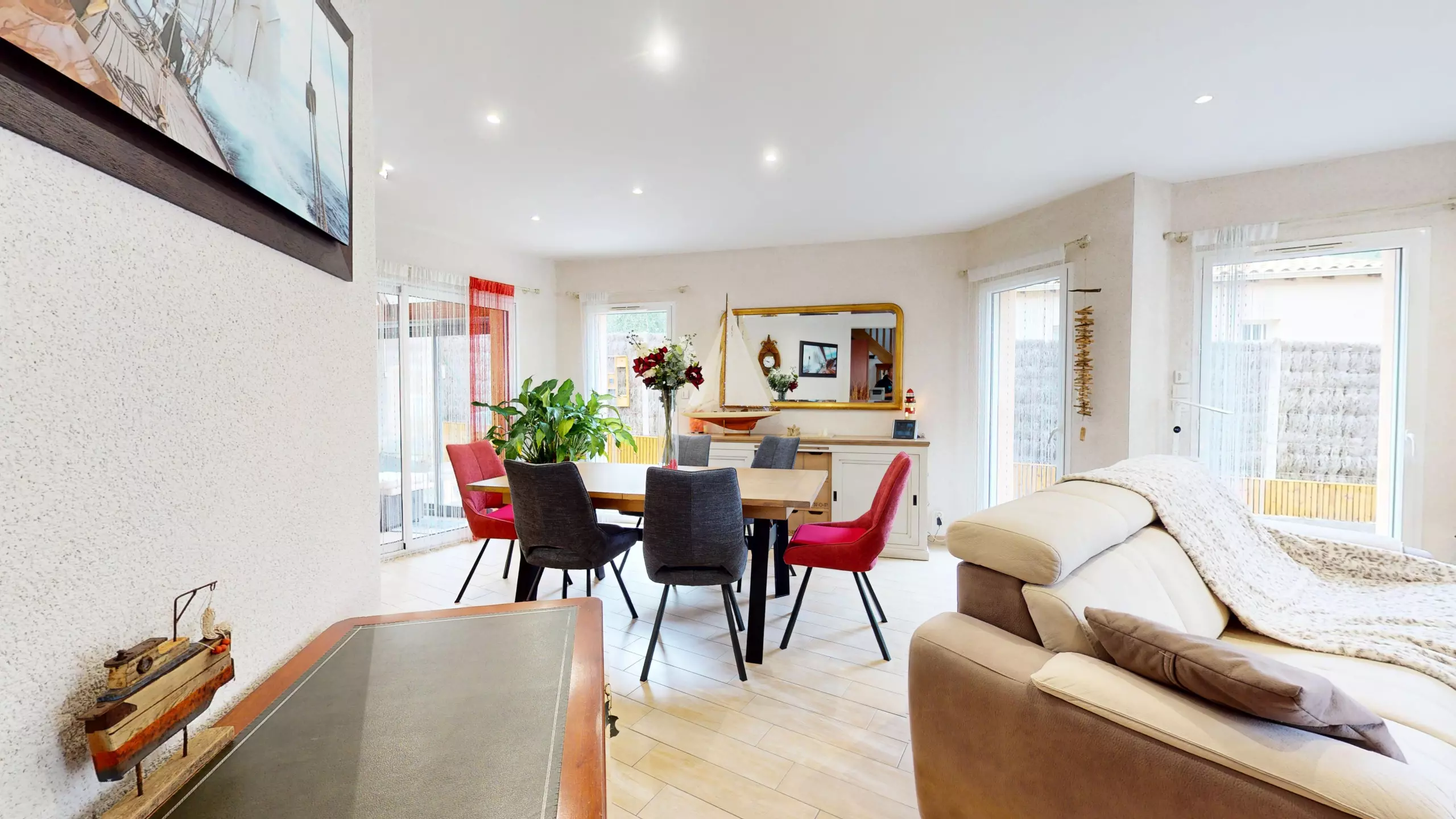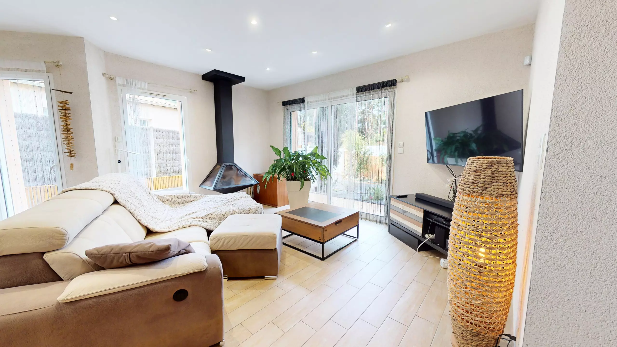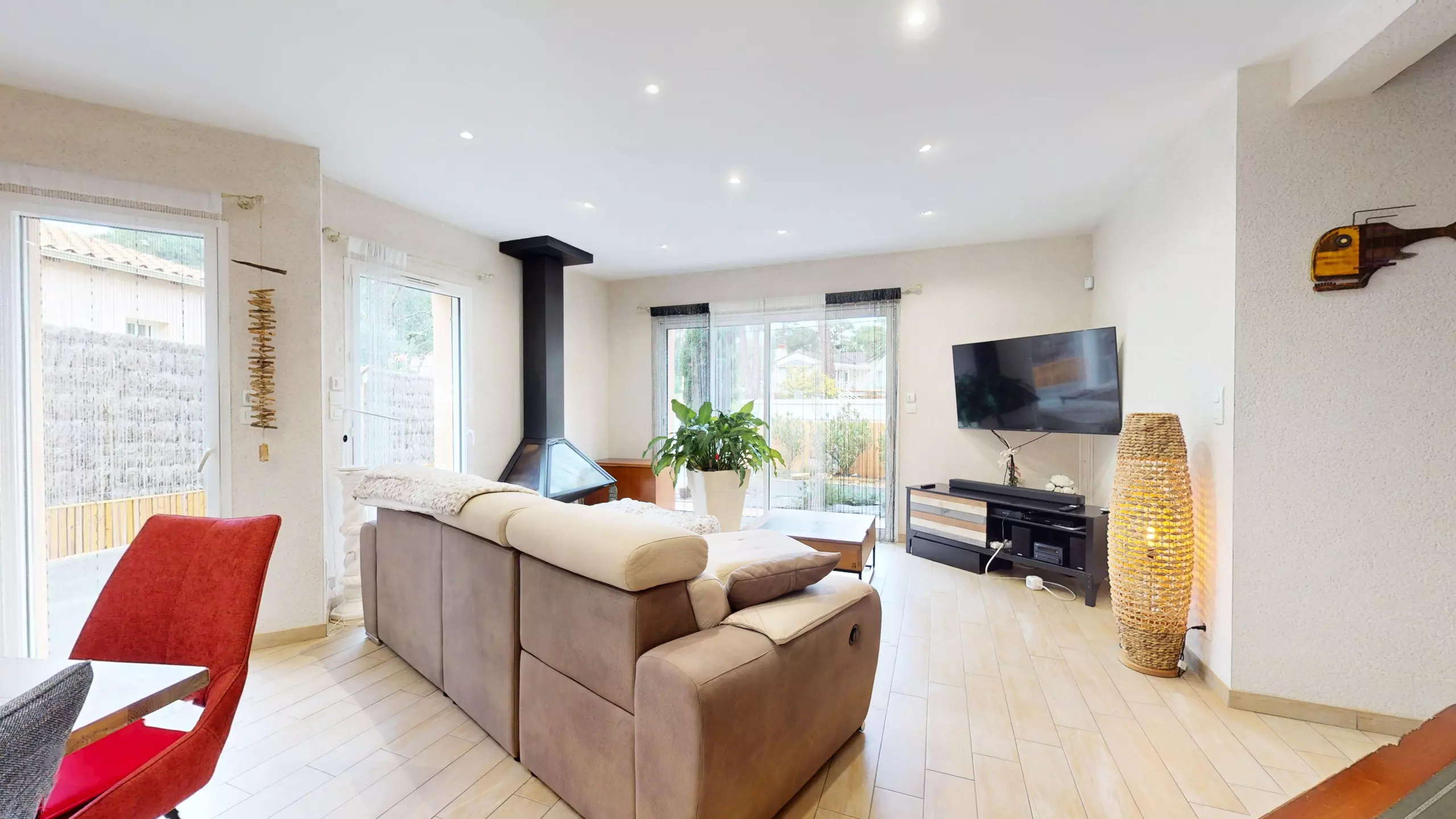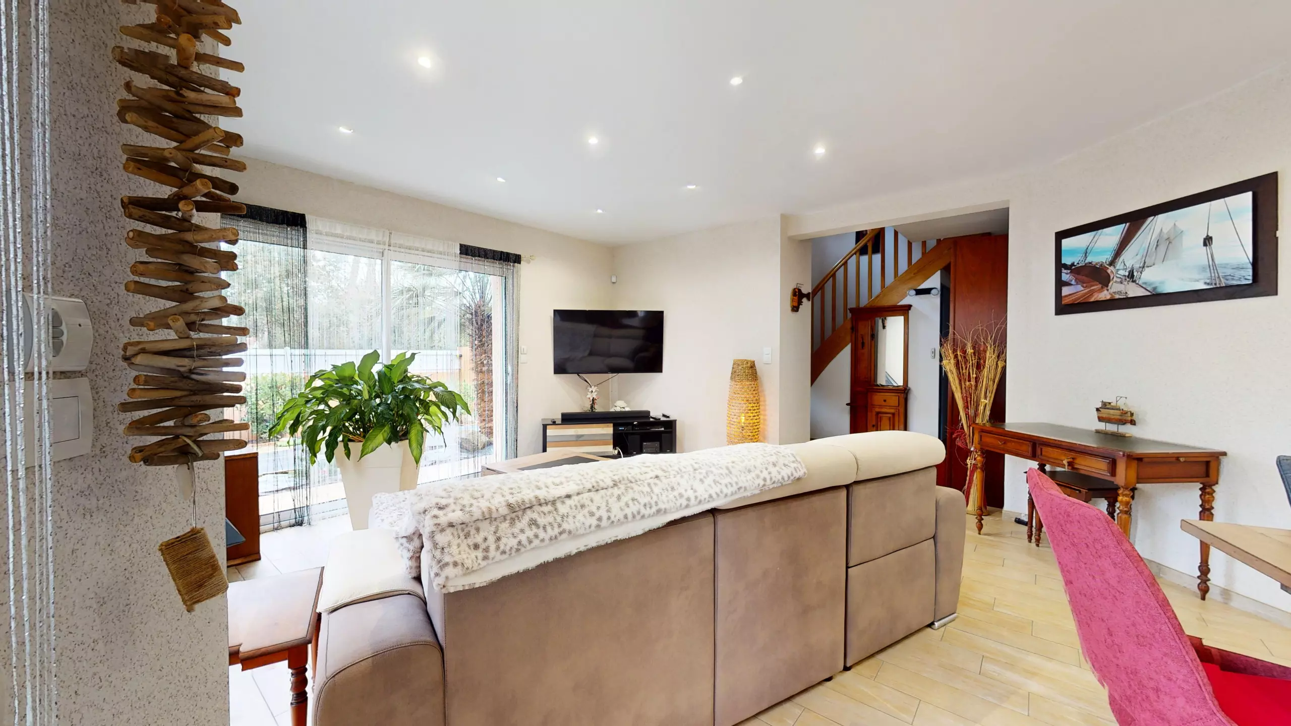 On the ground floor, the villa opens onto an entrance with a wardrobe, leading to a beautiful, bright living room equipped with a television, ideal for relaxing after a day at the beach.