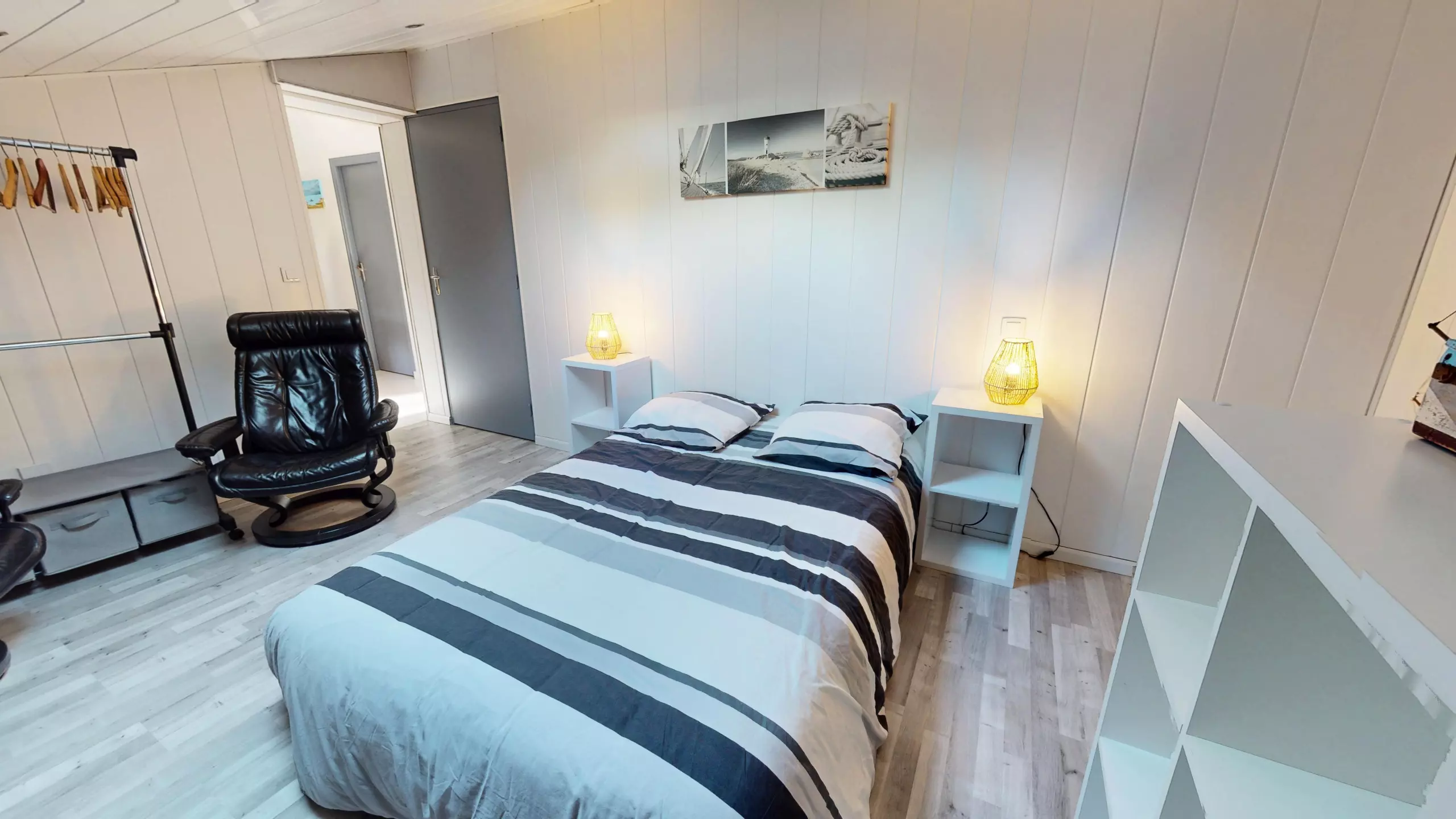 -a bedroom with a 160cm sofa bed and storage.
