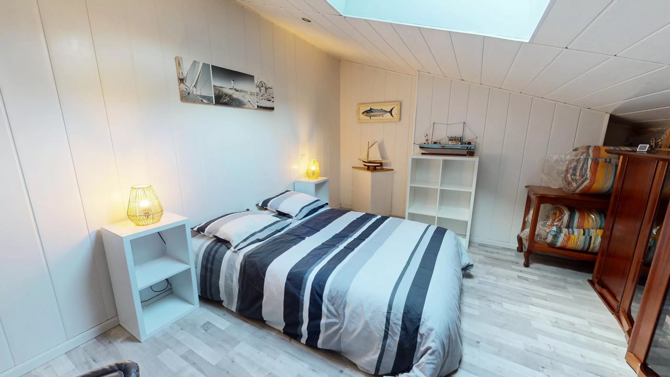 A bathroom with a bathtub and a separate toilet complete the sleeping area.