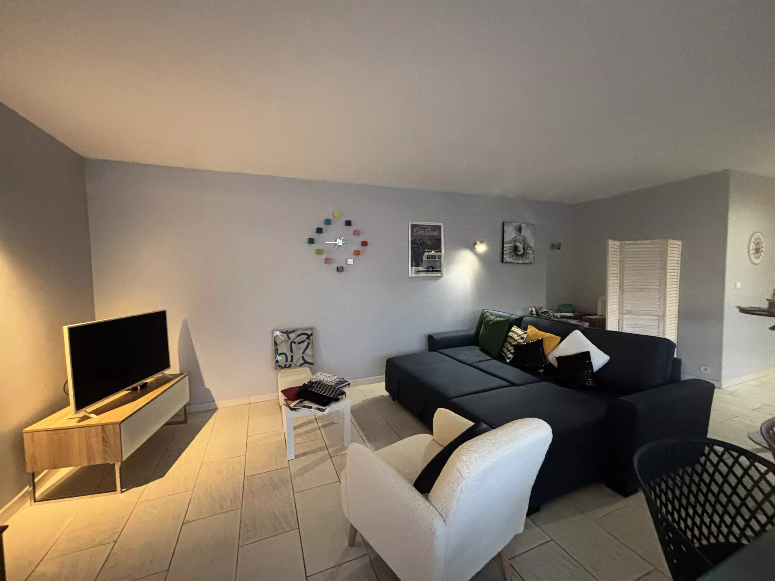 -A large, bright living room with TV, dining table and large bay windows giving access to the terrace