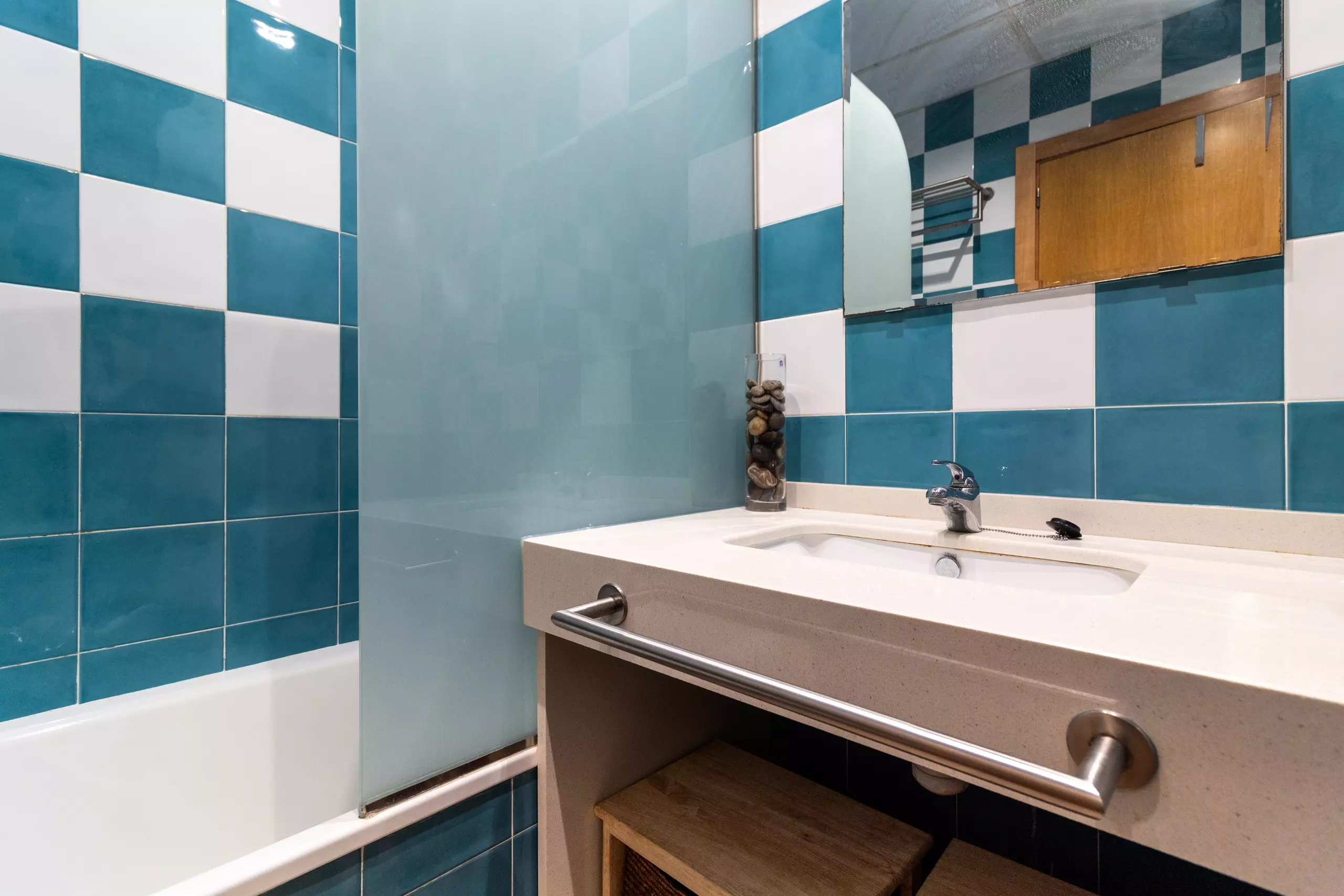 The main bathroom has a bathtub, and the apartment is air-conditioned with a heat pump to ensure your comfort year-round. It also includes convenient amenities such as an iron and a washing machine.