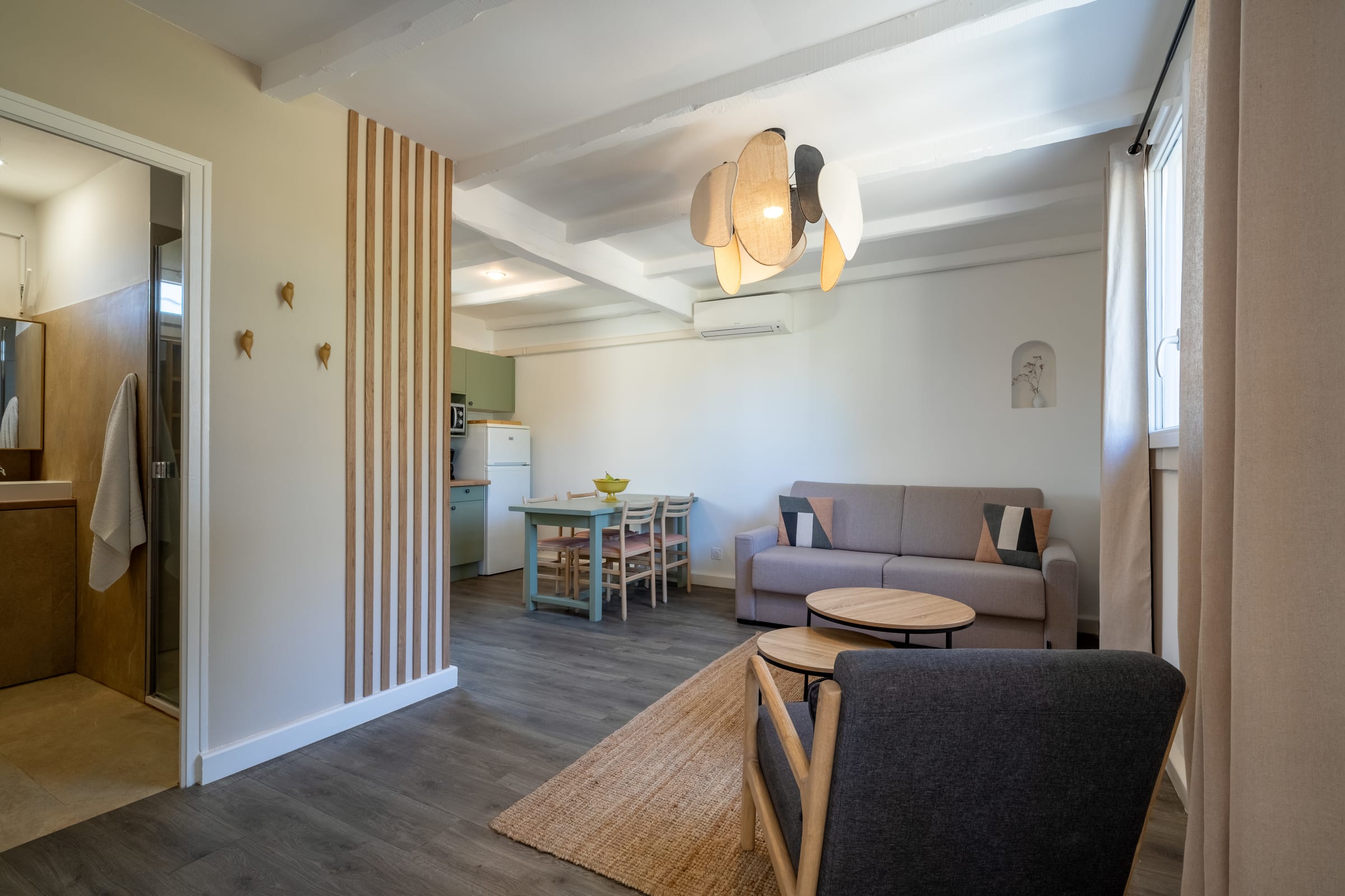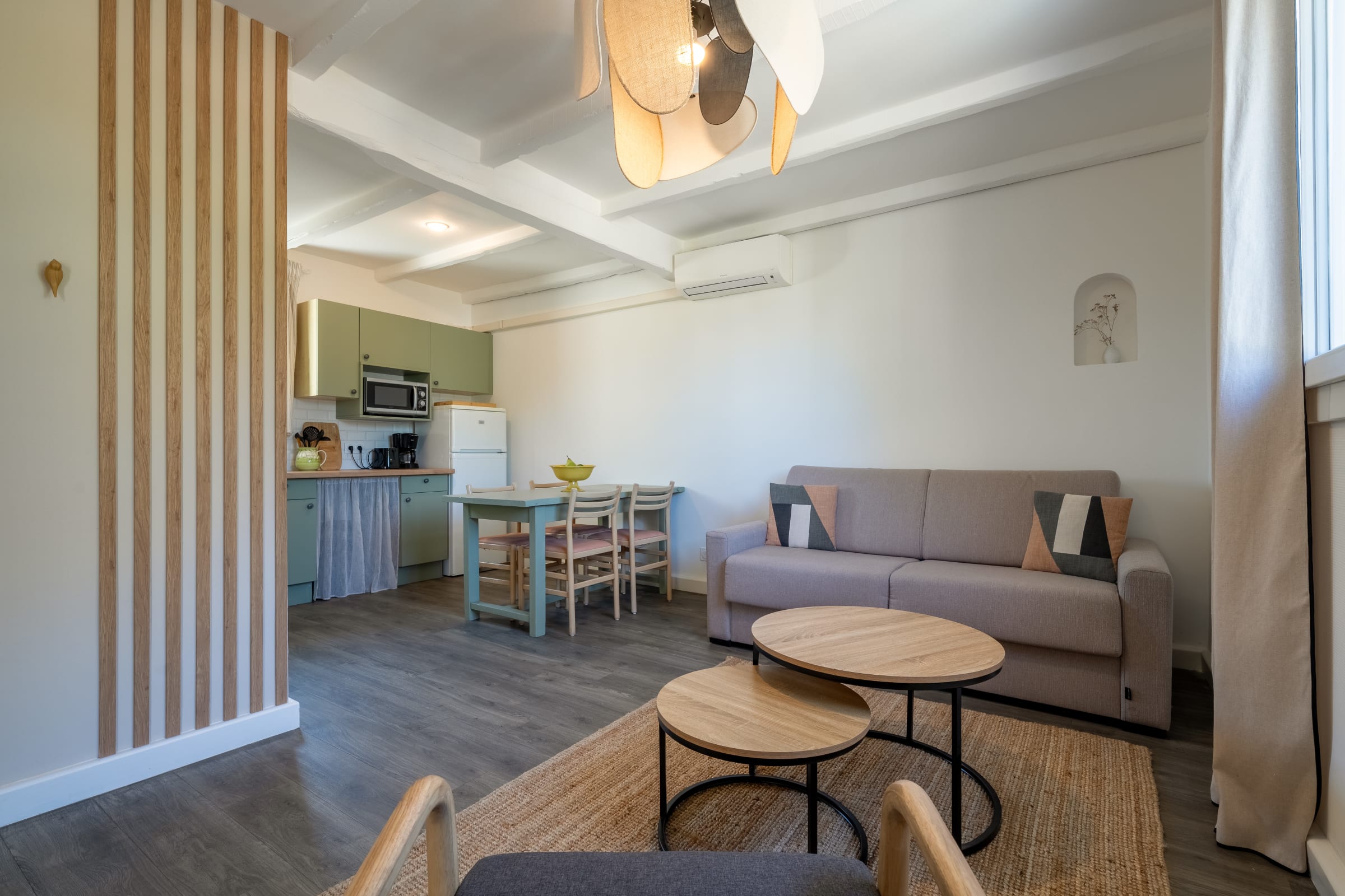 Fully renovated for your comfort, this cozy retreat features one inviting bedroom with a 140 cm double bed and a single bed. The living room boasts a convertible sofa that sleeps two, comfortably accommodating up to five guests.