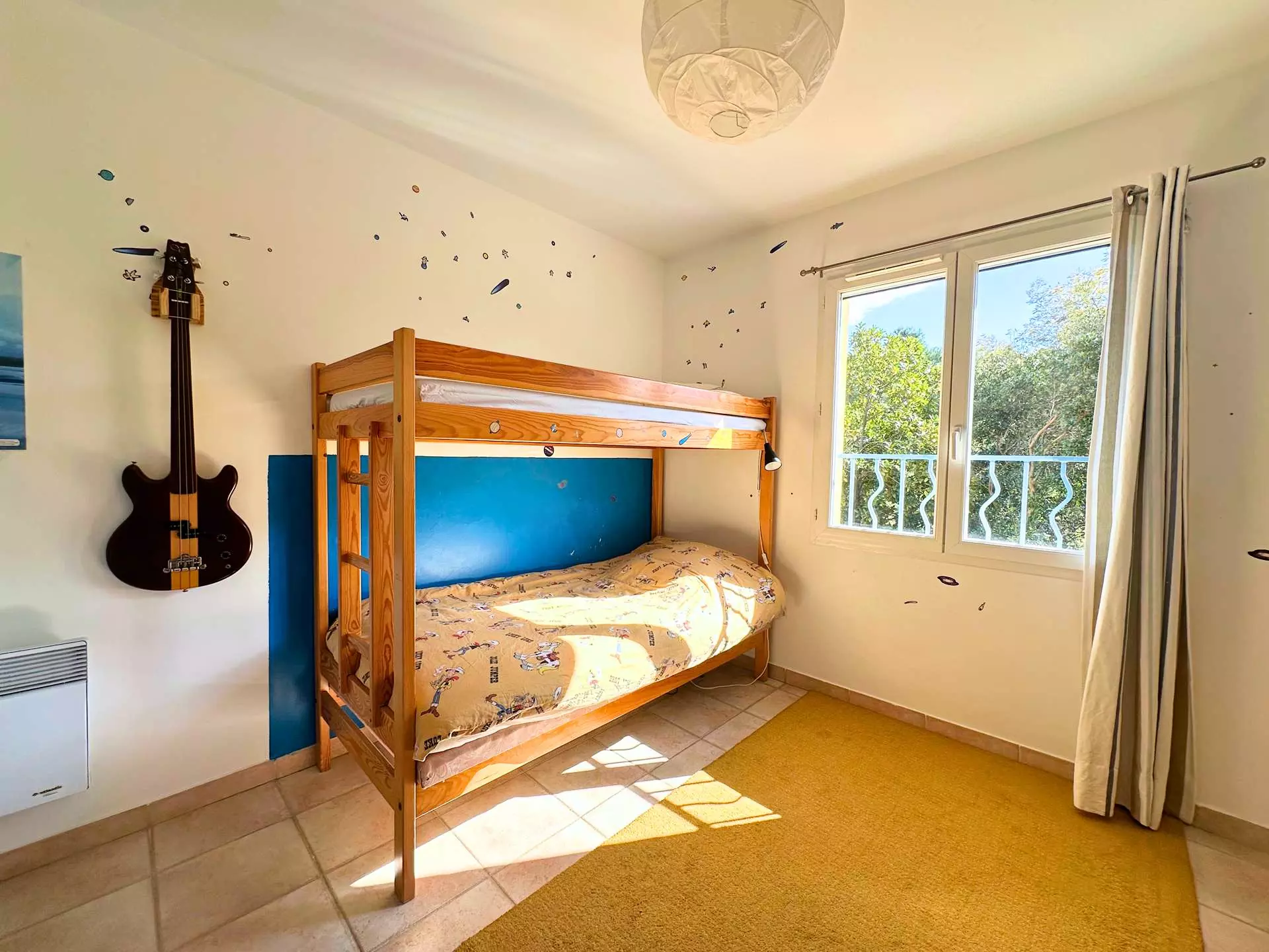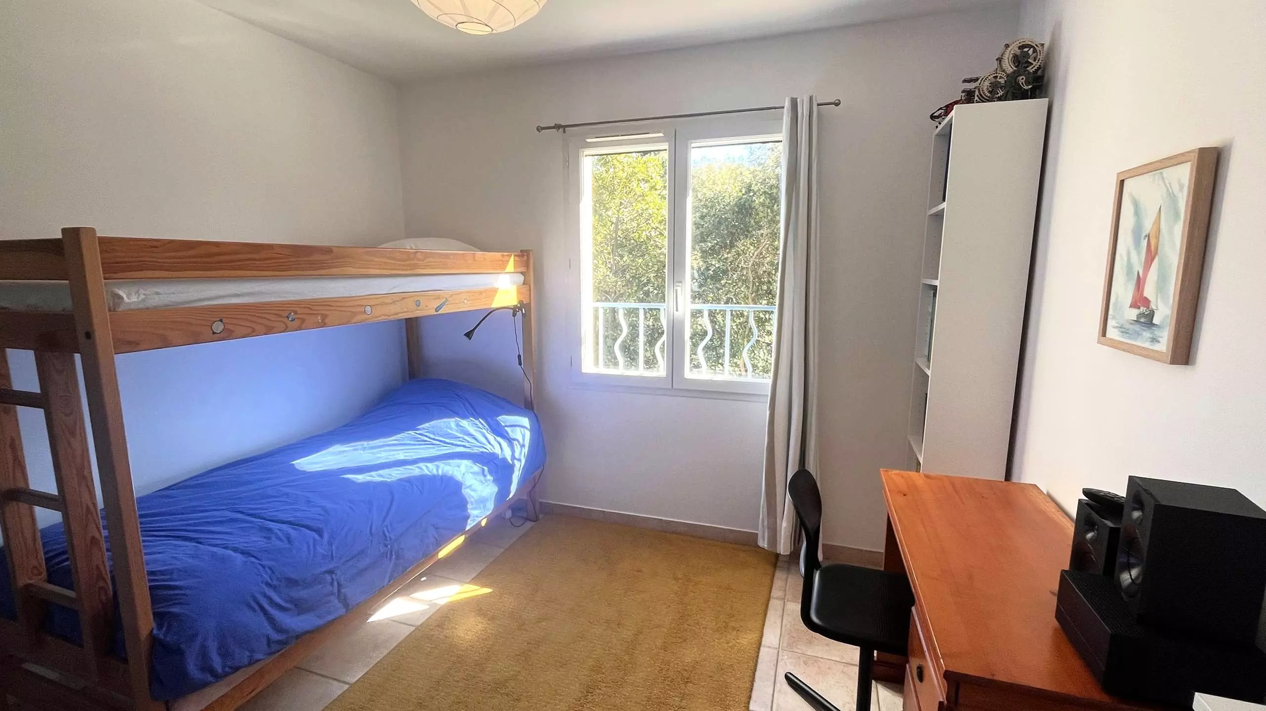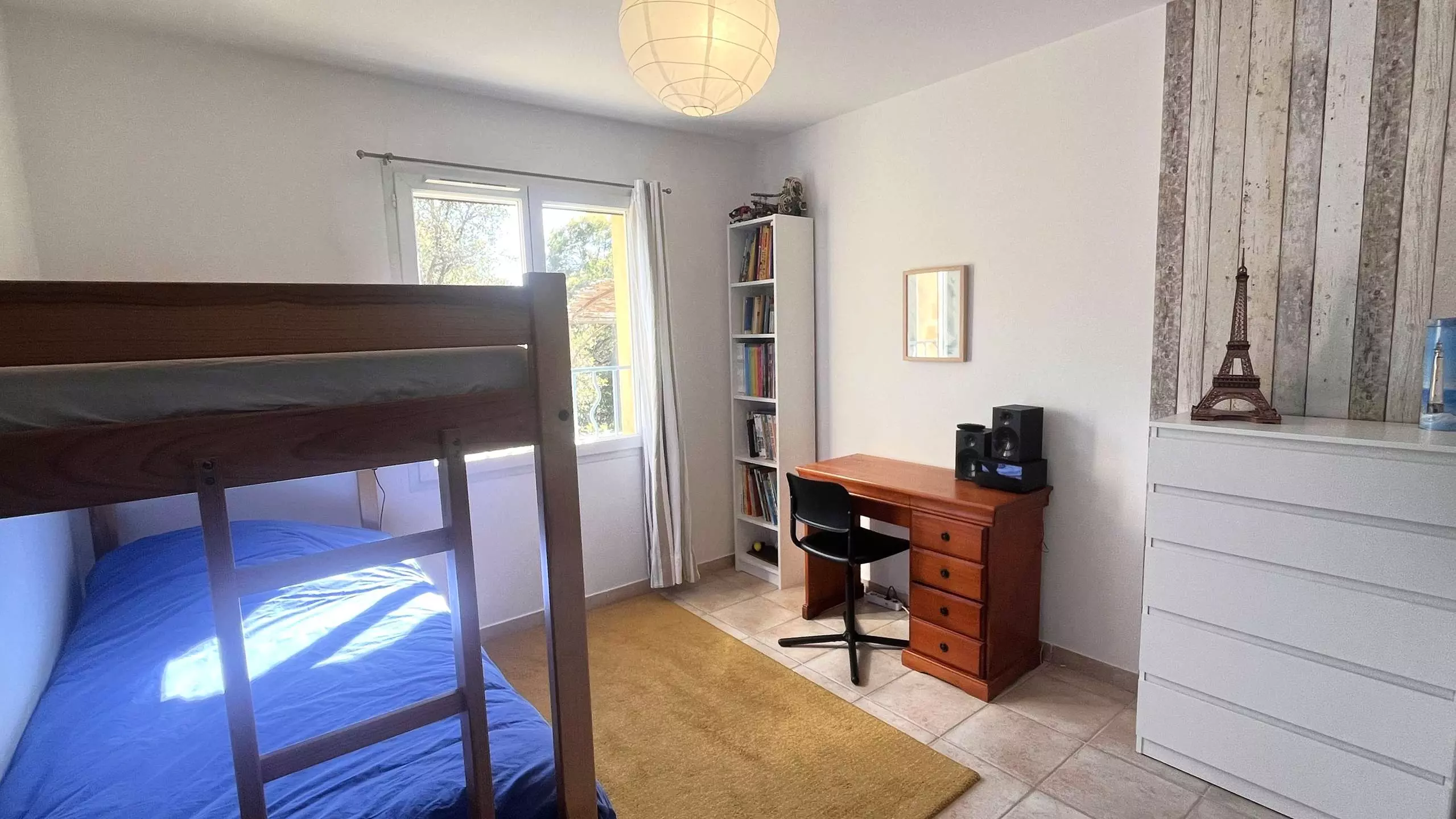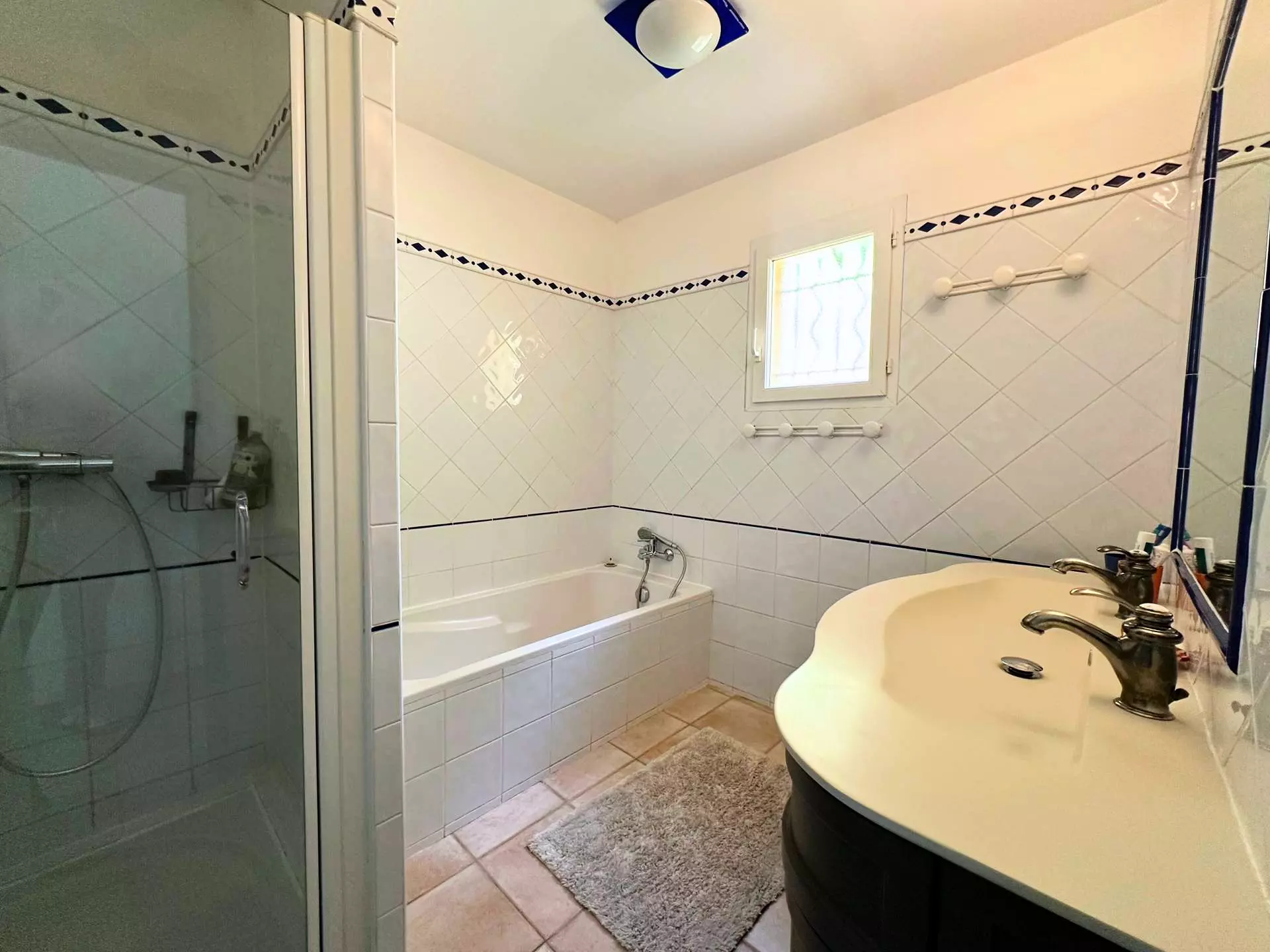 This villa benefits from a vast outdoor space of approximately 1,500 m², with a private 5 x 3 m salt water pool and a lovely terrace equipped with a shaded outdoor dining area and an electric griddle, ideal for enjoying the sun and sharing meals with family or friends.