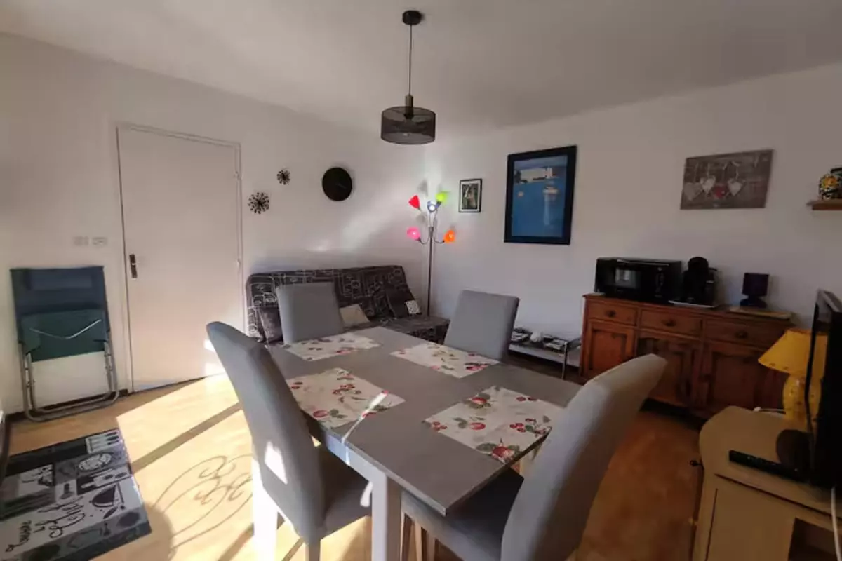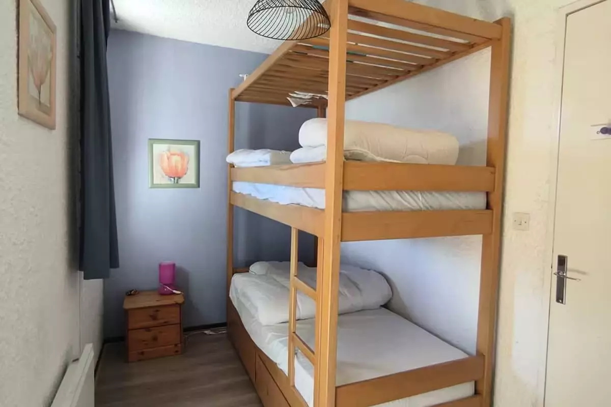 The sleeping area consists of a welcoming bedroom equipped with a bunk bed comprising two single beds of 90x190 and a living room with a convertible sofa of 140x190 to accommodate up to 4 people.