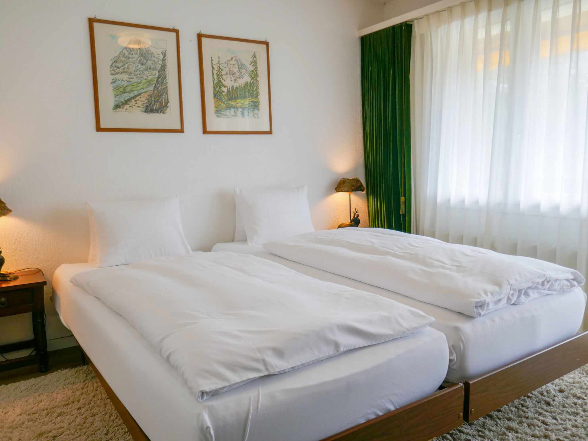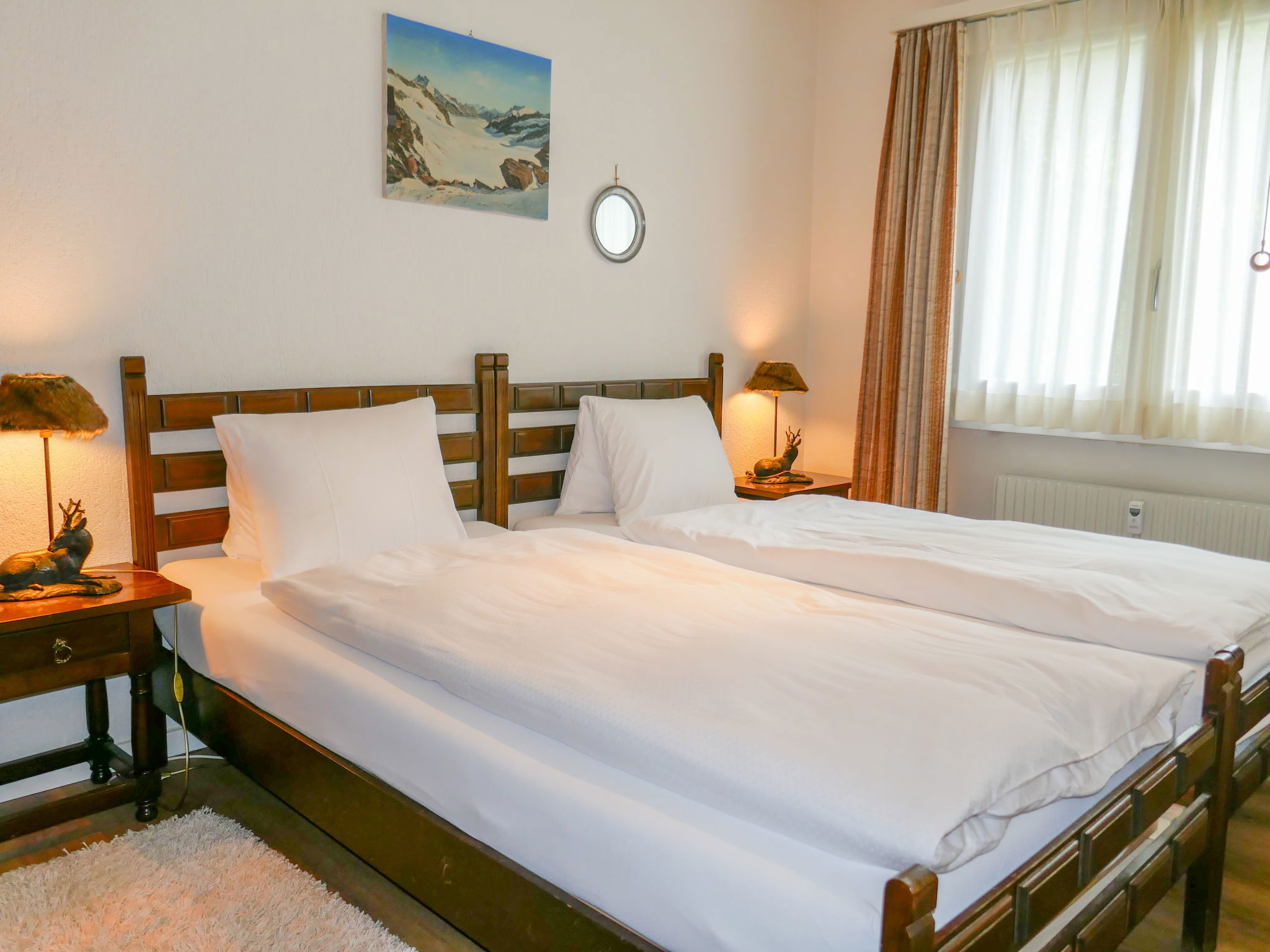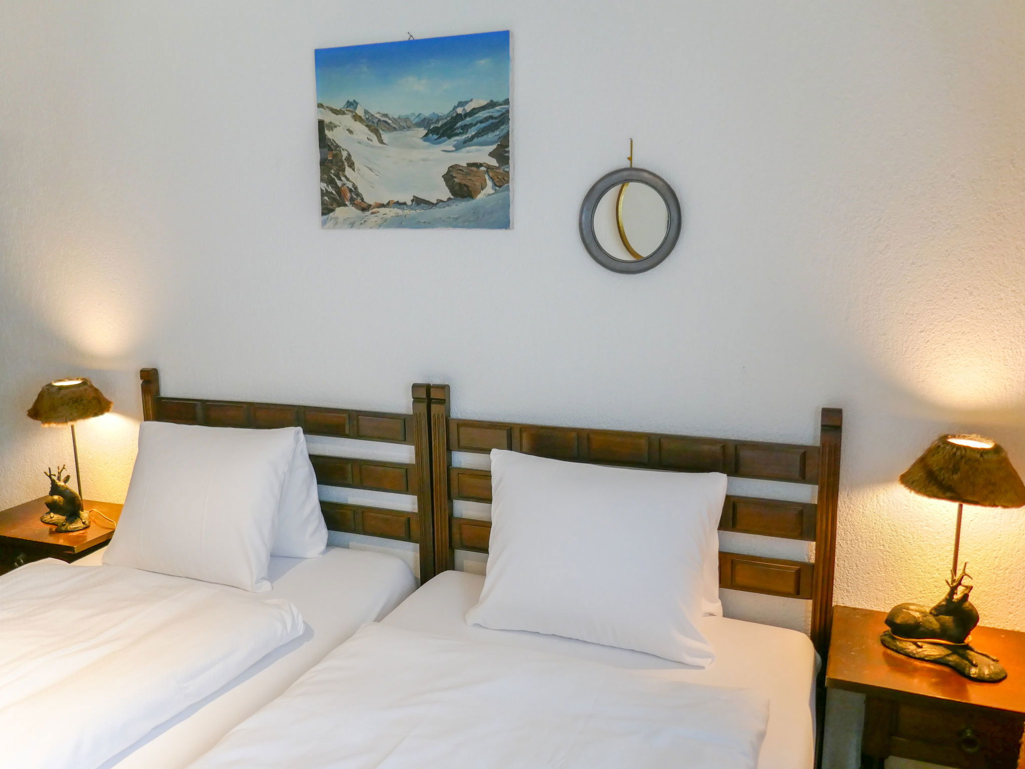 4-room apartment 100 m2, on the upper ground floor, south facing position. Comfortable and cosy furnishings: living/dining room with satellite TV (flat screen). Exit to the balcony. 2 rooms, each room with 2 beds (90 cm, length 200 cm). 1 room with 1 bed (90 cm, length 200 cm). Open kitchen (oven, dishwasher, 4 ceramic glass hob hotplates, kettle, microwave, electric coffee machine, Capsules for coffee machine (Nespresso) extra, raclette grill, fondue Set (chinoise, cheese)). Bath/WC. Parquet floors. Large balcony, south facing position and west facing position. Balcony furniture. Marvellous view of the mountains and Eiger. Facilities: hair dryer. Internet (WiFi, free). Parking at the house. Please note: non-smokers only. Maximum 1 pet/ dog allowed. Fire extinguisher.
