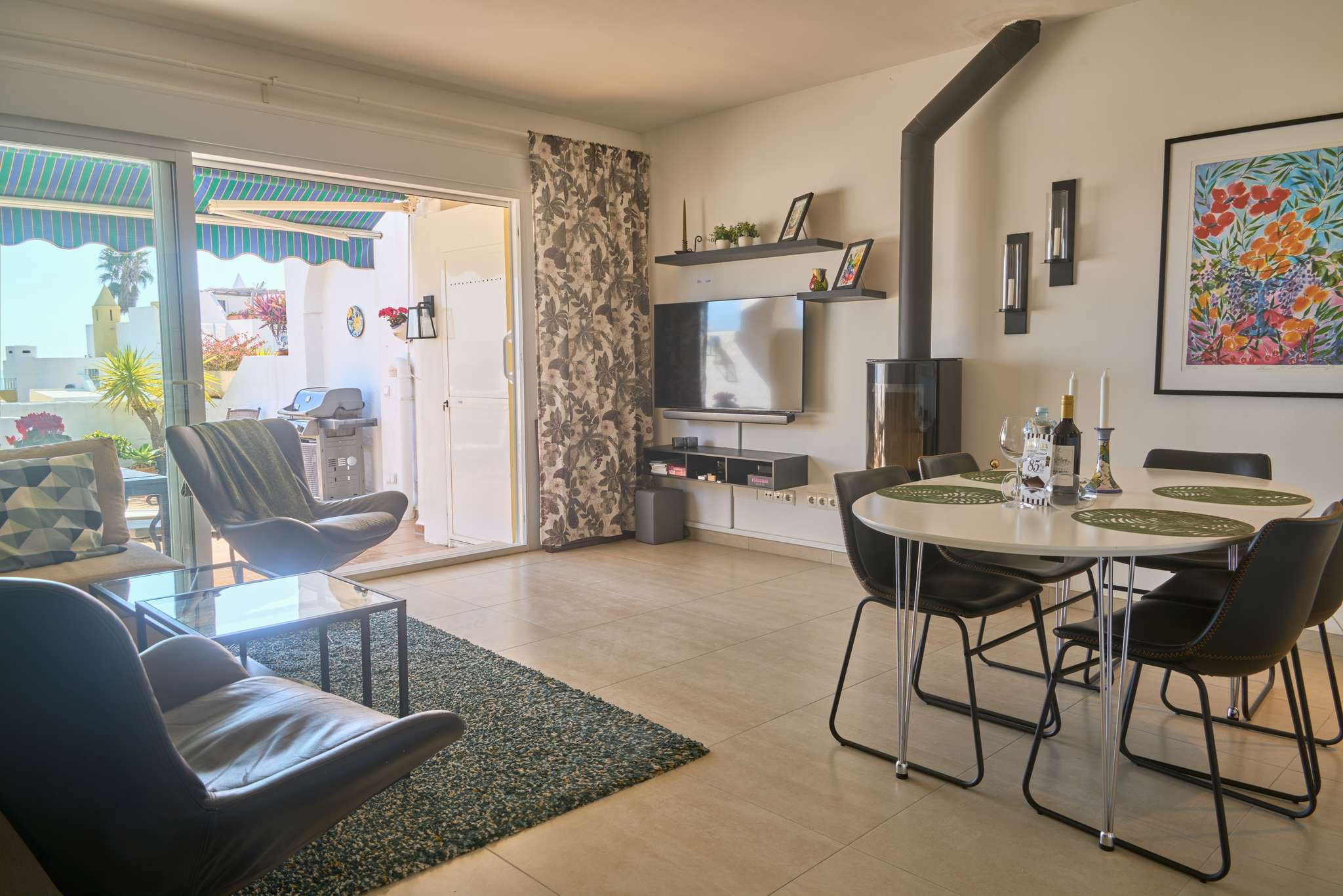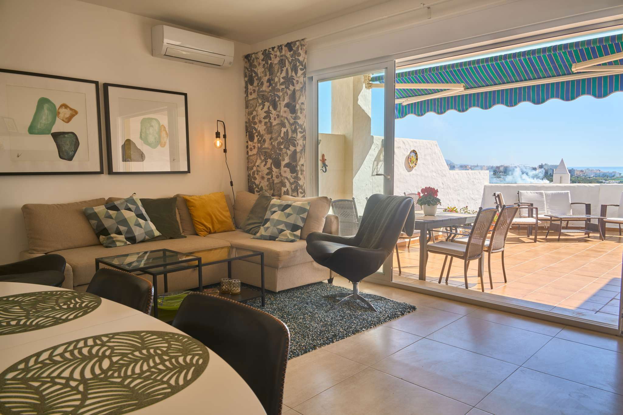 Enjoy a coffee at sunrise or a dinner in front of the Mediterranean in this duplex apartment situated in the Urbanisation Casablanca. The property stands out for its design on several levels that guarantees natural light throughout the day and unobstructed panoramic views towards the sea and the Almijara mountain range. It is the ideal accommodation for those seeking tranquillity without giving up the comfort of a fully equipped house with Wi-Fi and air conditioning for a comfortable family stay.
