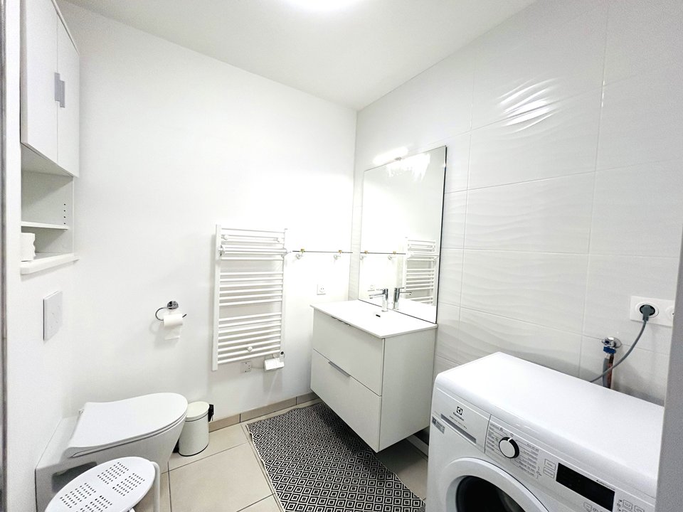 - Modern bathroom with accessible shower, toilet, sink, and washing machine