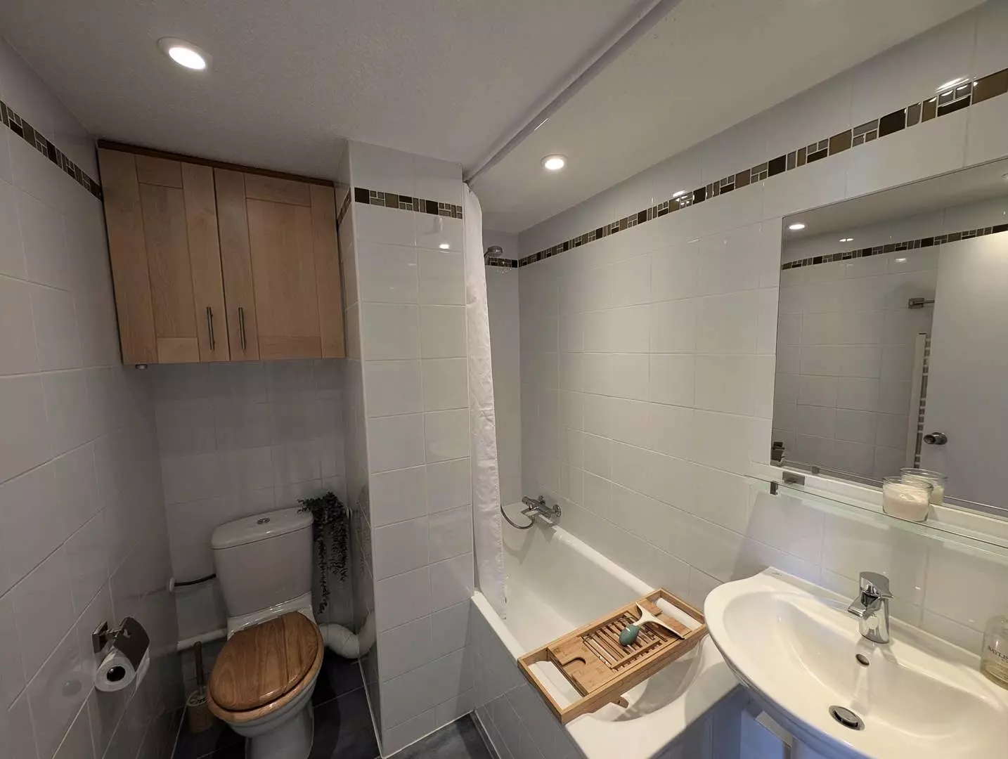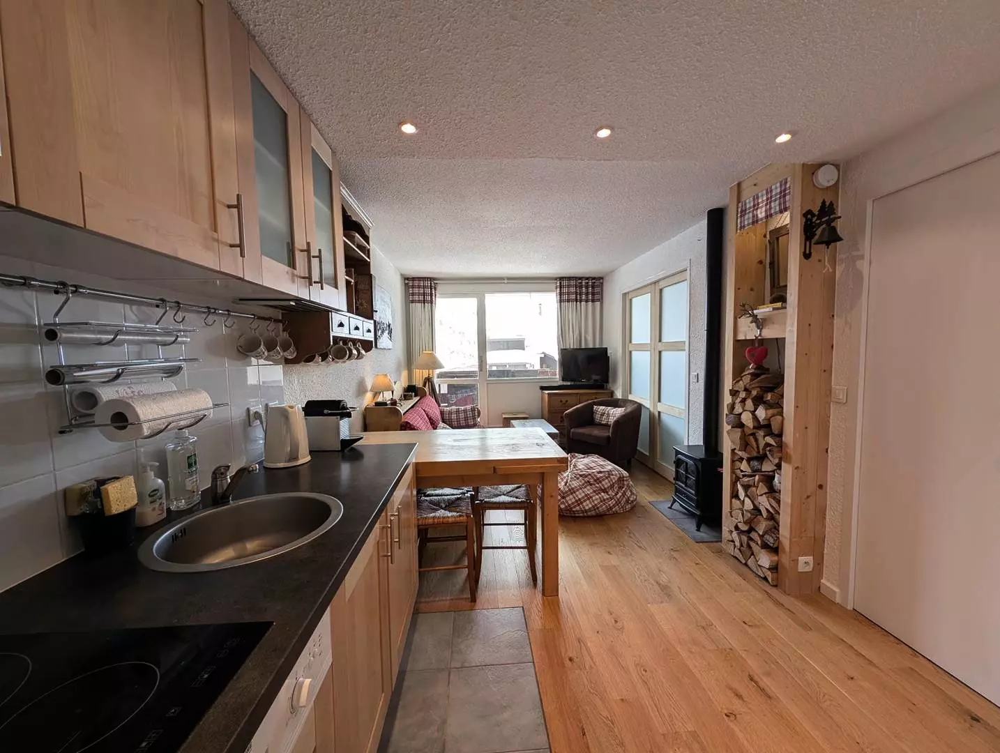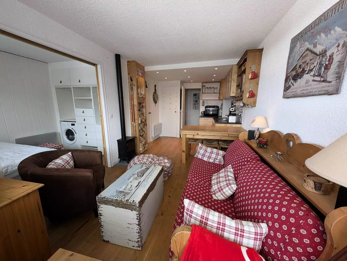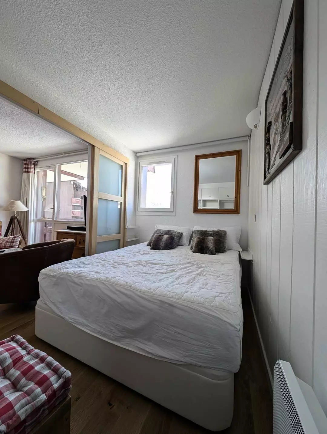 PC201 2/3-room apartment of 37 m², located in a chalet-style building in the heart of the "Hameau" (south-facing slope of the resort), a 15-minute walk from the center. With a beautiful view of the Hameau center and the mountains, it features a living room that can be divided into two separate sleeping areas by a sliding door, with a double bedroom, dressing room, and washing machine. In the entrance hall, there is a sleeping alcove with two bunk beds (not suitable for adults), accessible by a door. Window. Separate bathroom and WC. Parquet flooring. High-quality finishes. Ski locker. Balcony. Wi-Fi. No smoking. No parties.