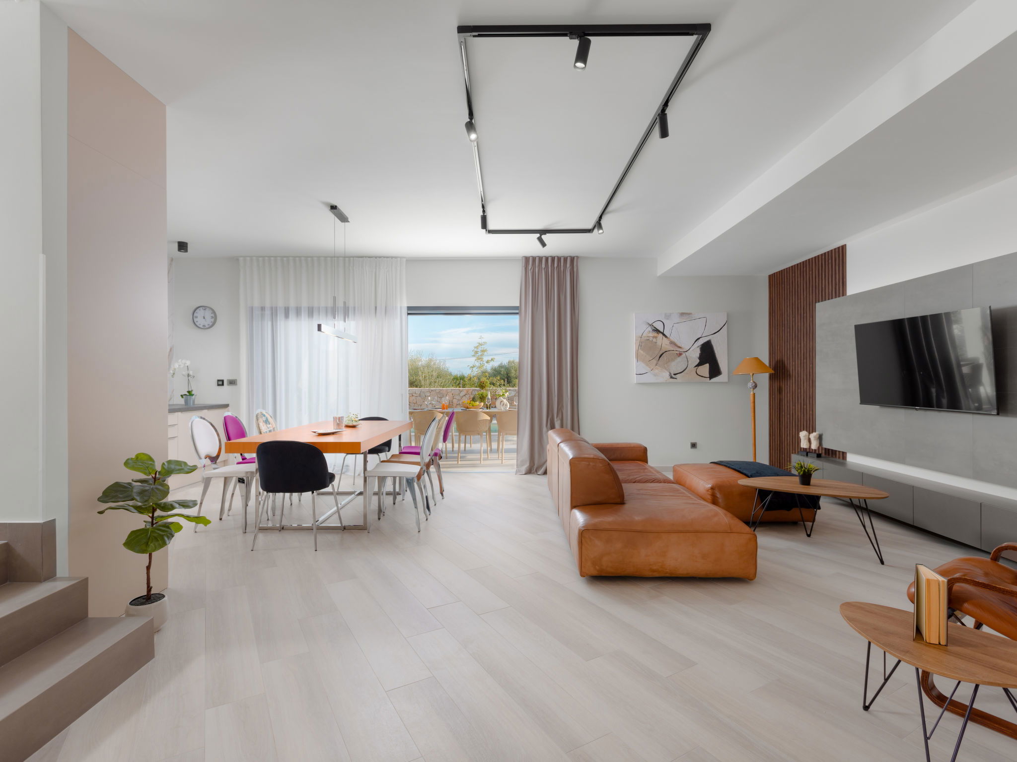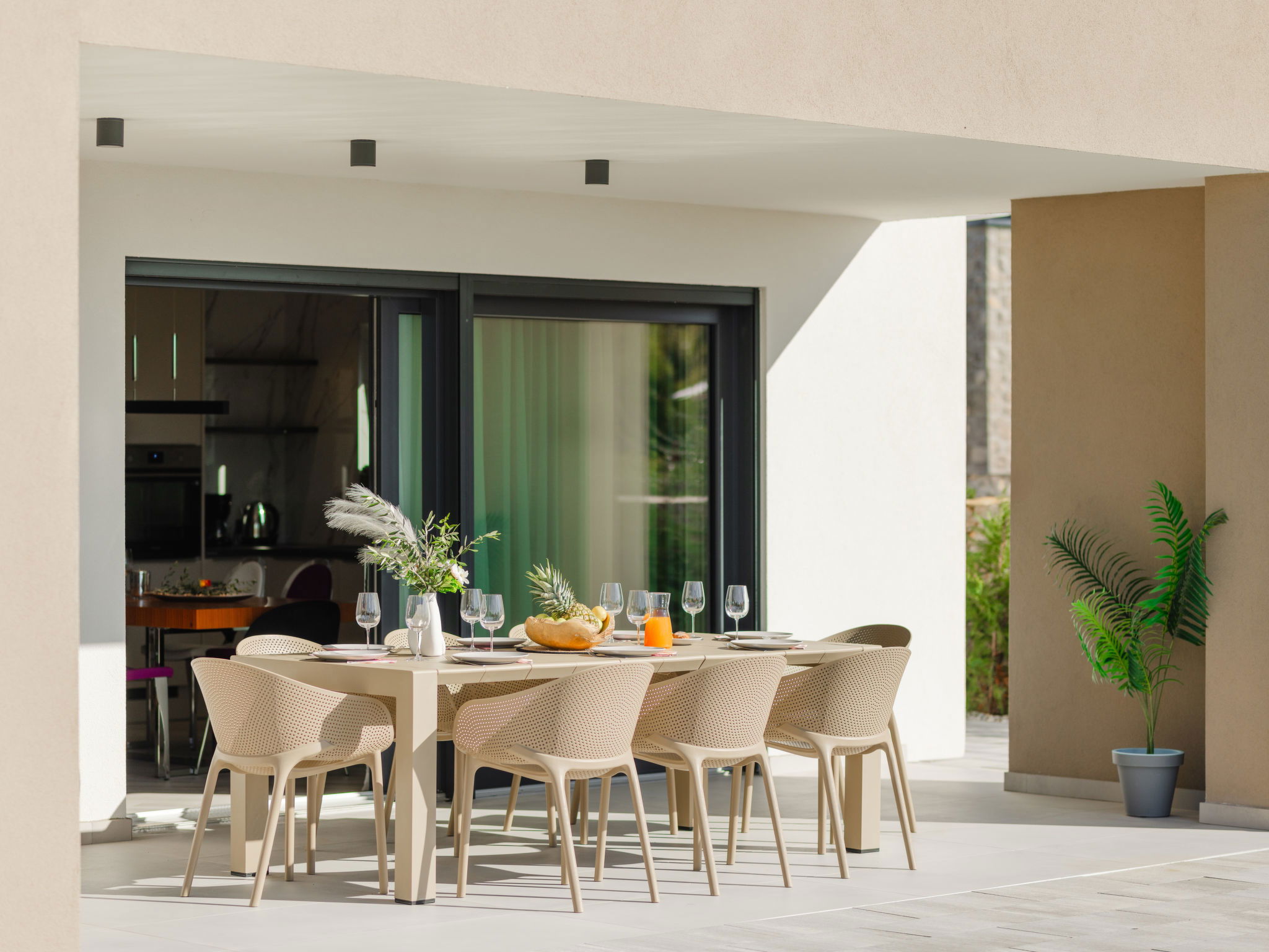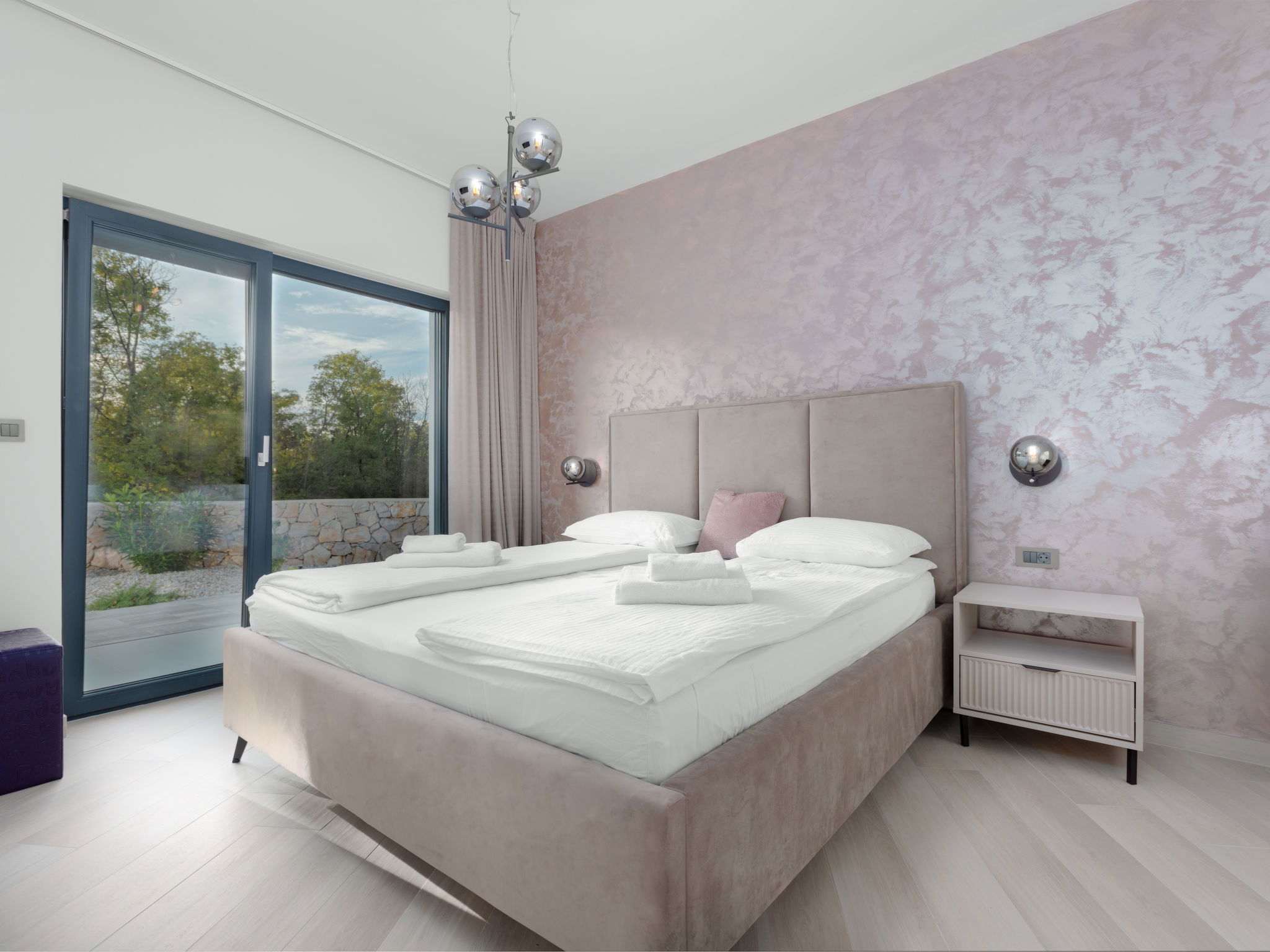 Kras: Modern villa "Dream", 2 storeys. 3.8 km from the centre of Dobrinj, 6.7 km from the centre of Malinska, 13 km from the centre of Krk, 6 km from the sea, 6 km from the beach, in the countryside. Private: property 500 m2 (fenced), garden 150 m2, swimming pool angular (8 x 3 m, depth 145 cm, seasonal availability: 01.Jun. - 15.Oct.) with internal staircase and salt-electrolysis pool-cleaning system. Outdoor shower, barbecue, pool maintenance by the owner/gardener. In the house: internet access. Parking (for 3 cars) at the house on the premises. Shop 900 m, supermarket 5 km, bus stop 900 m, pebble beach 6 km.
