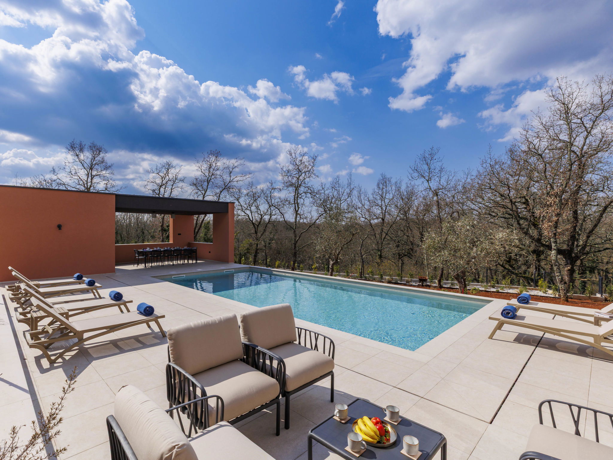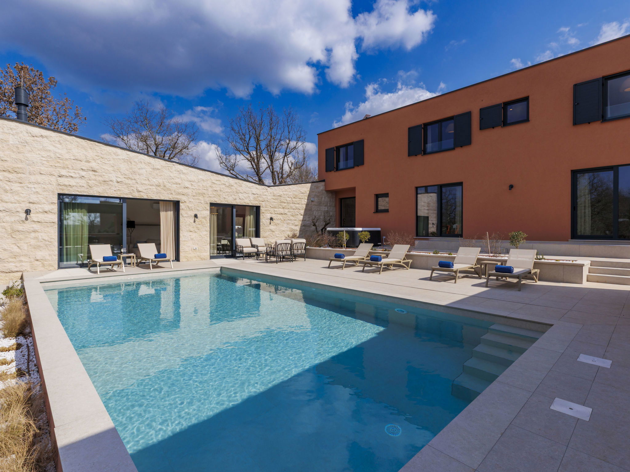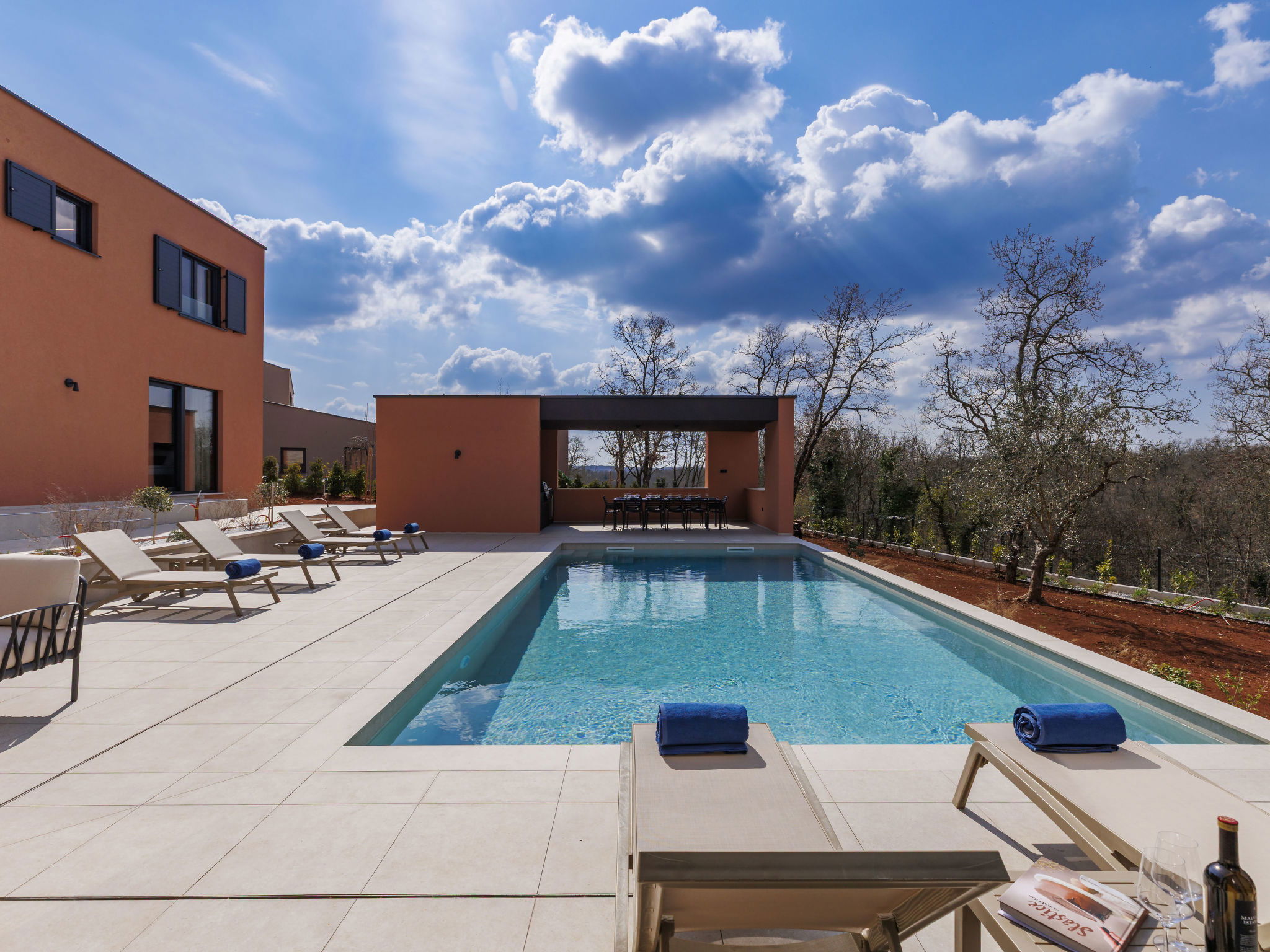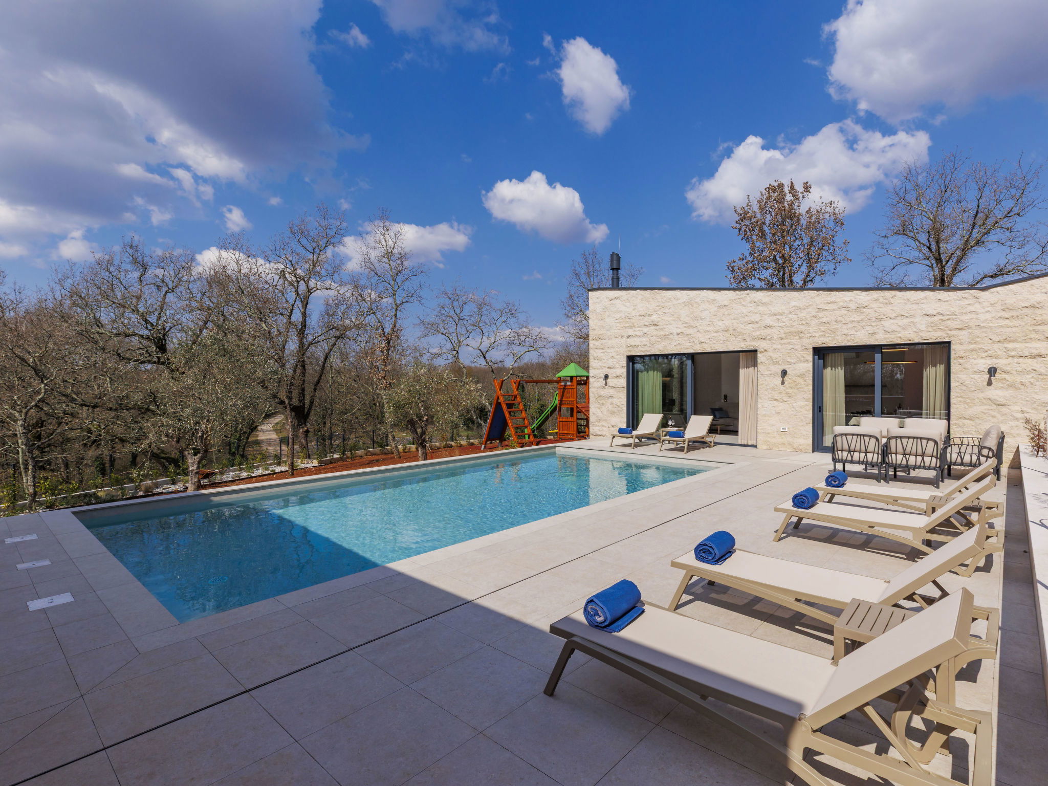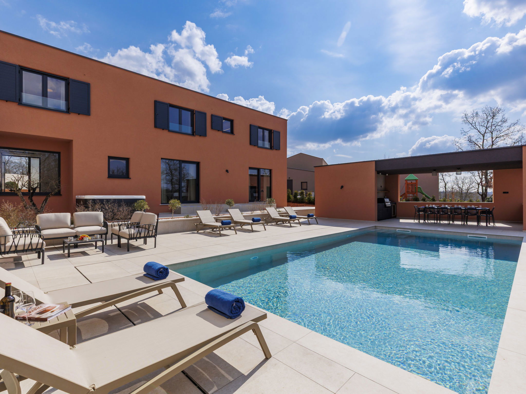 Beautiful, luxurious single-family house "La Terra", built in 2026. In the hamlet Banki 4 km from the centre of Tinjan, 12 km from the centre of Poreč, in a sunny position, 12 km from the sea. Private: property 1'594 m2 with lawn and wildlife garden, swimming pool angular (10 x 5 m, depth 145 cm, seasonal availability: 01.Apr. - 30.Sep.) with internal staircase. Outdoor shower, hot tub, terrace (20 m2), garden furniture, barbecue, children's playground (slide, swing), pool maintenance by the owner/gardener. In the house: internet access, sauna, fitness room, washing machine. Parking (for 5 cars) at the house on the premises. E-charging station. Shop 4 km, supermarket 11 km, restaurant 4 km, bus stop 4 km, pebble beach 12 km, rocky beach 12 km. Nearby attractions: Aquapark 18 km, Adrenalin park Kringa 7 km. The owner does not accept any youth groups.