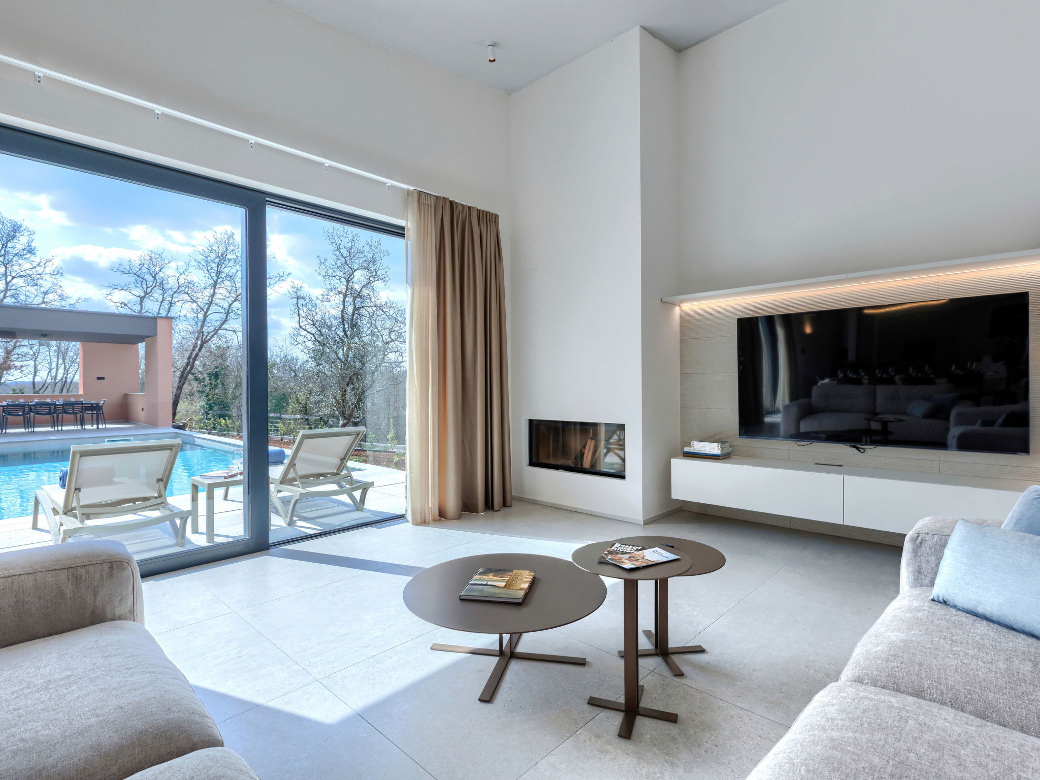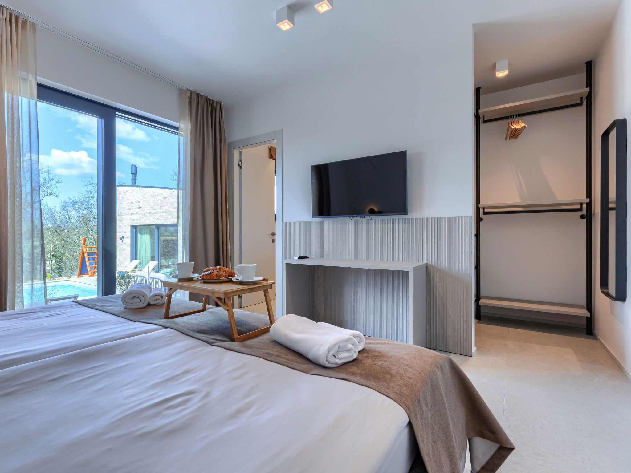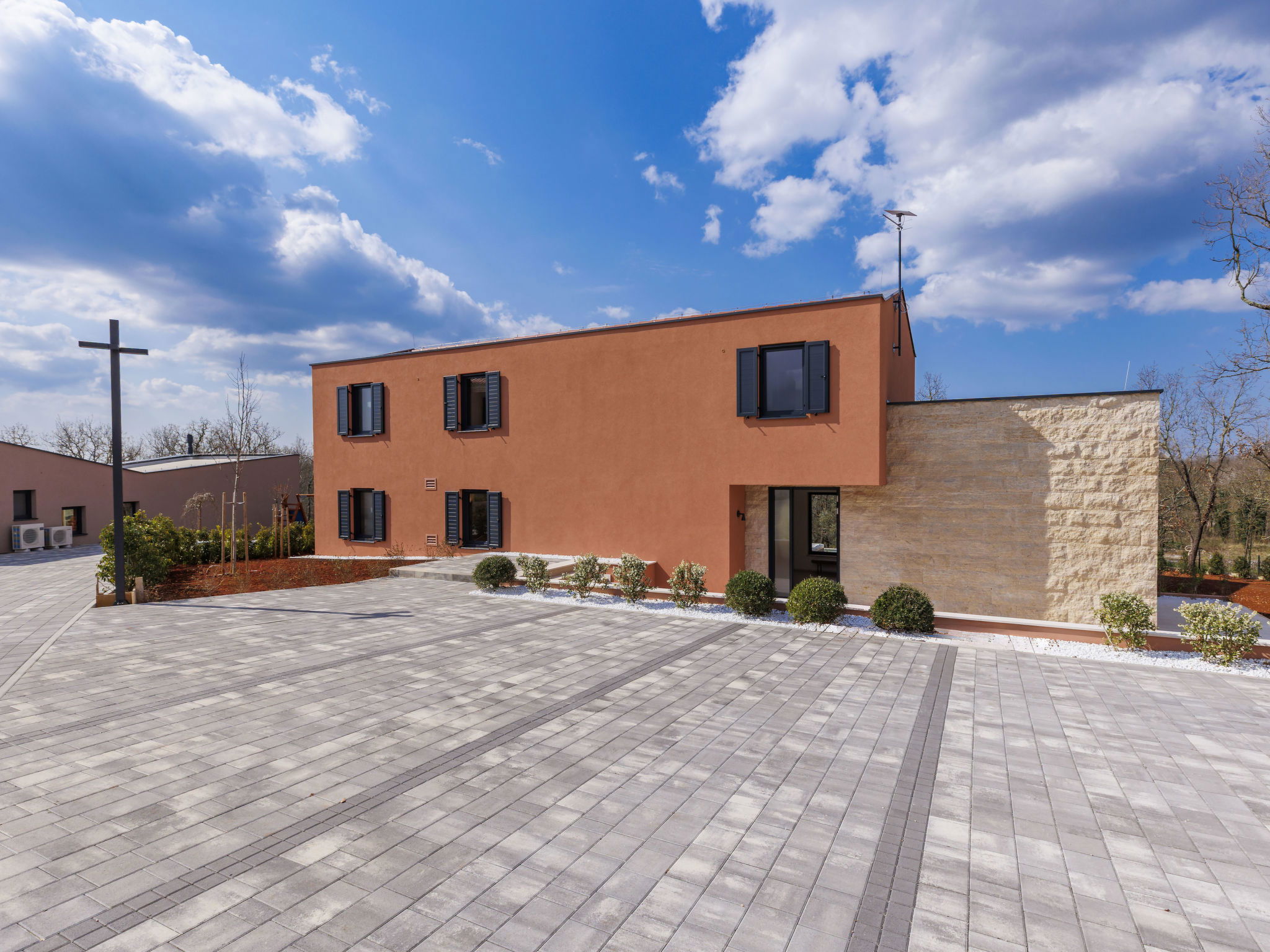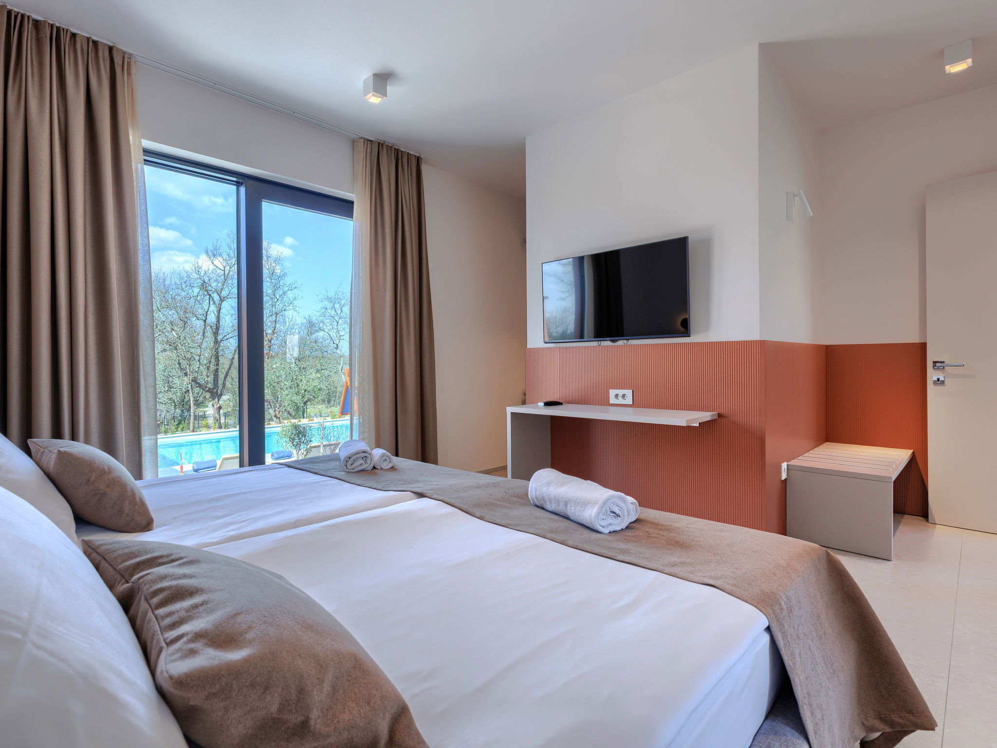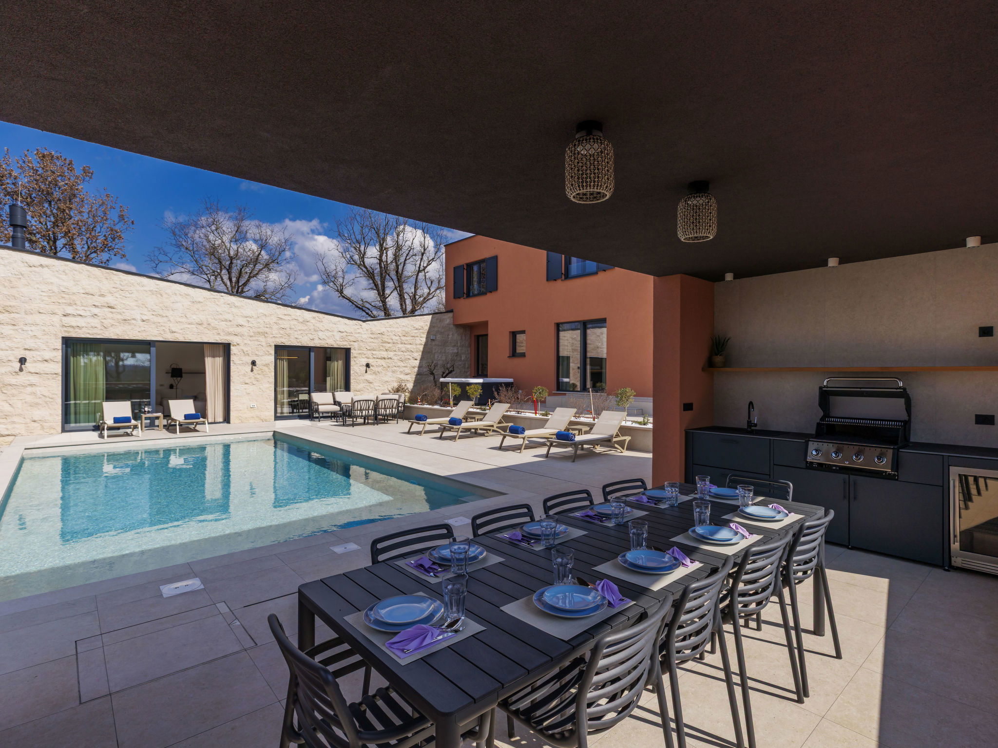 Beautiful, luxurious single-family house "La Terra", built in 2026. In the hamlet Banki 4 km from the centre of Tinjan, 12 km from the centre of Poreč, in a sunny position, 12 km from the sea. Private: property 1'594 m2 with lawn and wildlife garden, swimming pool angular (10 x 5 m, depth 145 cm, seasonal availability: 01.Apr. - 30.Sep.) with internal staircase. Outdoor shower, hot tub, terrace (20 m2), garden furniture, barbecue, children's playground (slide, swing), pool maintenance by the owner/gardener. In the house: internet access, sauna, fitness room, washing machine. Parking (for 5 cars) at the house on the premises. E-charging station. Shop 4 km, supermarket 11 km, restaurant 4 km, bus stop 4 km, pebble beach 12 km, rocky beach 12 km. Nearby attractions: Aquapark 18 km, Adrenalin park Kringa 7 km. The owner does not accept any youth groups.