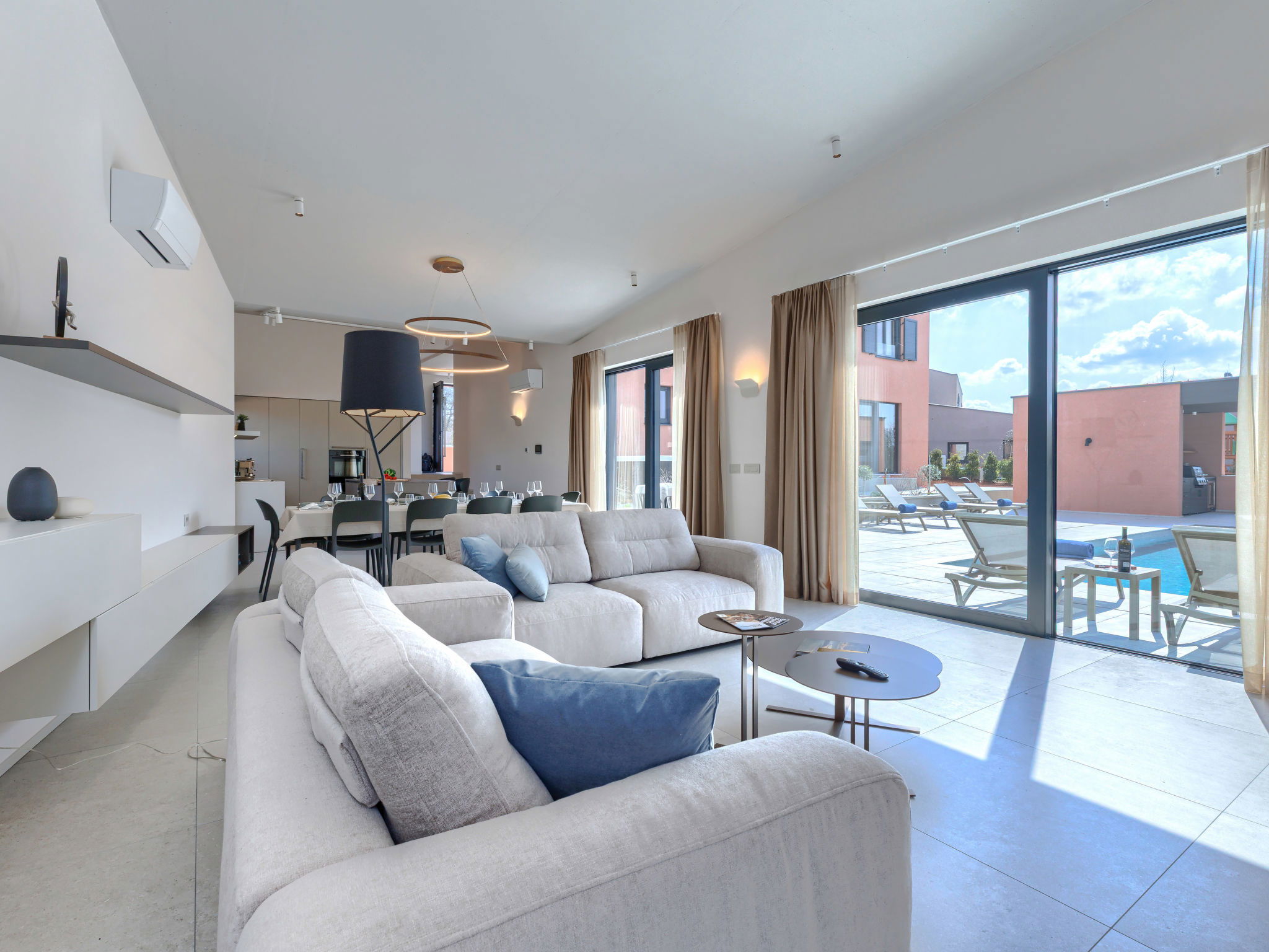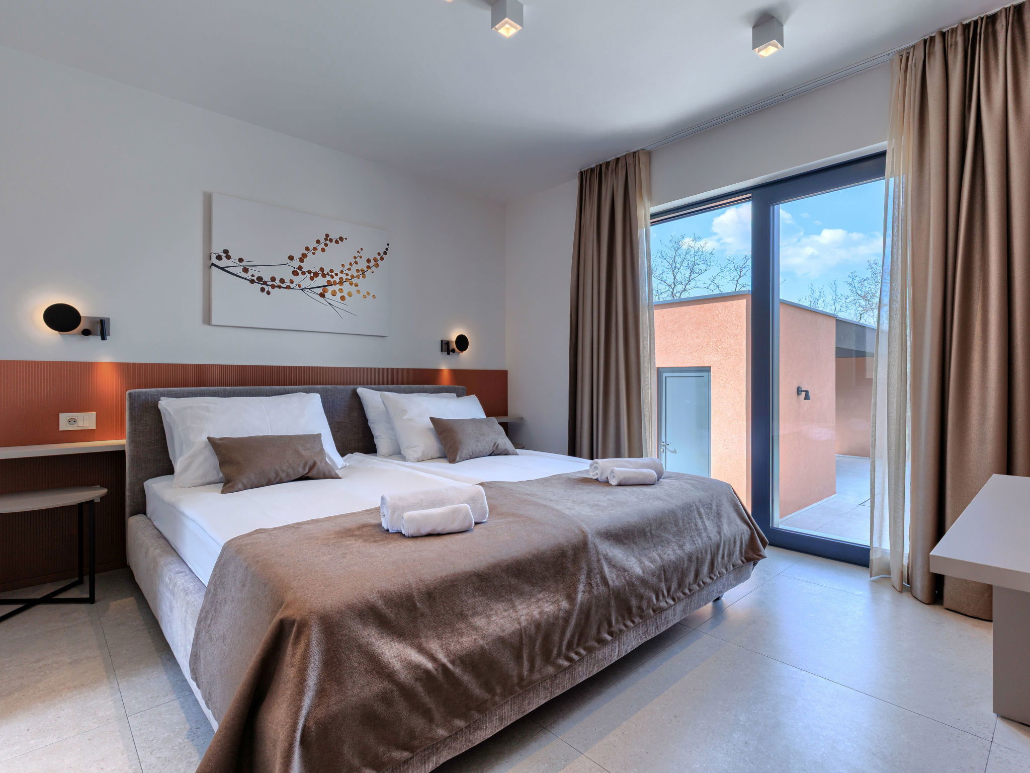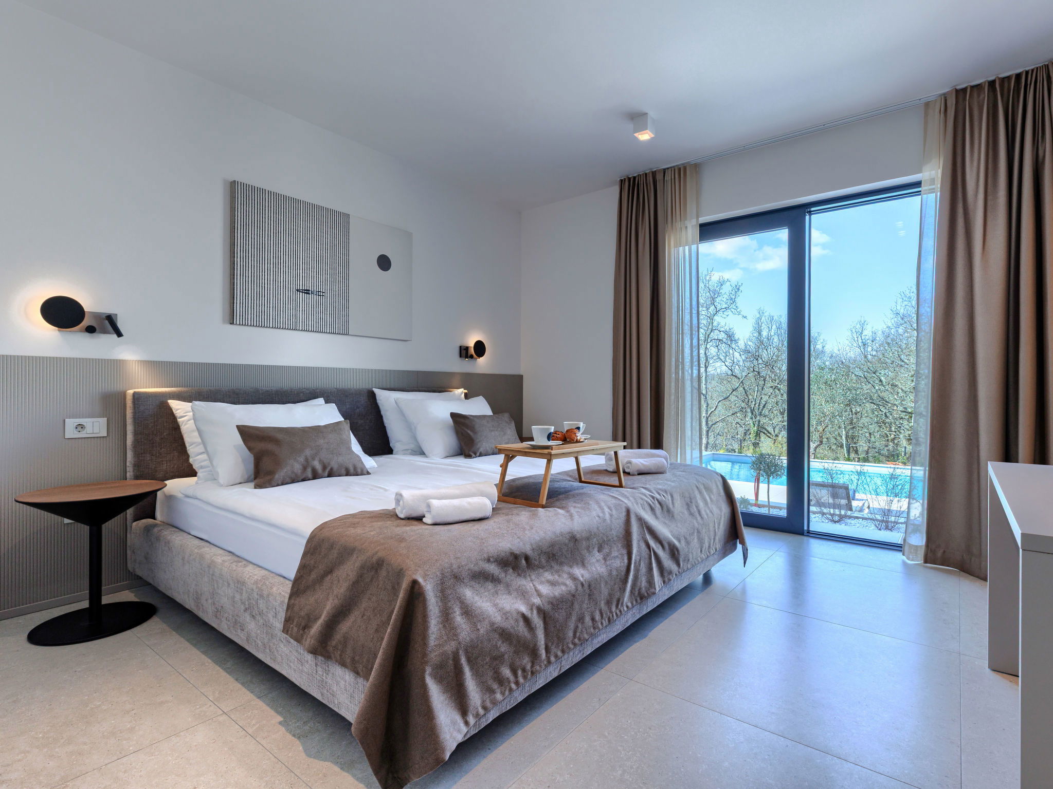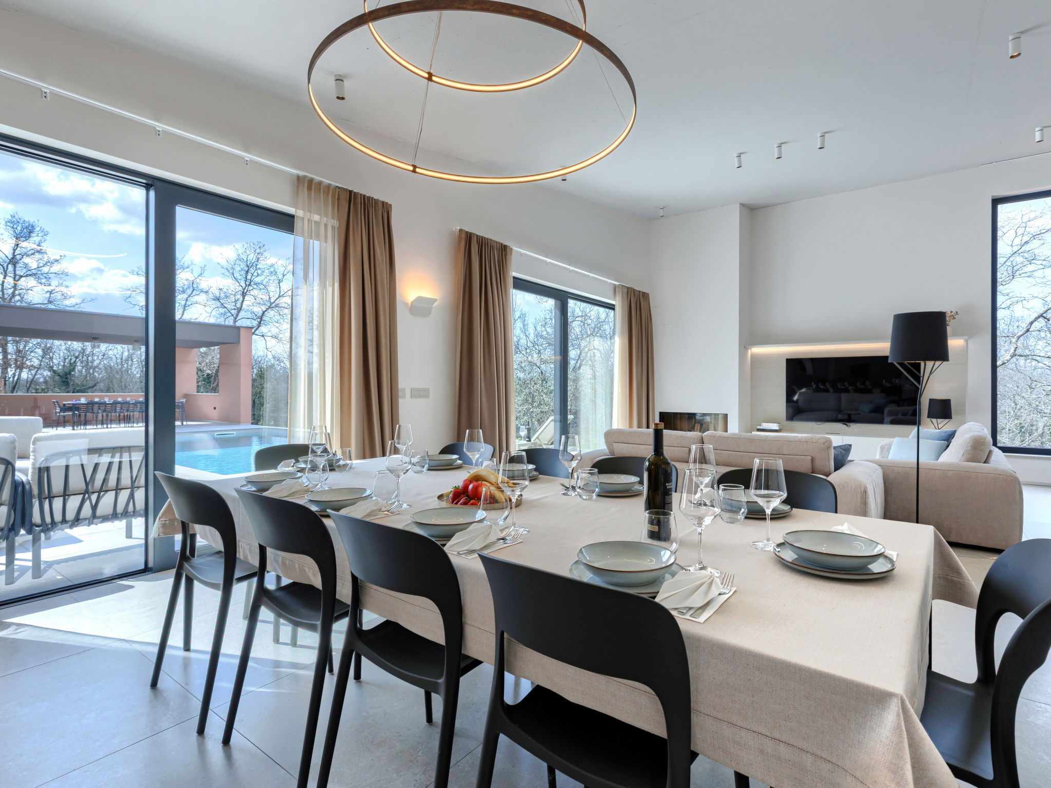 Beautiful, luxurious single-family house "La Terra", built in 2026. In the hamlet Banki 4 km from the centre of Tinjan, 12 km from the centre of Poreč, in a sunny position, 12 km from the sea. Private: property 1'594 m2 with lawn and wildlife garden, swimming pool angular (10 x 5 m, depth 145 cm, seasonal availability: 01.Apr. - 30.Sep.) with internal staircase. Outdoor shower, hot tub, terrace (20 m2), garden furniture, barbecue, children's playground (slide, swing), pool maintenance by the owner/gardener. In the house: internet access, sauna, fitness room, washing machine. Parking (for 5 cars) at the house on the premises. E-charging station. Shop 4 km, supermarket 11 km, restaurant 4 km, bus stop 4 km, pebble beach 12 km, rocky beach 12 km. Nearby attractions: Aquapark 18 km, Adrenalin park Kringa 7 km. The owner does not accept any youth groups.