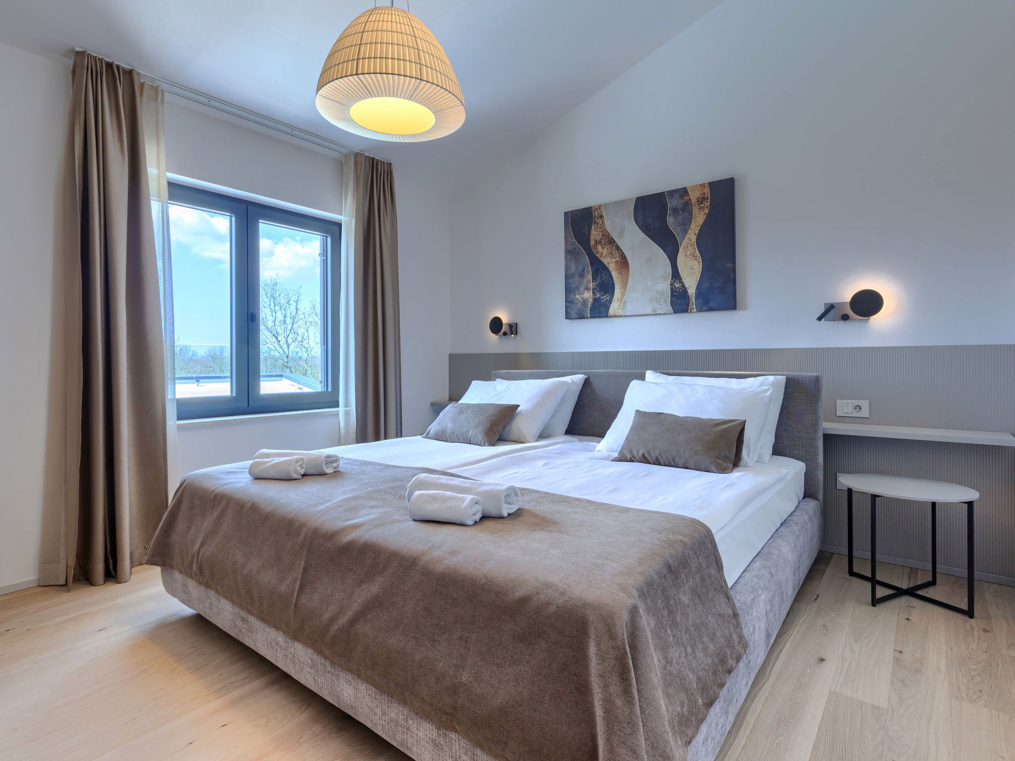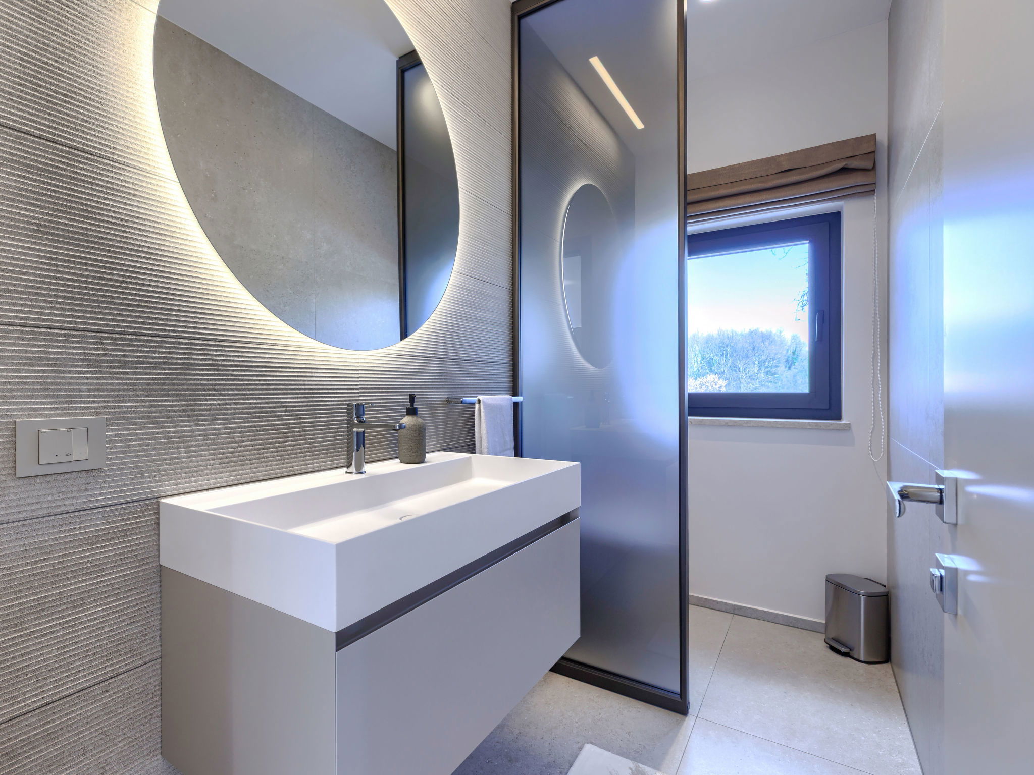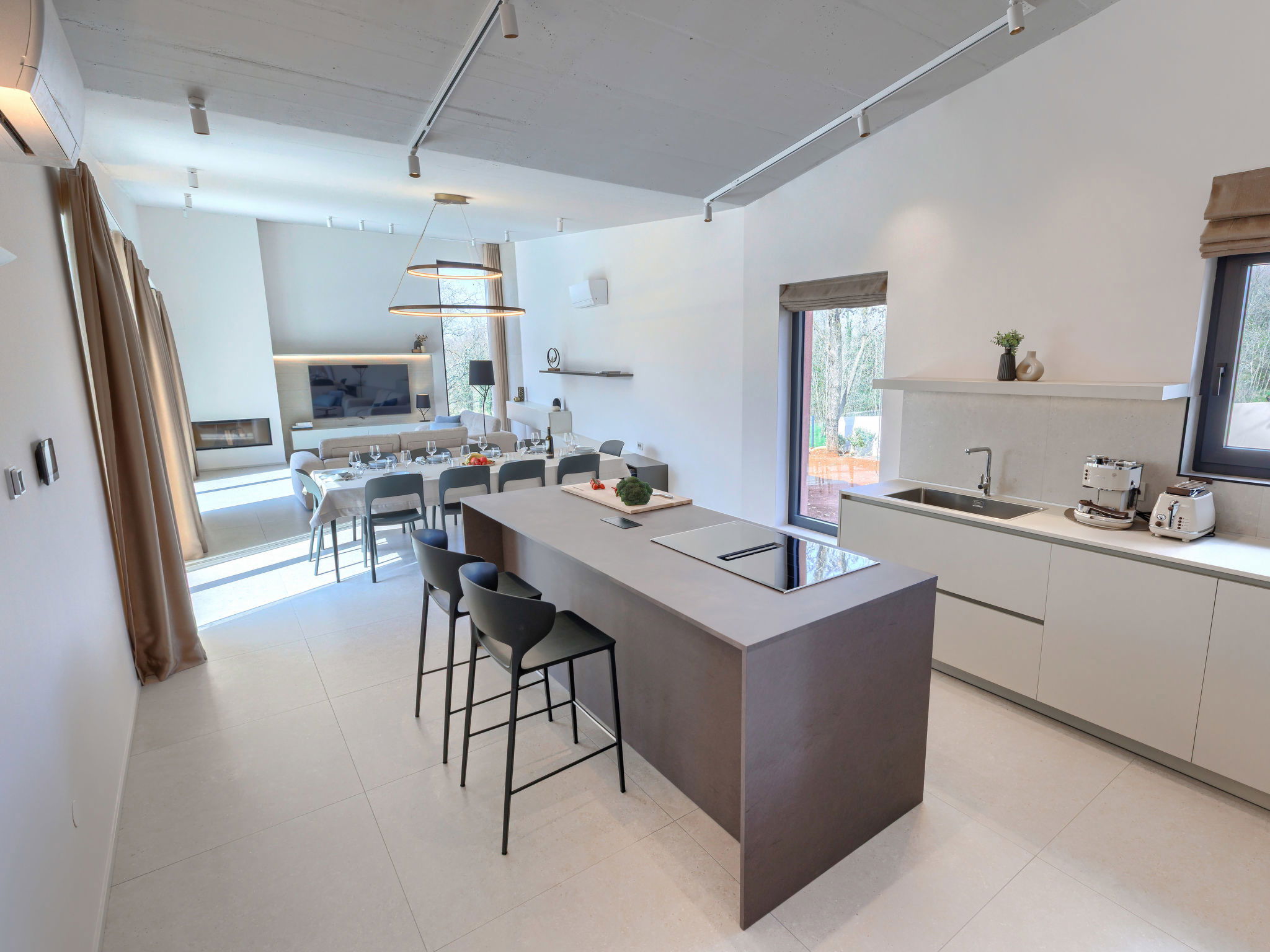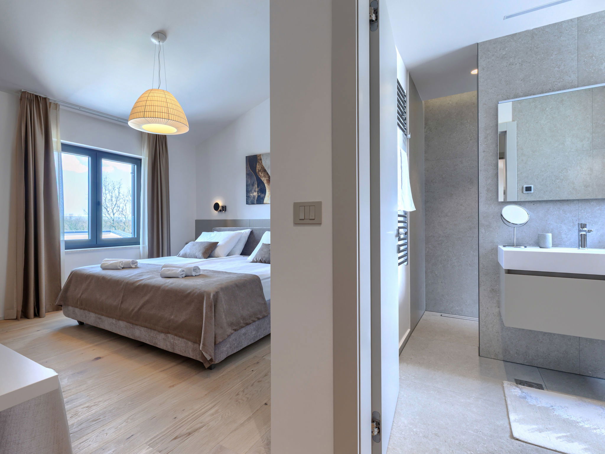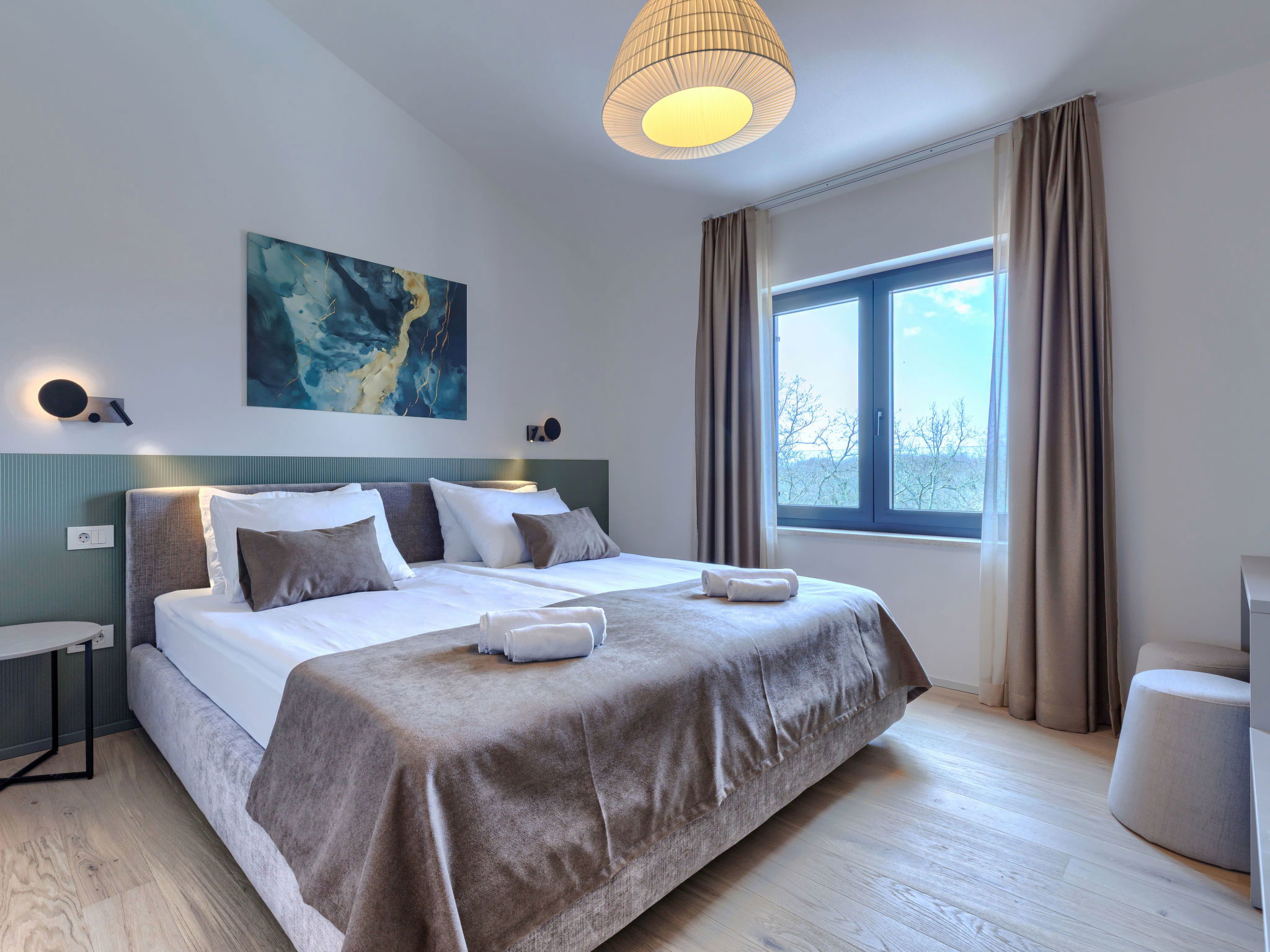 Beautiful, luxurious single-family house "La Terra", built in 2026. In the hamlet Banki 4 km from the centre of Tinjan, 12 km from the centre of Poreč, in a sunny position, 12 km from the sea. Private: property 1'594 m2 with lawn and wildlife garden, swimming pool angular (10 x 5 m, depth 145 cm, seasonal availability: 01.Apr. - 30.Sep.) with internal staircase. Outdoor shower, hot tub, terrace (20 m2), garden furniture, barbecue, children's playground (slide, swing), pool maintenance by the owner/gardener. In the house: internet access, sauna, fitness room, washing machine. Parking (for 5 cars) at the house on the premises. E-charging station. Shop 4 km, supermarket 11 km, restaurant 4 km, bus stop 4 km, pebble beach 12 km, rocky beach 12 km. Nearby attractions: Aquapark 18 km, Adrenalin park Kringa 7 km. The owner does not accept any youth groups.