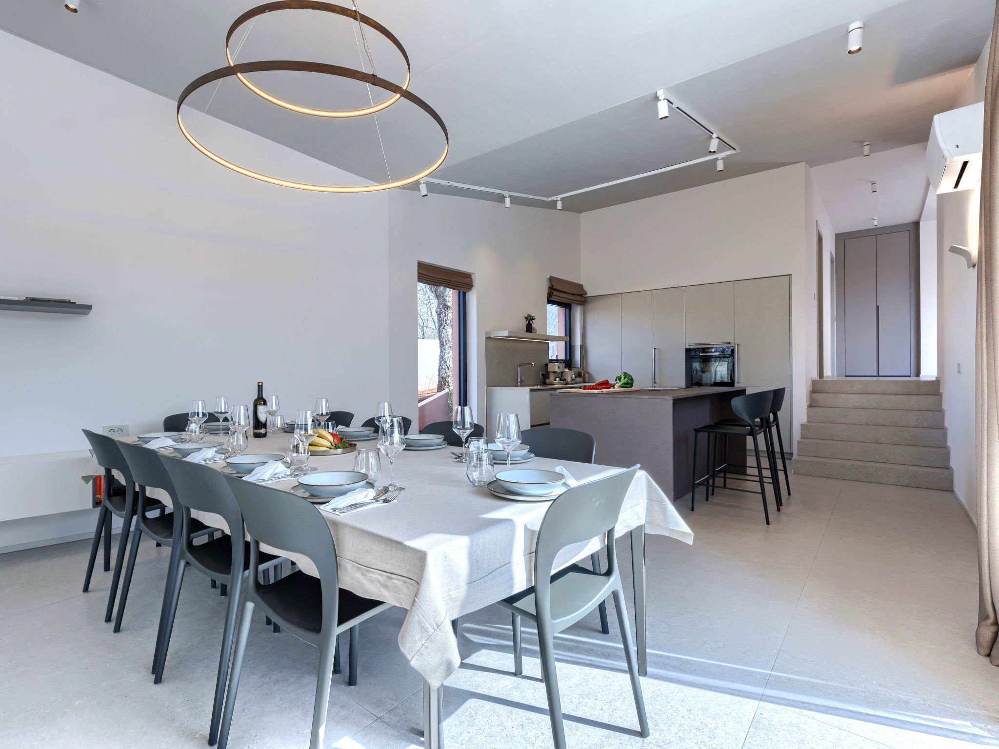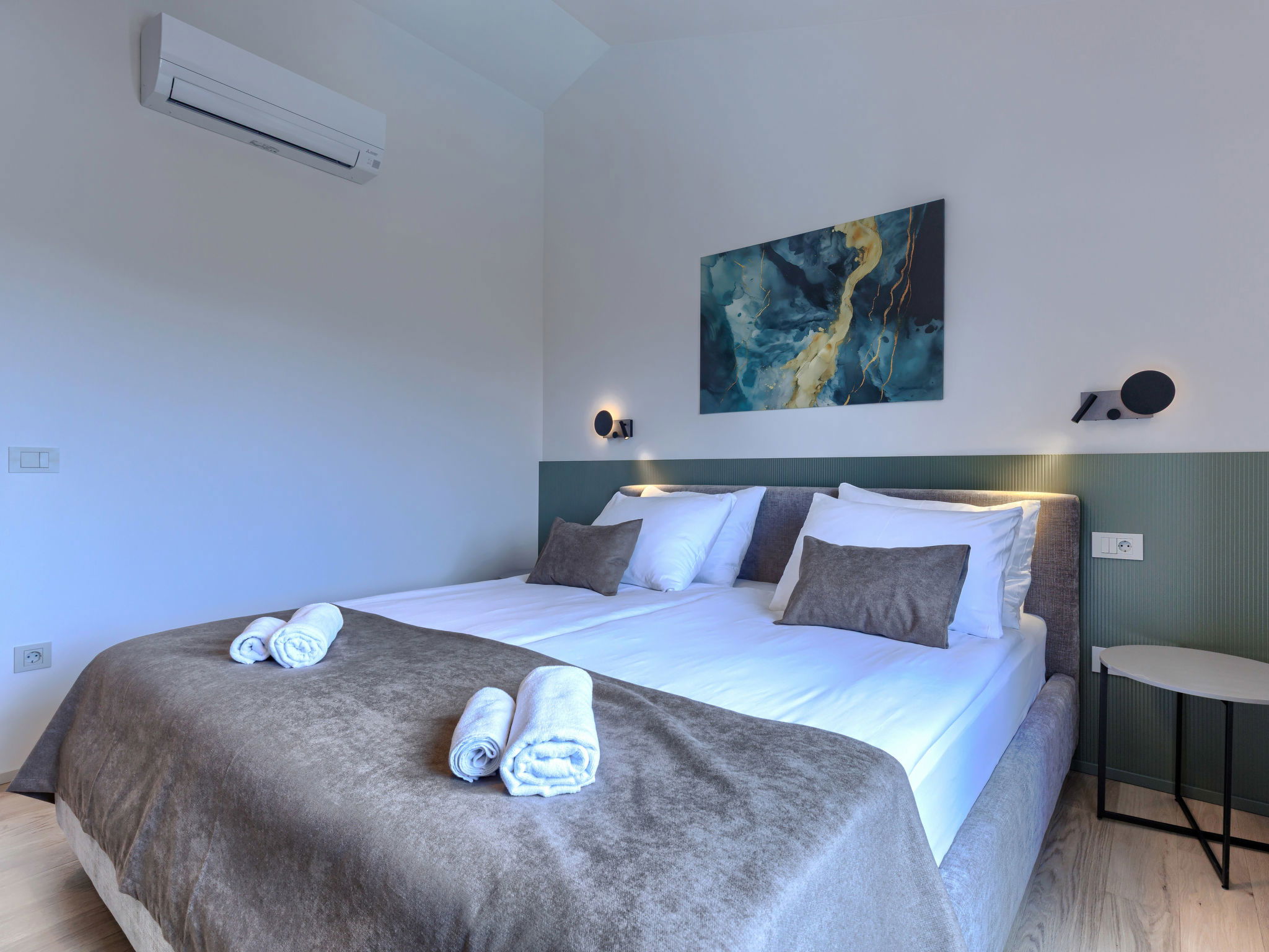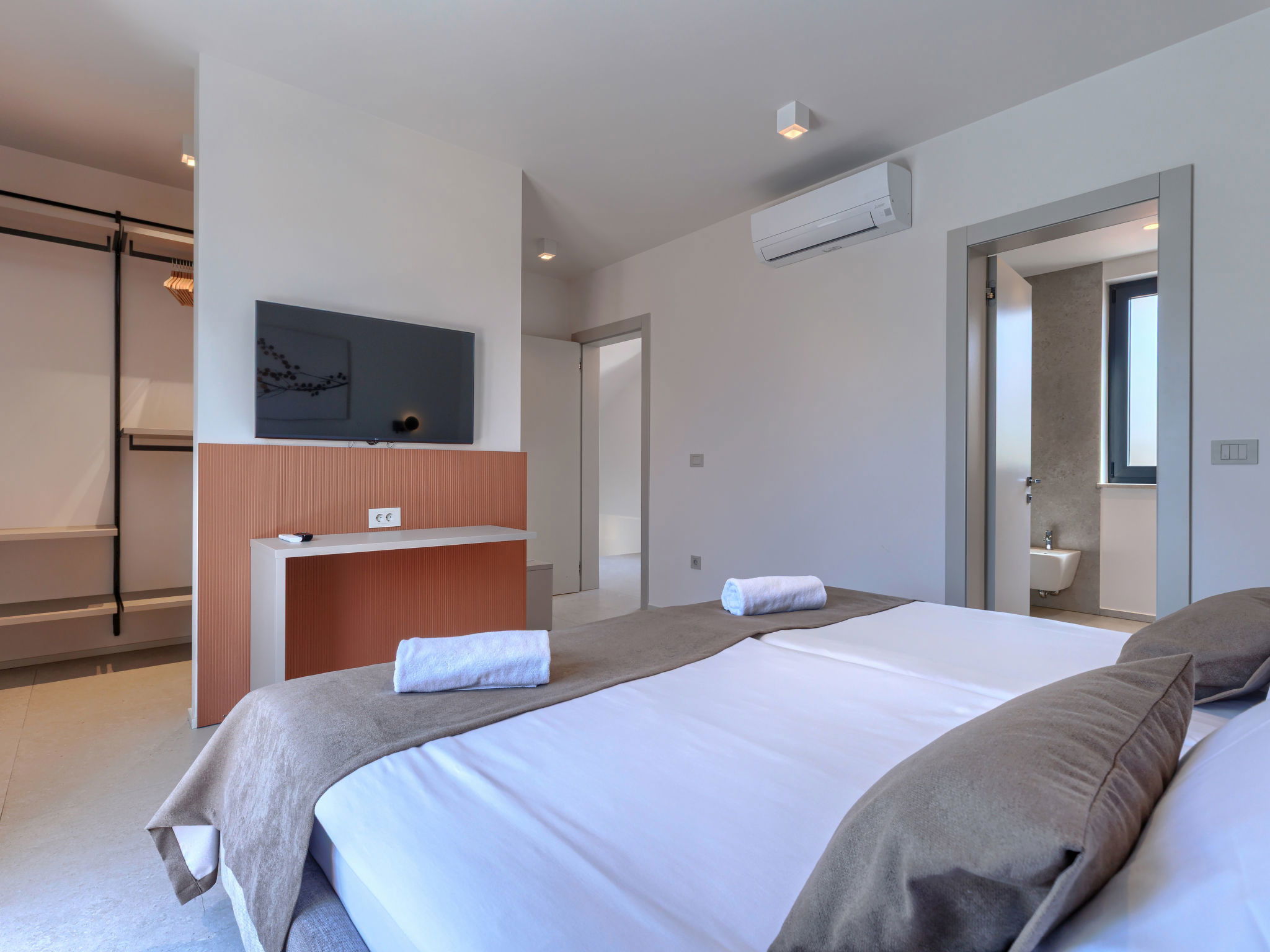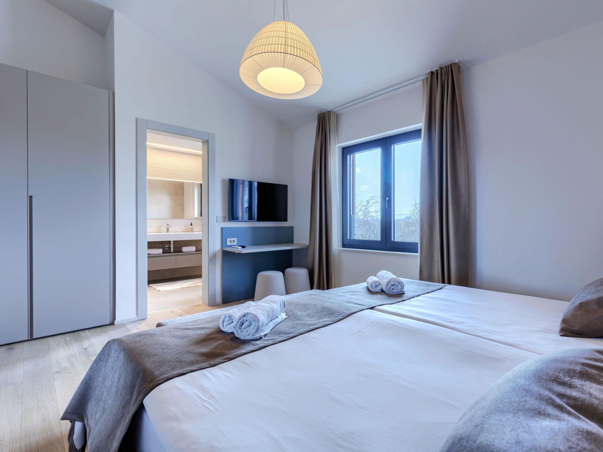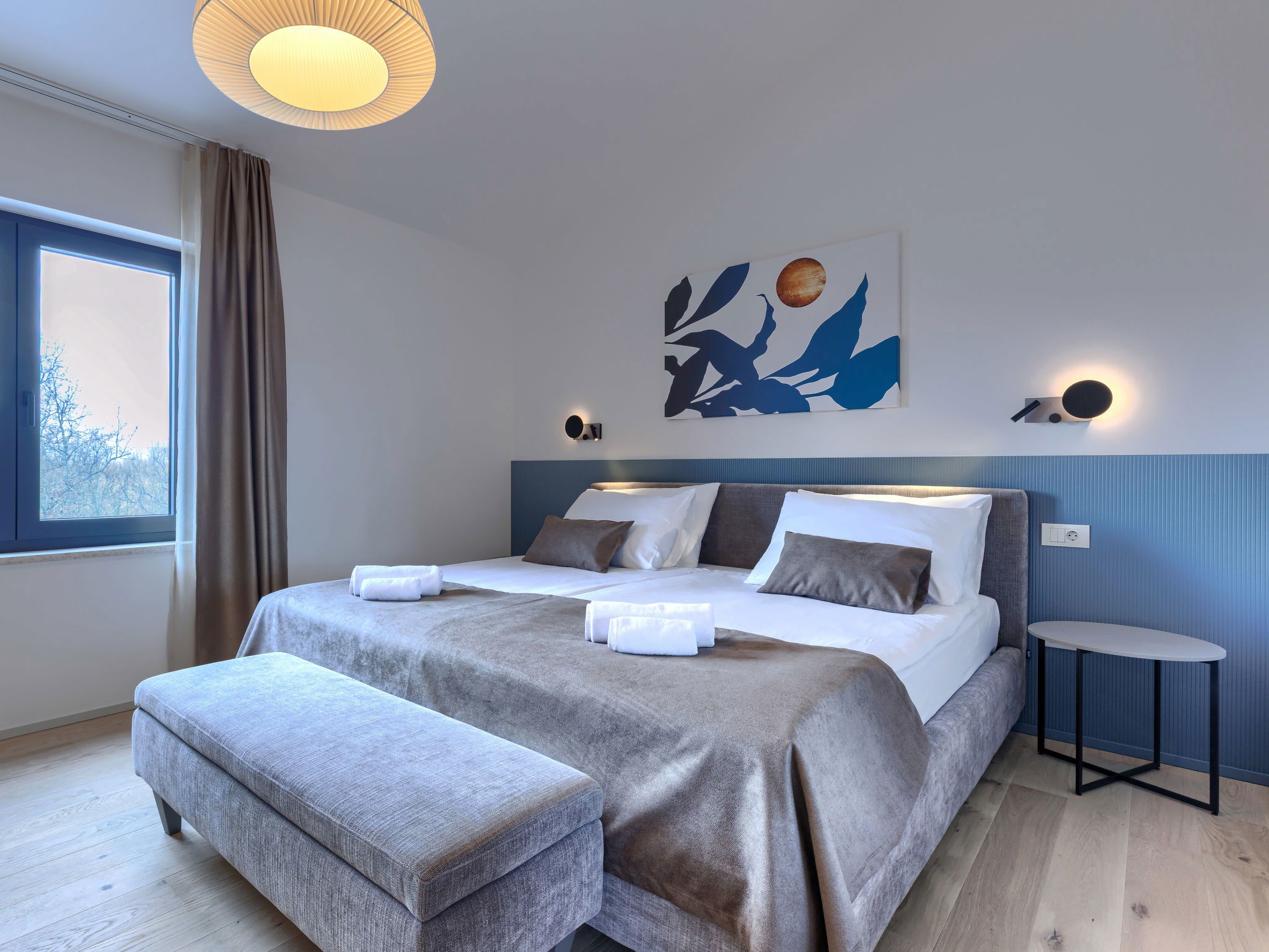 Beautiful, luxurious single-family house "La Terra", built in 2026. In the hamlet Banki 4 km from the centre of Tinjan, 12 km from the centre of Poreč, in a sunny position, 12 km from the sea. Private: property 1'594 m2 with lawn and wildlife garden, swimming pool angular (10 x 5 m, depth 145 cm, seasonal availability: 01.Apr. - 30.Sep.) with internal staircase. Outdoor shower, hot tub, terrace (20 m2), garden furniture, barbecue, children's playground (slide, swing), pool maintenance by the owner/gardener. In the house: internet access, sauna, fitness room, washing machine. Parking (for 5 cars) at the house on the premises. E-charging station. Shop 4 km, supermarket 11 km, restaurant 4 km, bus stop 4 km, pebble beach 12 km, rocky beach 12 km. Nearby attractions: Aquapark 18 km, Adrenalin park Kringa 7 km. The owner does not accept any youth groups.