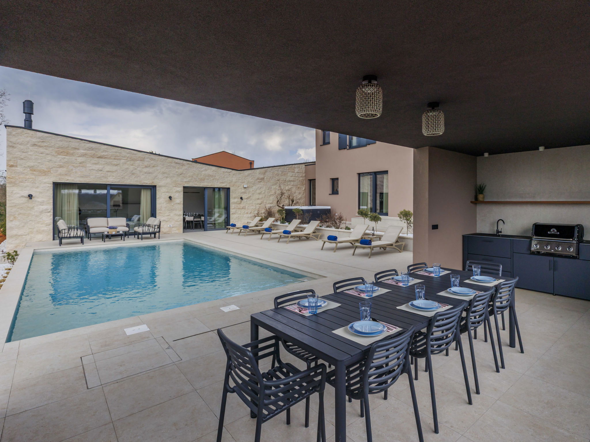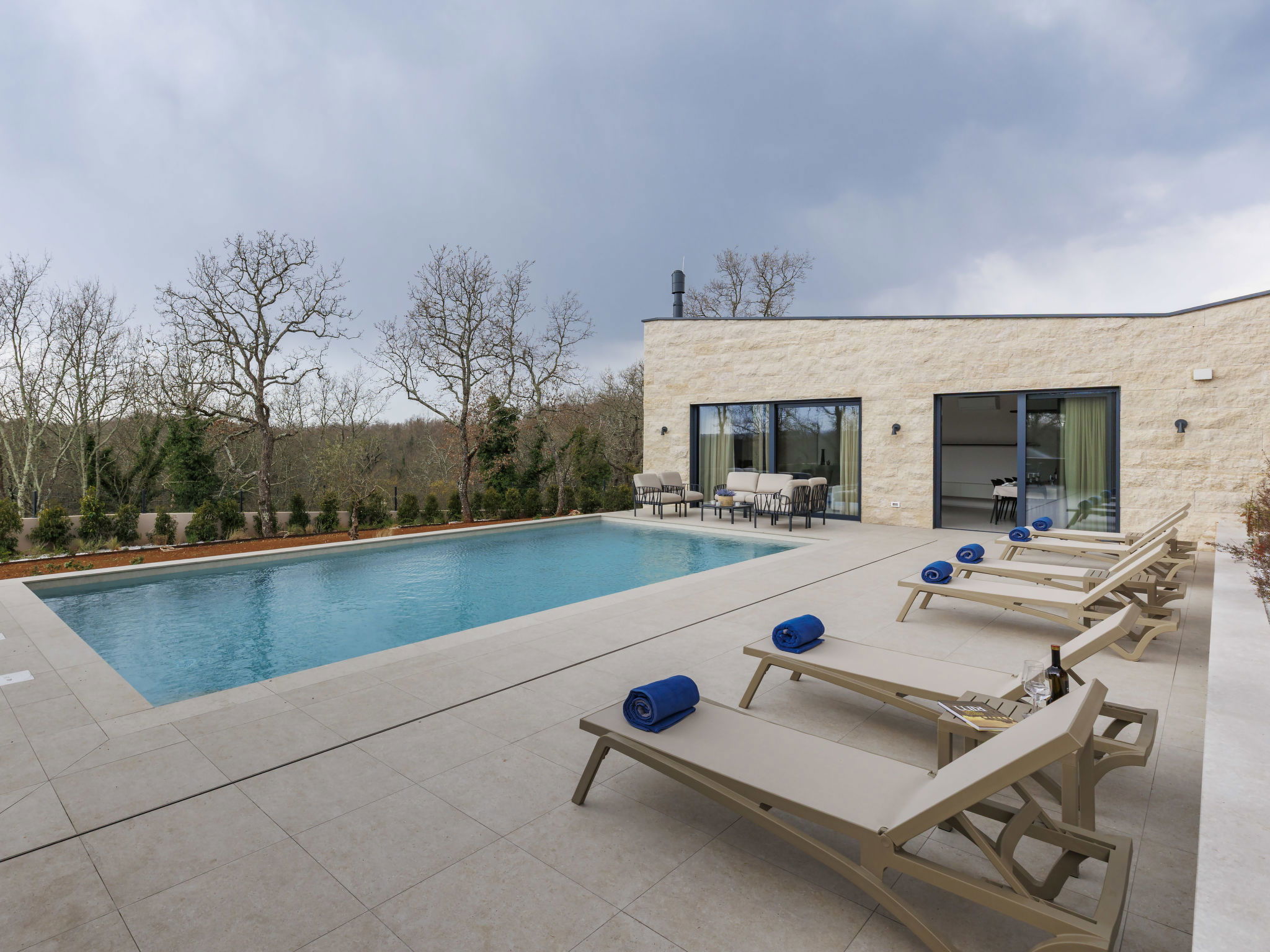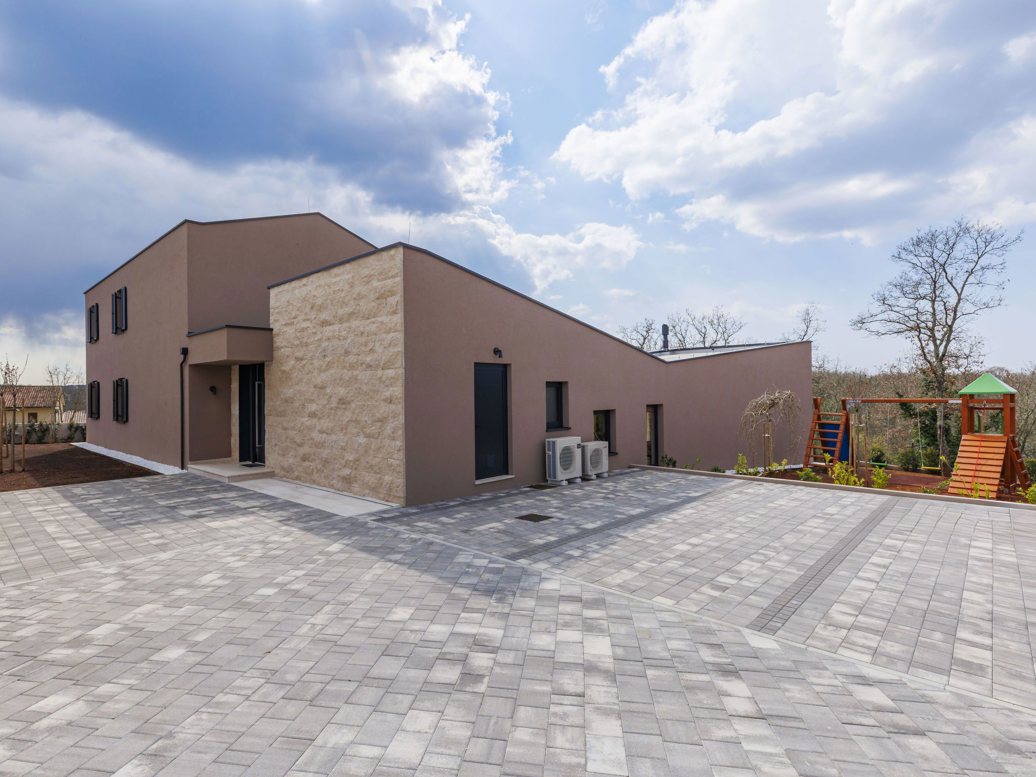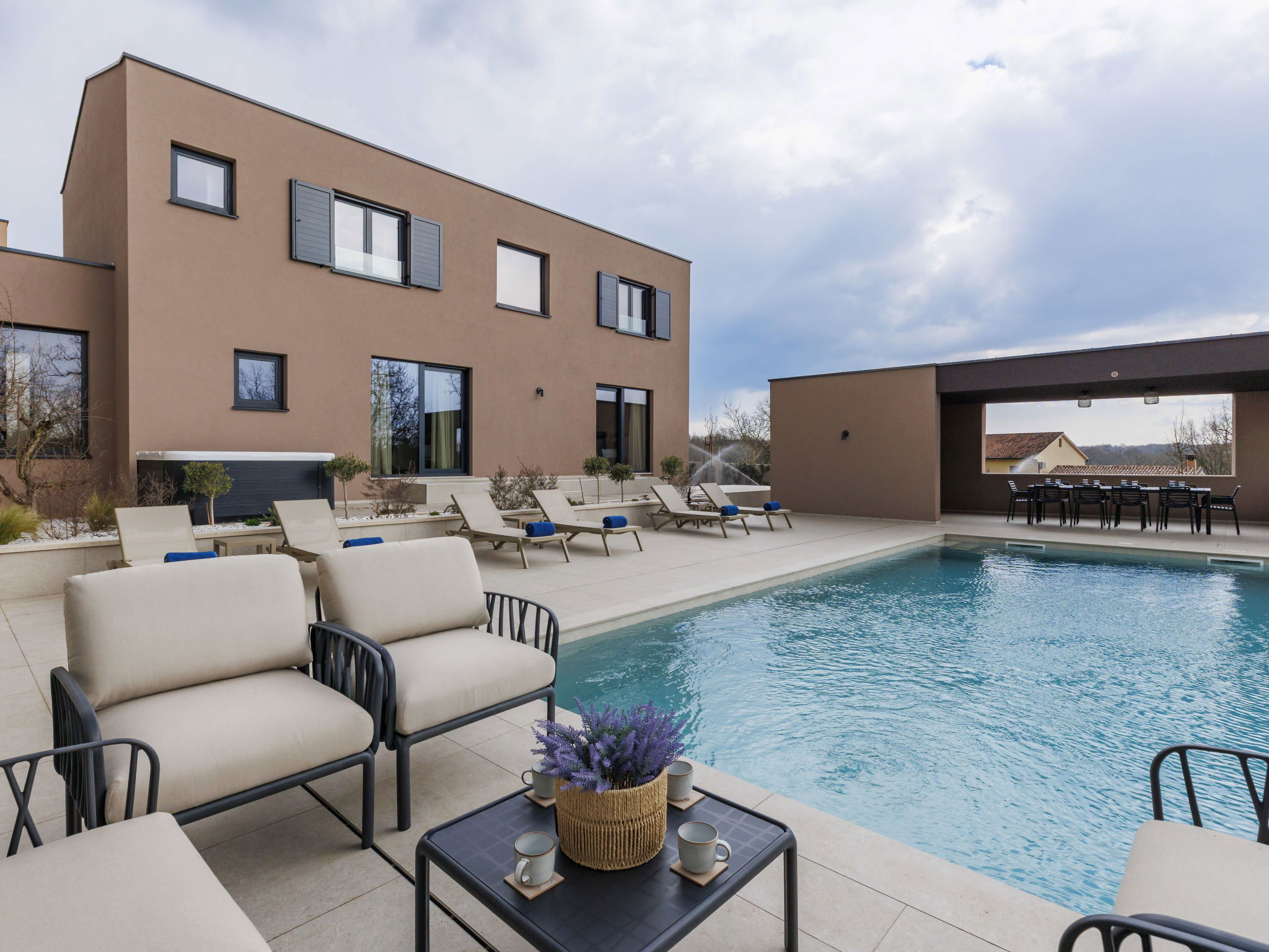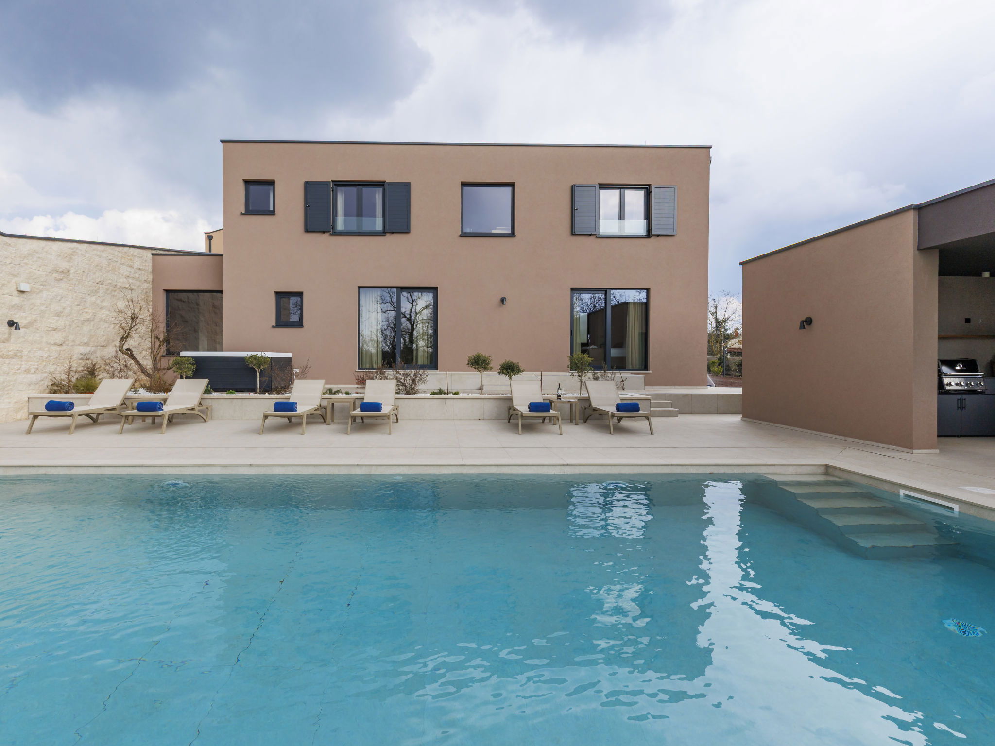 Beautiful, luxurious single-family house "La Mari", 2 storeys, built in 2026. In the hamlet Banki 4 km from the centre of Tinjan, 12 km from the centre of Poreč, in a sunny position, 12 km from the sea. Private: property 1'399 m2 with lawn and wildlife garden, swimming pool angular (10 x 5 m, depth 145 cm, seasonal availability: 01.Apr. - 30.Sep.) with internal staircase. Outdoor shower, hot tub, terrace (20 m2), garden furniture, barbecue, children's playground (slide, swing), pool maintenance by the owner/gardener. In the house: internet access, sauna, washing machine. Parking (for 4 cars) at the house on the premises. E-charging station. Shop 4 km, supermarket 11 km, restaurant 4 km, bus stop 4 km, pebble beach 12 km, rocky beach 12 km. Nearby attractions: Aquapark 18 km, Adrenalin park Kringa 7 km. The owner does not accept any youth groups.