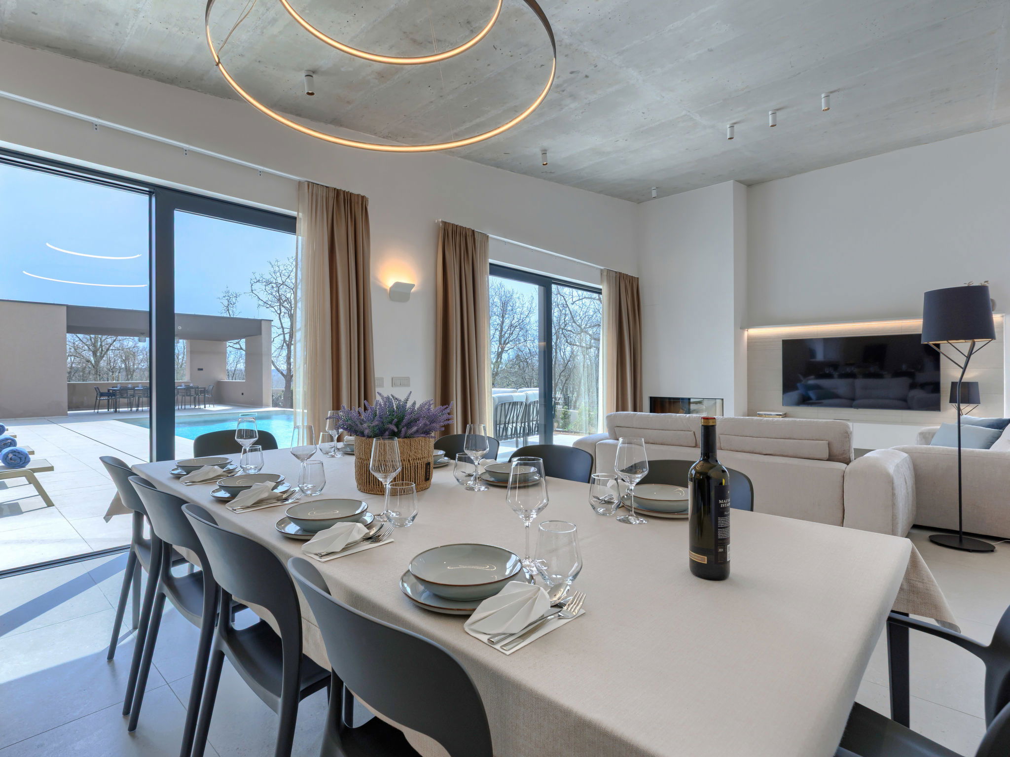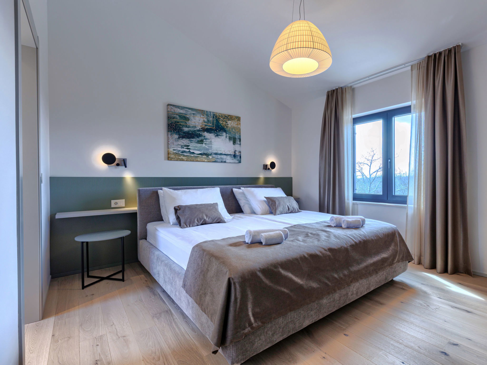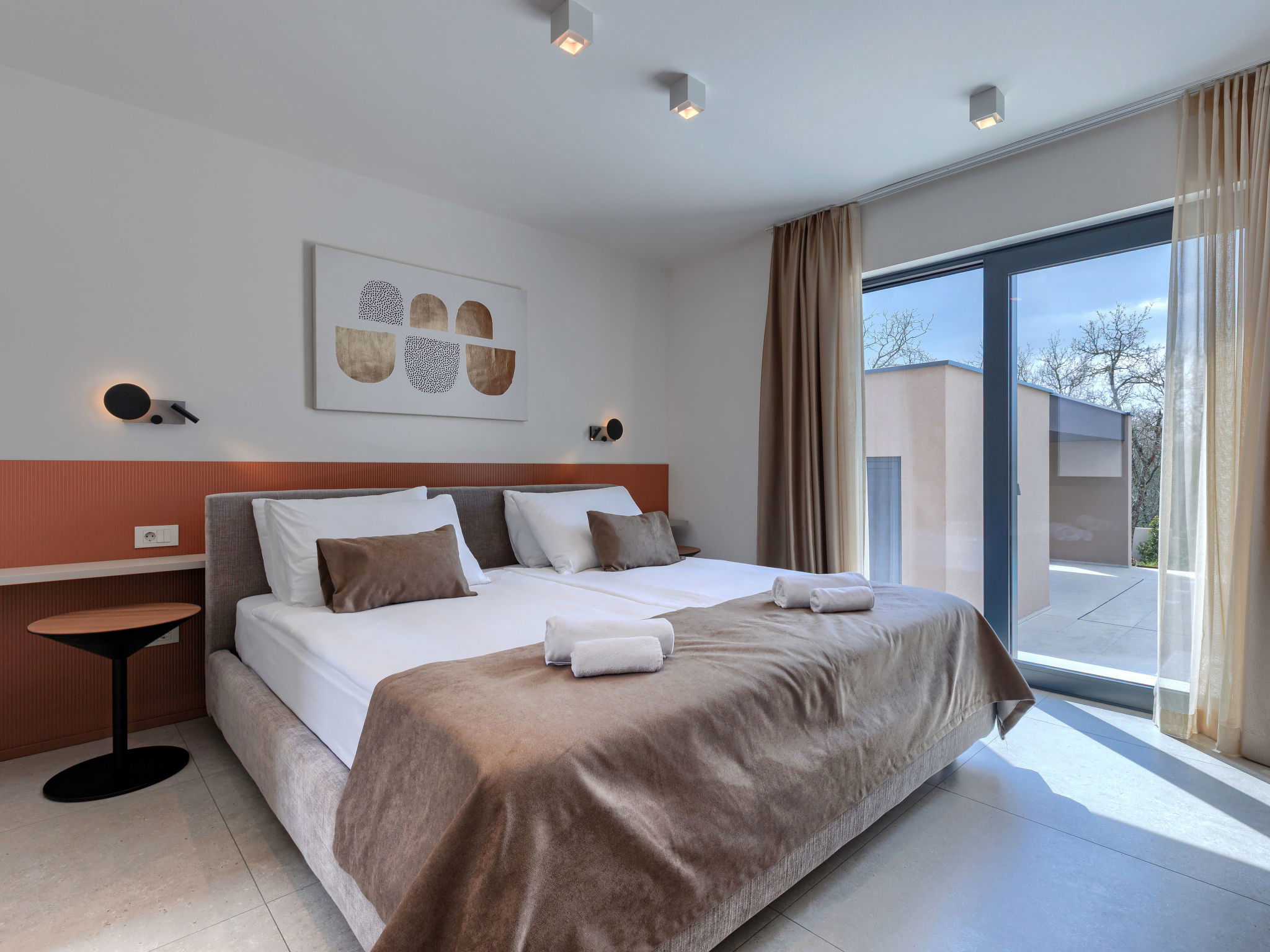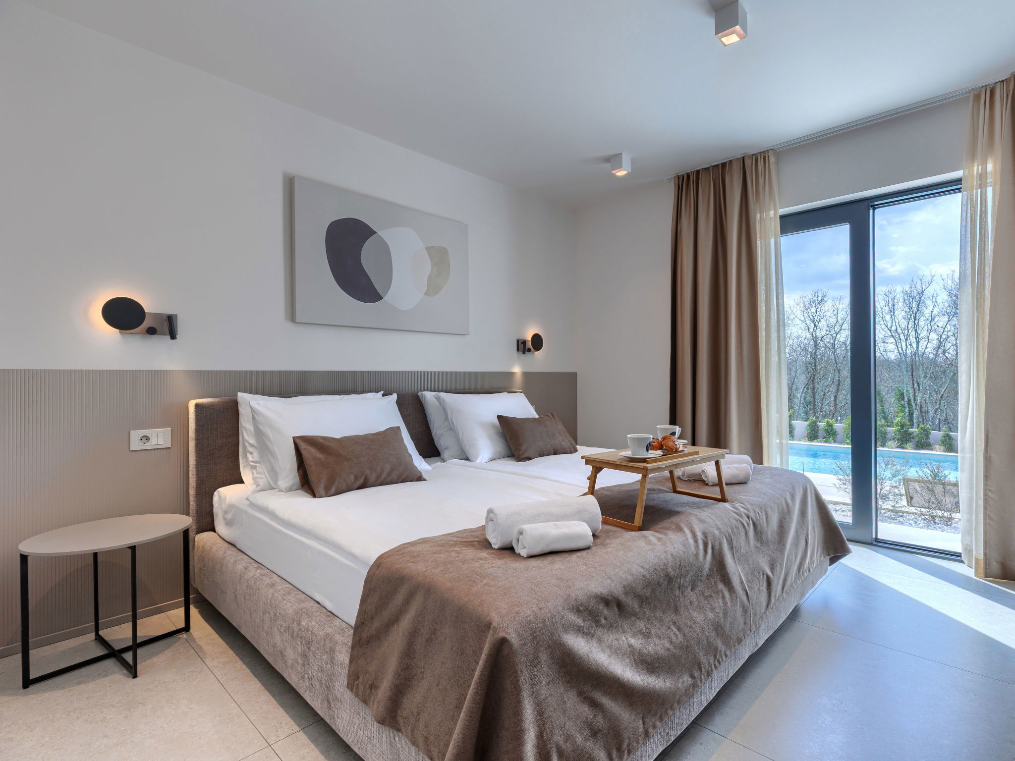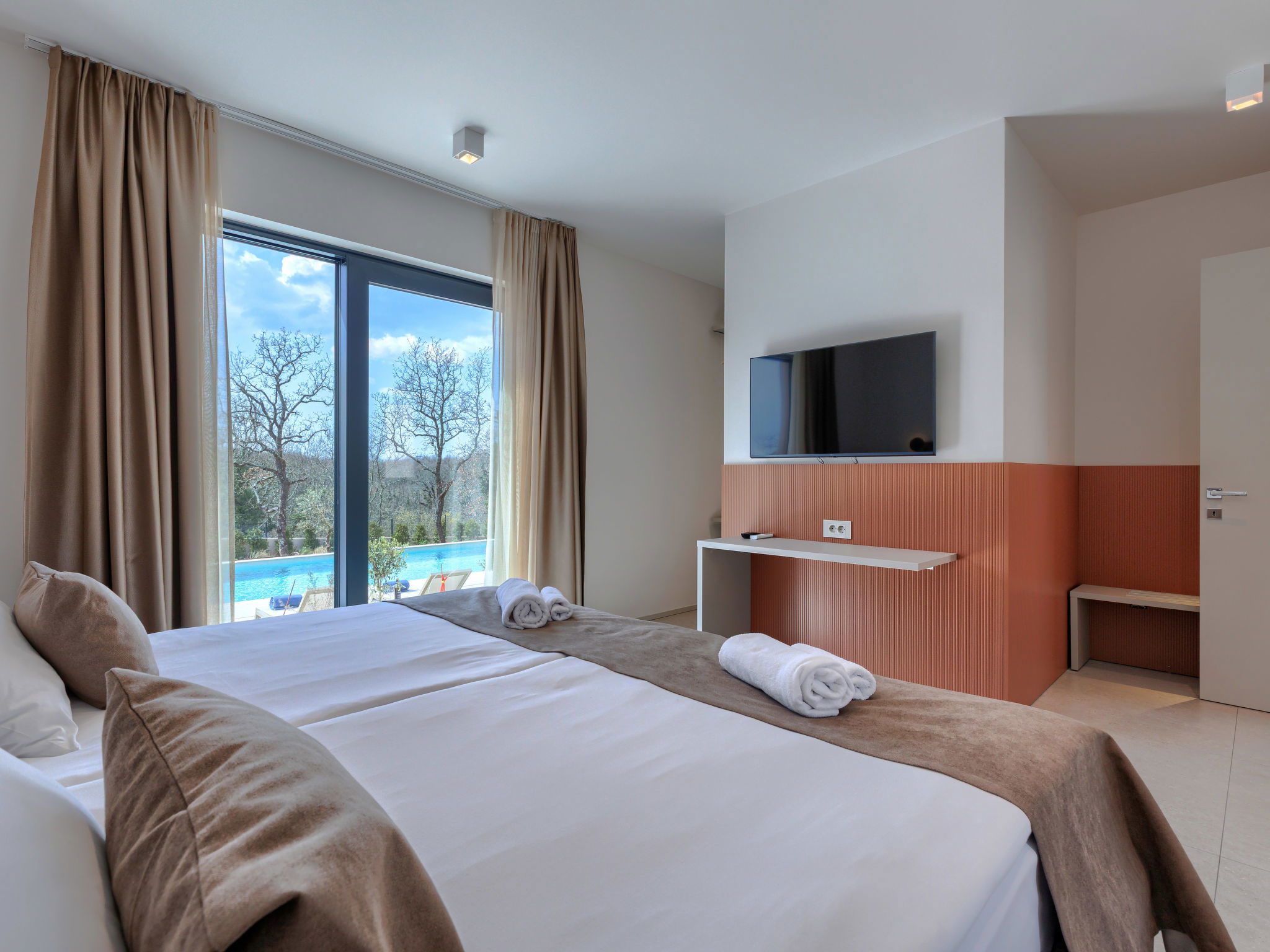 Beautiful, luxurious single-family house "La Mari", 2 storeys, built in 2026. In the hamlet Banki 4 km from the centre of Tinjan, 12 km from the centre of Poreč, in a sunny position, 12 km from the sea. Private: property 1'399 m2 with lawn and wildlife garden, swimming pool angular (10 x 5 m, depth 145 cm, seasonal availability: 01.Apr. - 30.Sep.) with internal staircase. Outdoor shower, hot tub, terrace (20 m2), garden furniture, barbecue, children's playground (slide, swing), pool maintenance by the owner/gardener. In the house: internet access, sauna, washing machine. Parking (for 4 cars) at the house on the premises. E-charging station. Shop 4 km, supermarket 11 km, restaurant 4 km, bus stop 4 km, pebble beach 12 km, rocky beach 12 km. Nearby attractions: Aquapark 18 km, Adrenalin park Kringa 7 km. The owner does not accept any youth groups.