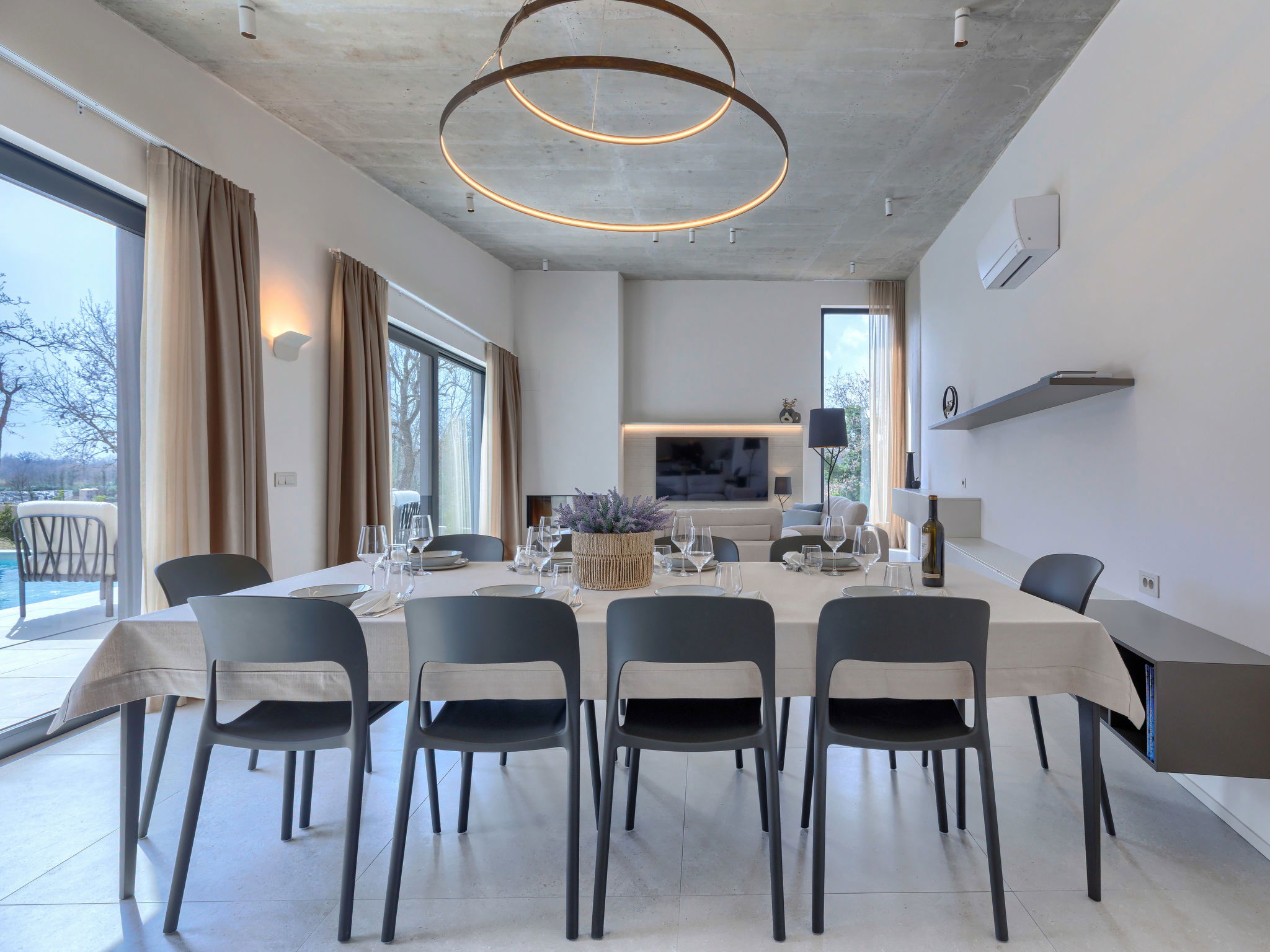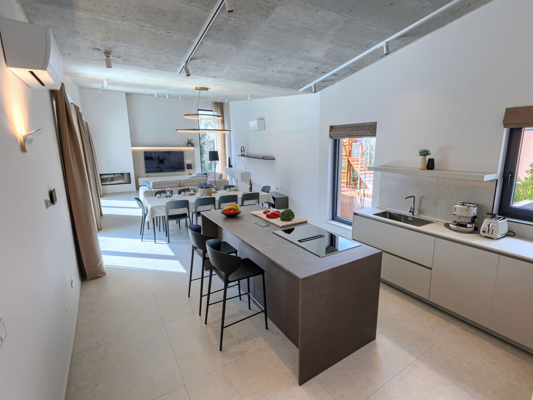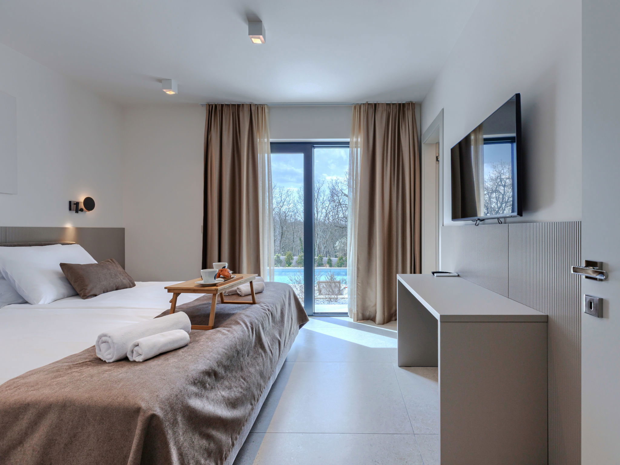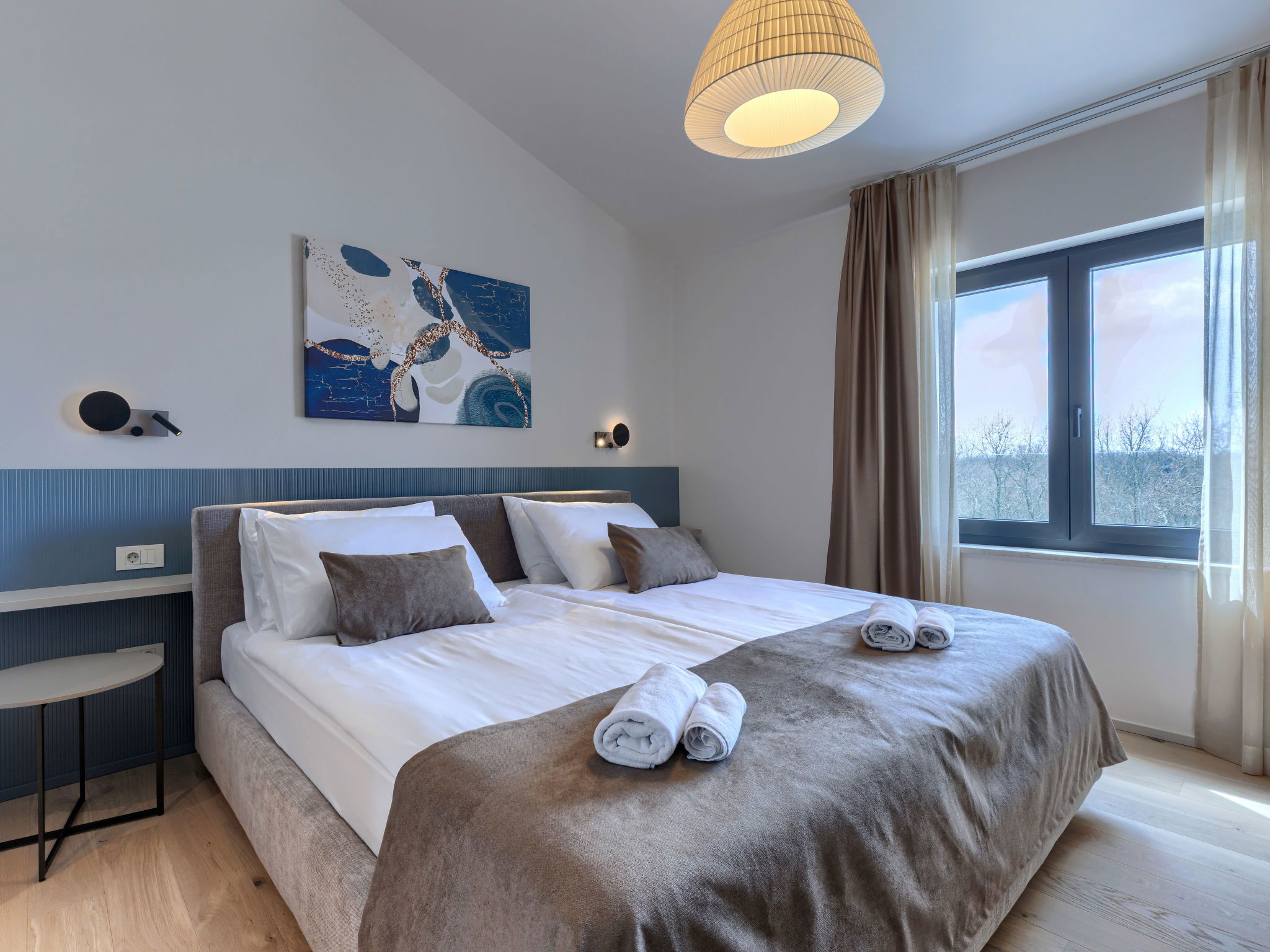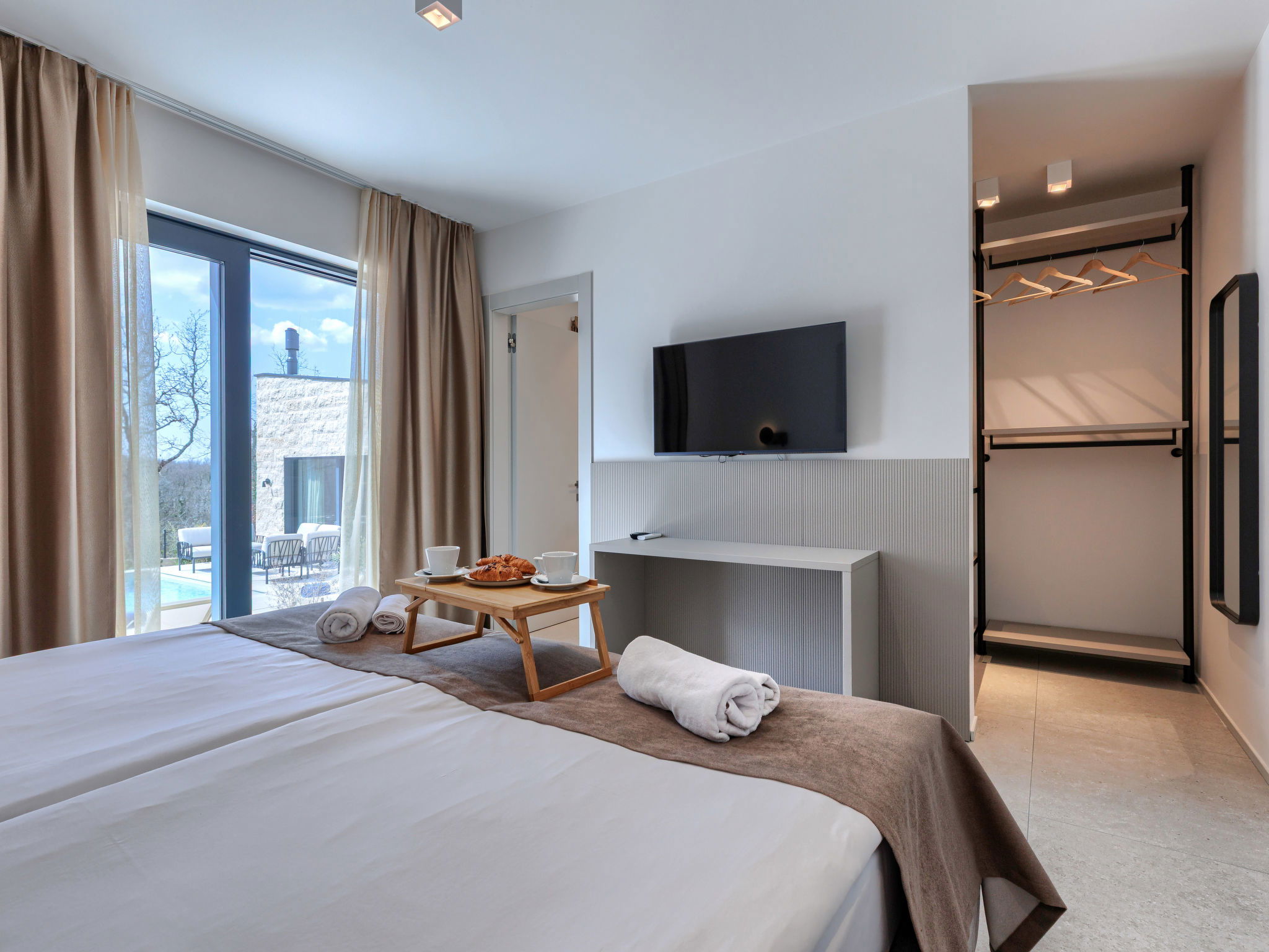 Beautiful, luxurious single-family house "La Mari", 2 storeys, built in 2026. In the hamlet Banki 4 km from the centre of Tinjan, 12 km from the centre of Poreč, in a sunny position, 12 km from the sea. Private: property 1'399 m2 with lawn and wildlife garden, swimming pool angular (10 x 5 m, depth 145 cm, seasonal availability: 01.Apr. - 30.Sep.) with internal staircase. Outdoor shower, hot tub, terrace (20 m2), garden furniture, barbecue, children's playground (slide, swing), pool maintenance by the owner/gardener. In the house: internet access, sauna, washing machine. Parking (for 4 cars) at the house on the premises. E-charging station. Shop 4 km, supermarket 11 km, restaurant 4 km, bus stop 4 km, pebble beach 12 km, rocky beach 12 km. Nearby attractions: Aquapark 18 km, Adrenalin park Kringa 7 km. The owner does not accept any youth groups.
