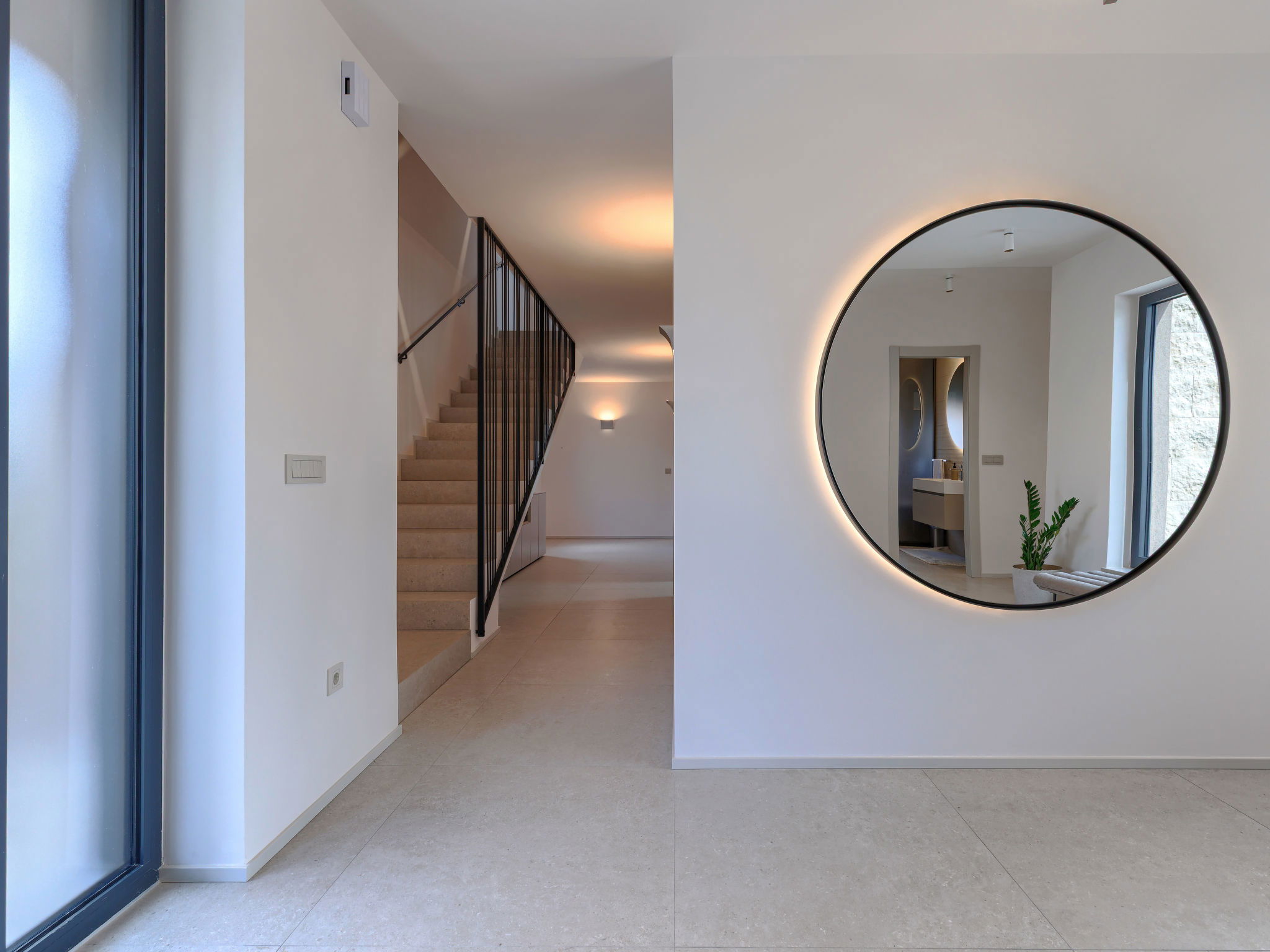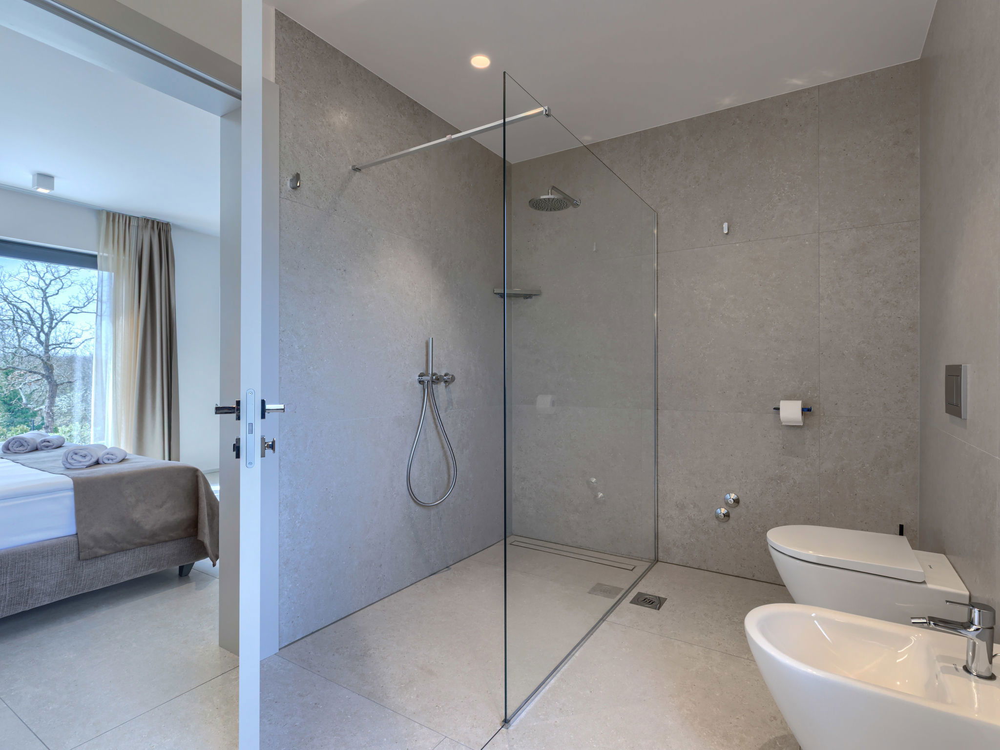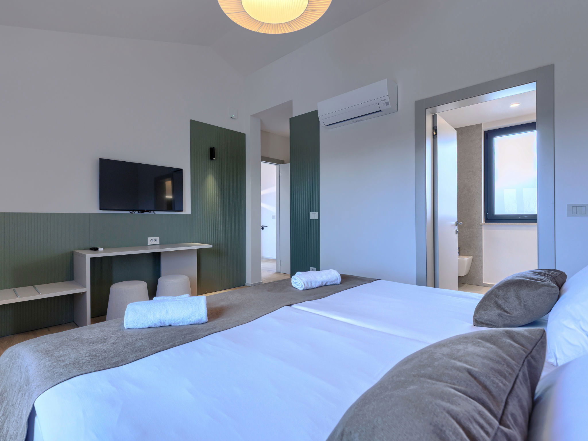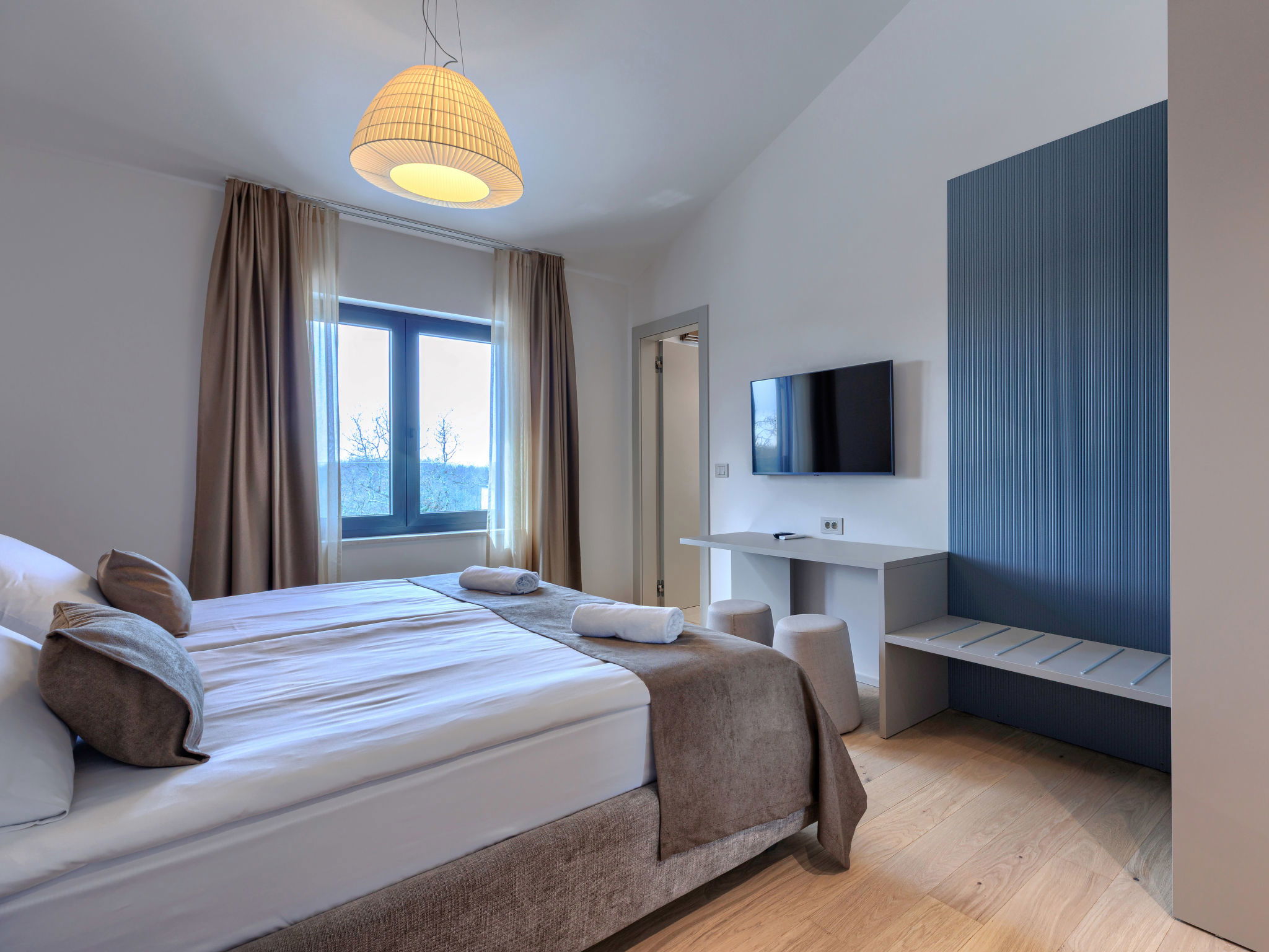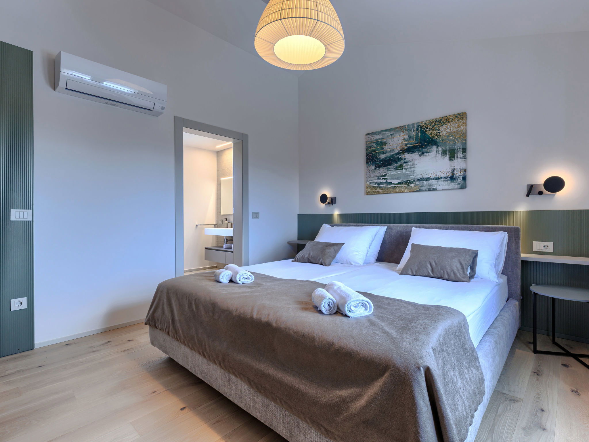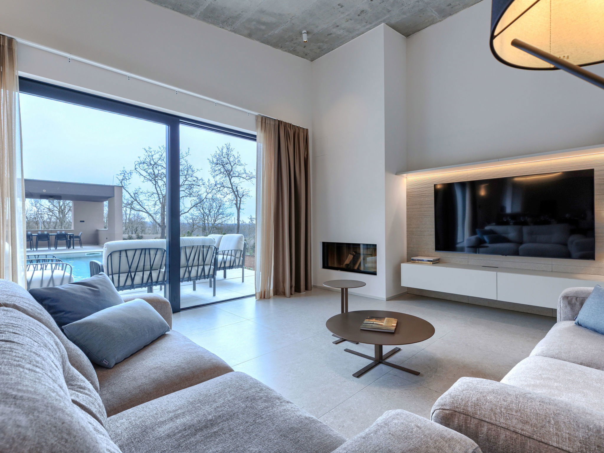 Beautiful, luxurious single-family house "La Mari", 2 storeys, built in 2026. In the hamlet Banki 4 km from the centre of Tinjan, 12 km from the centre of Poreč, in a sunny position, 12 km from the sea. Private: property 1'399 m2 with lawn and wildlife garden, swimming pool angular (10 x 5 m, depth 145 cm, seasonal availability: 01.Apr. - 30.Sep.) with internal staircase. Outdoor shower, hot tub, terrace (20 m2), garden furniture, barbecue, children's playground (slide, swing), pool maintenance by the owner/gardener. In the house: internet access, sauna, washing machine. Parking (for 4 cars) at the house on the premises. E-charging station. Shop 4 km, supermarket 11 km, restaurant 4 km, bus stop 4 km, pebble beach 12 km, rocky beach 12 km. Nearby attractions: Aquapark 18 km, Adrenalin park Kringa 7 km. The owner does not accept any youth groups.