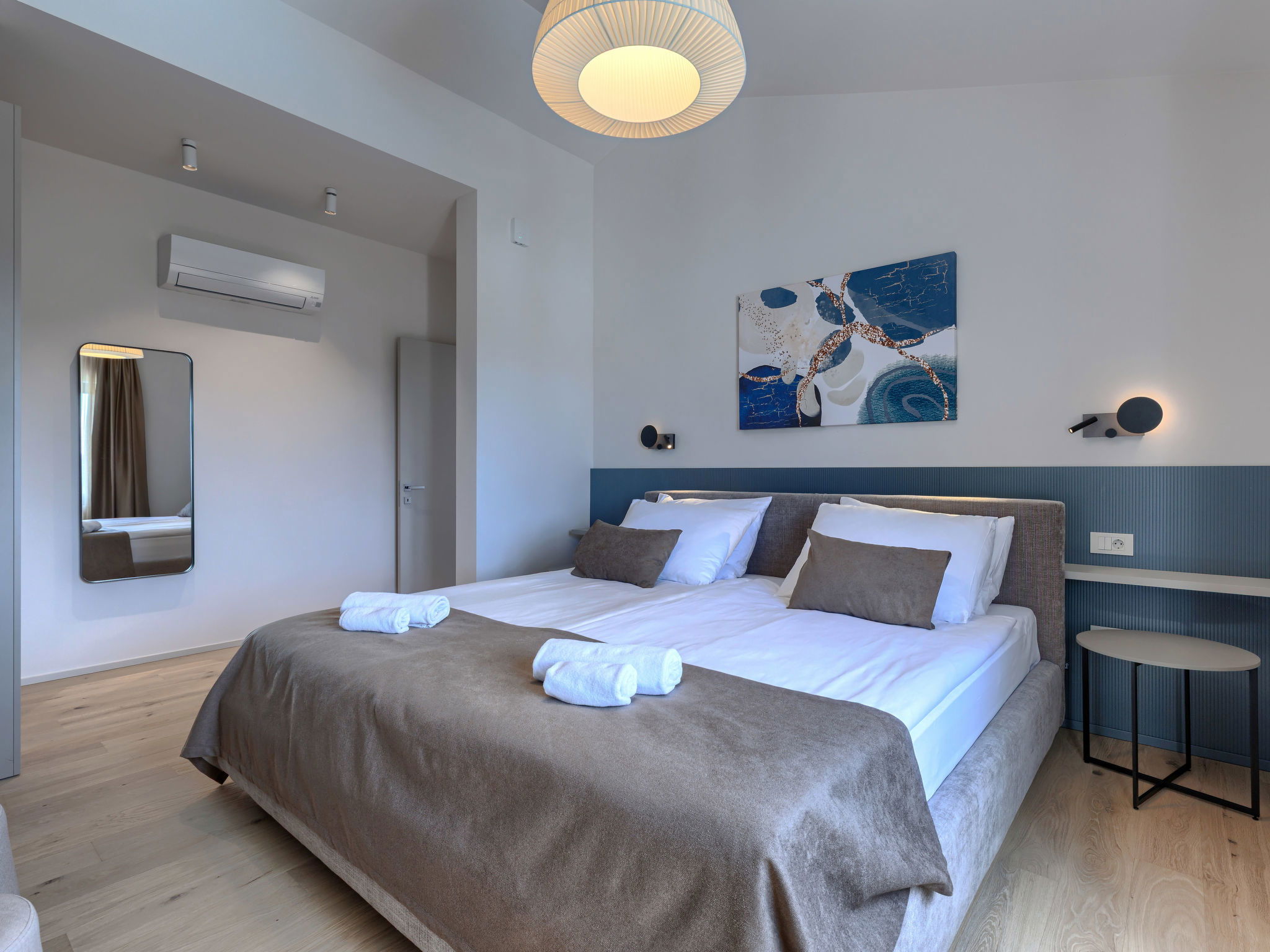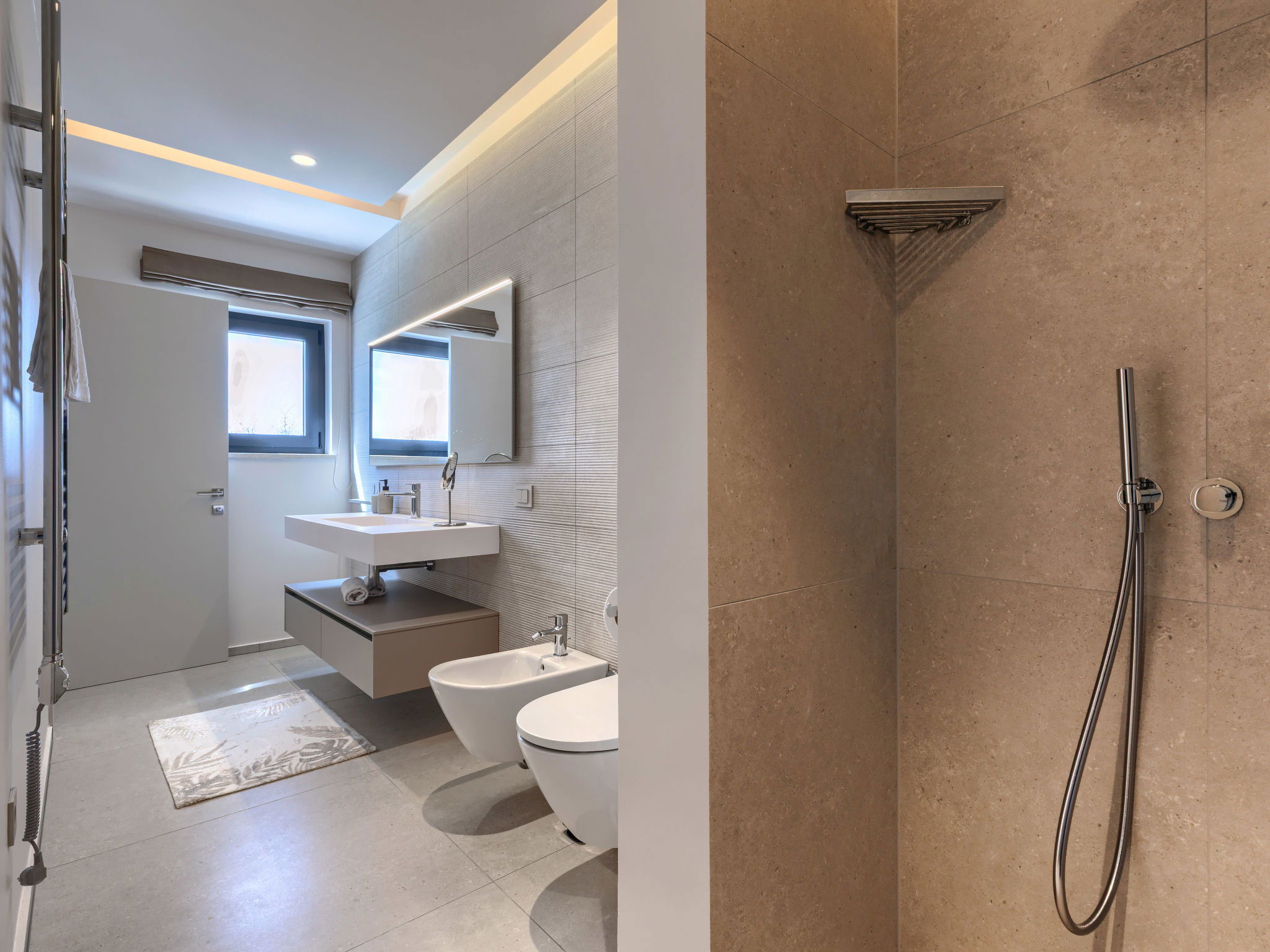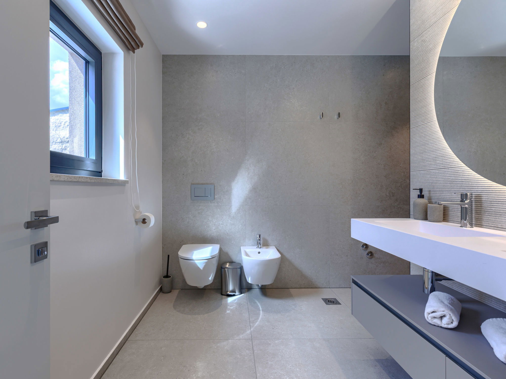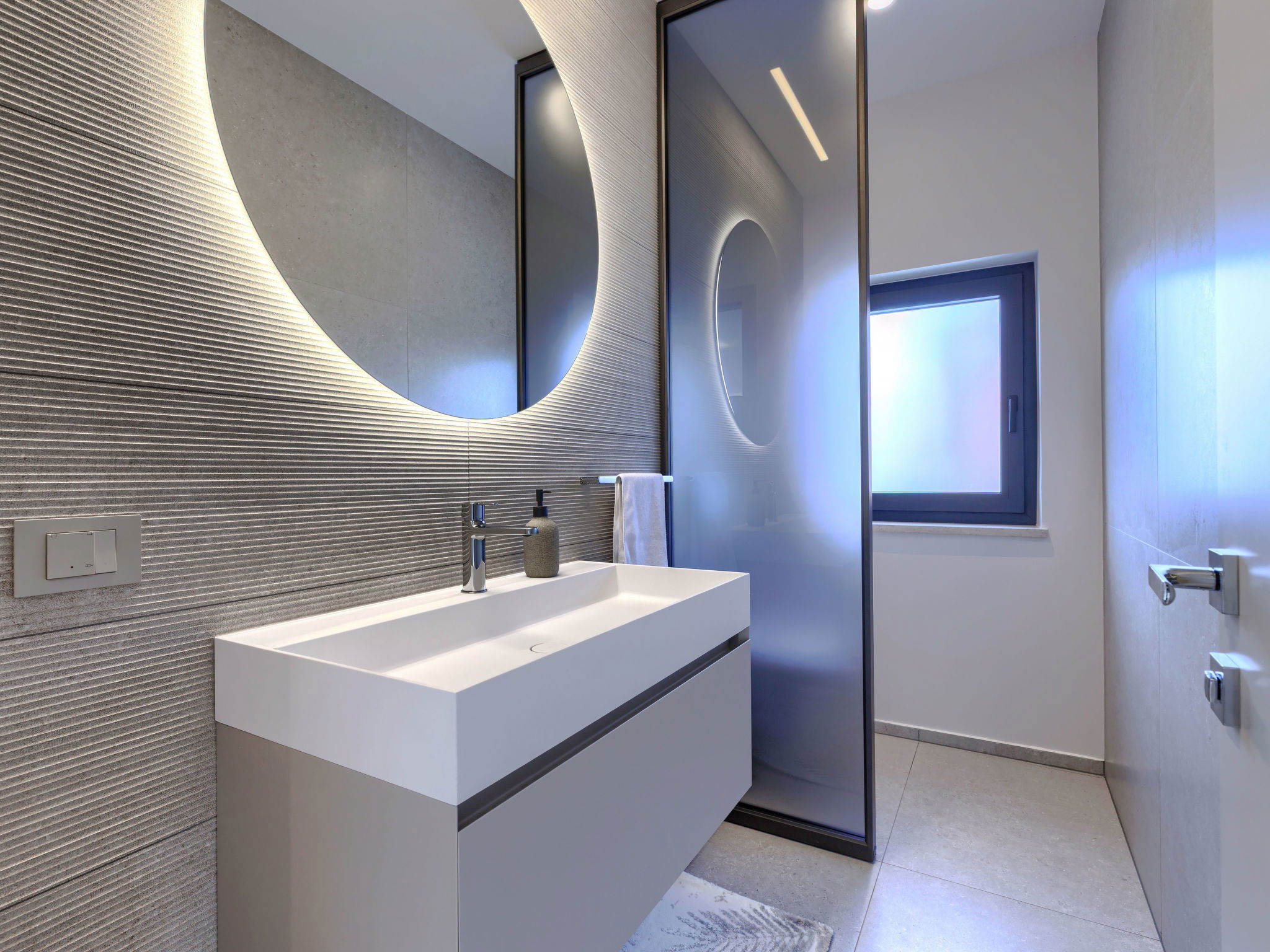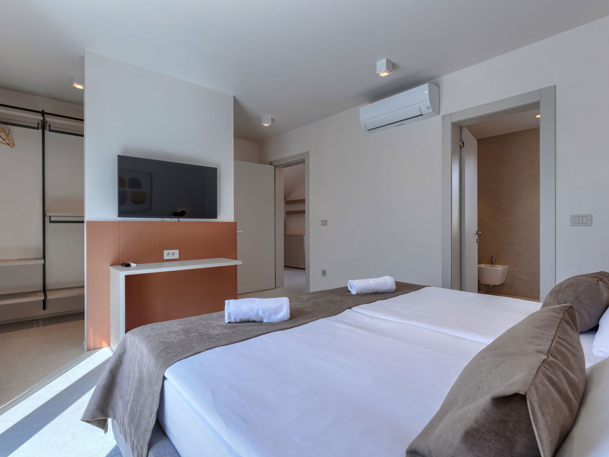Beautiful, luxurious single-family house "La Mari", 2 storeys, built in 2026. In the hamlet Banki 4 km from the centre of Tinjan, 12 km from the centre of Poreč, in a sunny position, 12 km from the sea. Private: property 1'399 m2 with lawn and wildlife garden, swimming pool angular (10 x 5 m, depth 145 cm, seasonal availability: 01.Apr. - 30.Sep.) with internal staircase. Outdoor shower, hot tub, terrace (20 m2), garden furniture, barbecue, children's playground (slide, swing), pool maintenance by the owner/gardener. In the house: internet access, sauna, washing machine. Parking (for 4 cars) at the house on the premises. E-charging station. Shop 4 km, supermarket 11 km, restaurant 4 km, bus stop 4 km, pebble beach 12 km, rocky beach 12 km. Nearby attractions: Aquapark 18 km, Adrenalin park Kringa 7 km. The owner does not accept any youth groups.