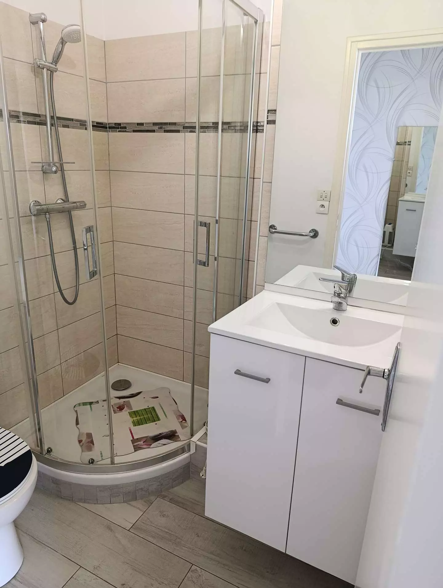 A bathroom with shower and toilet