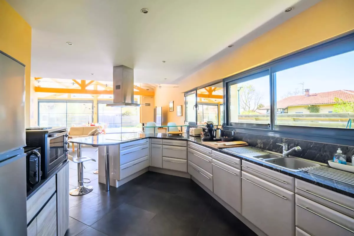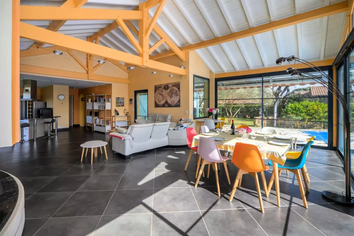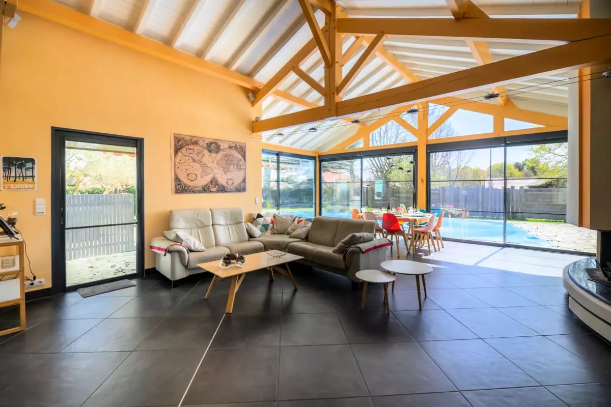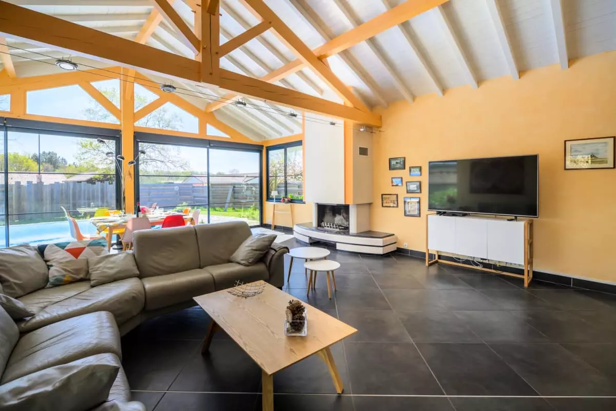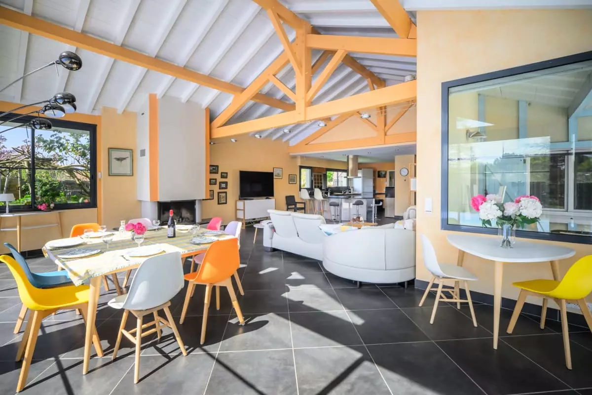 The heart of the house revolves around an exceptional 80 m² living room, bathed in light thanks to its large bay windows and equipped with a six-seater sofa, a library and board games for your moments of sharing.