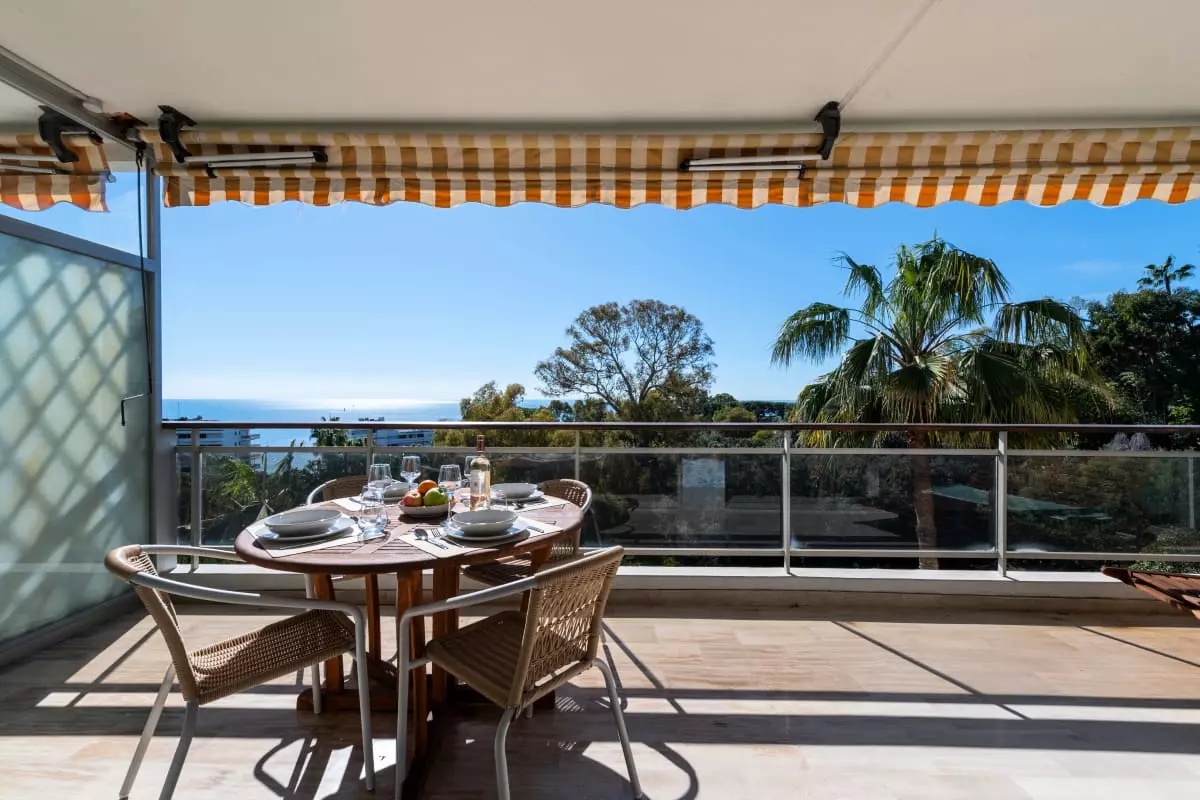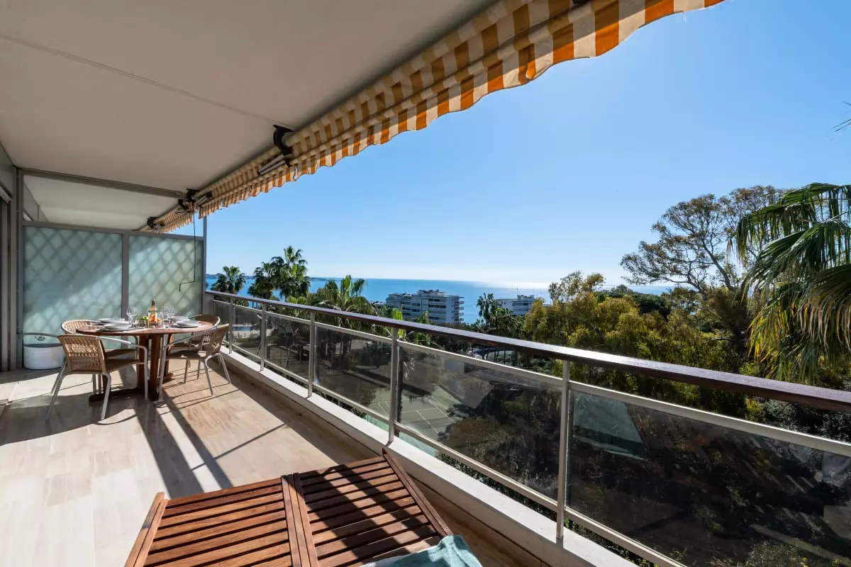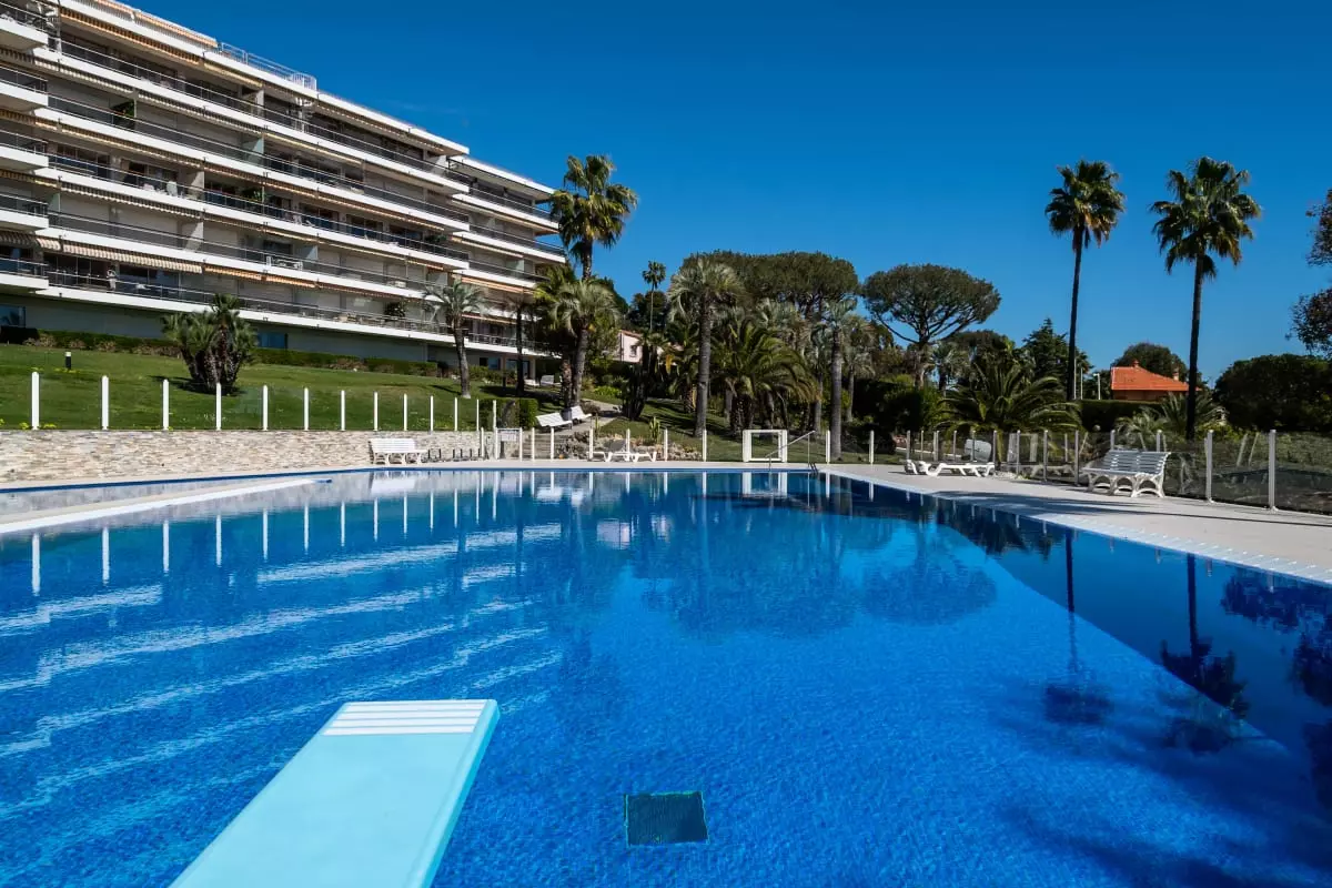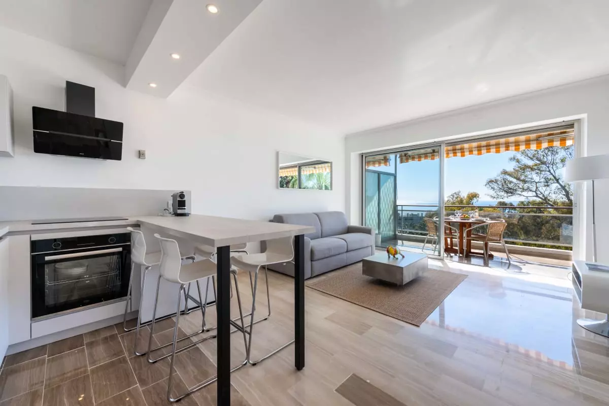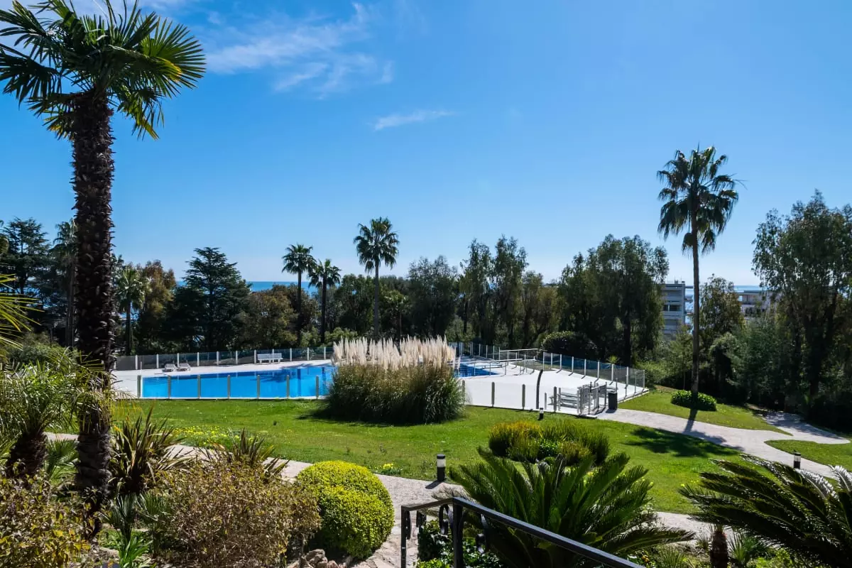 Perched atop a hill overlooking the sea, in a verdant residence, this apartment offers spectacular views stretching from Cap d'Antibes to the Lérins Islands. The south-facing terrace quickly becomes the place where you'll spend most of your time, enjoying breakfasts with a view of the horizon and evenings watching the lights of the bay.
