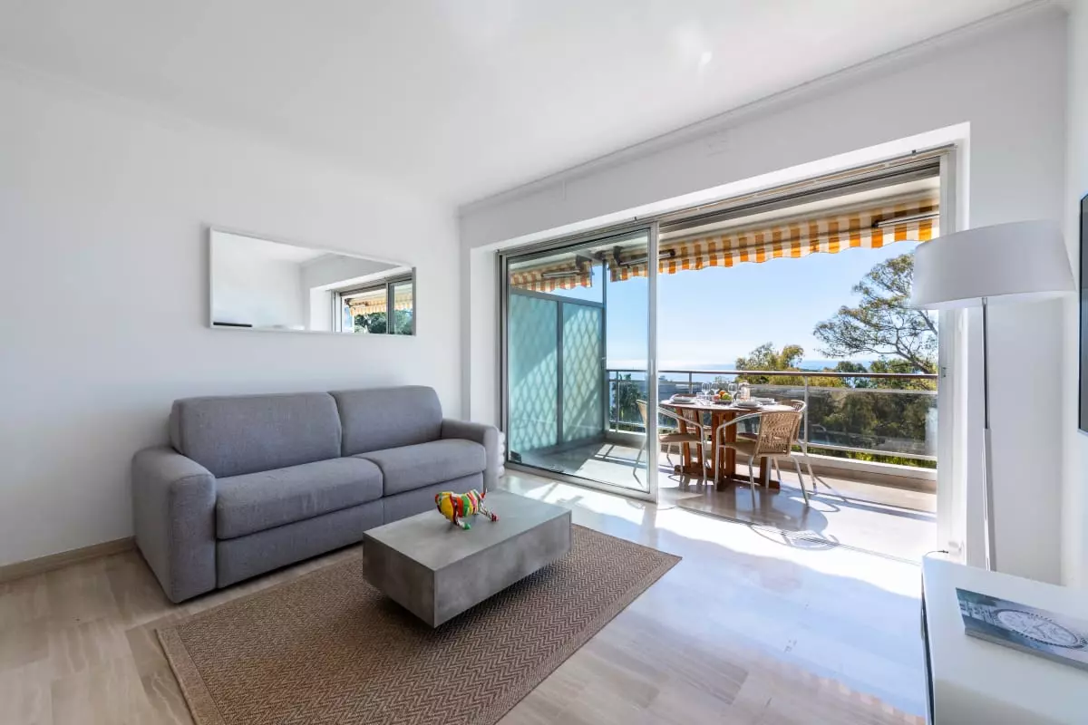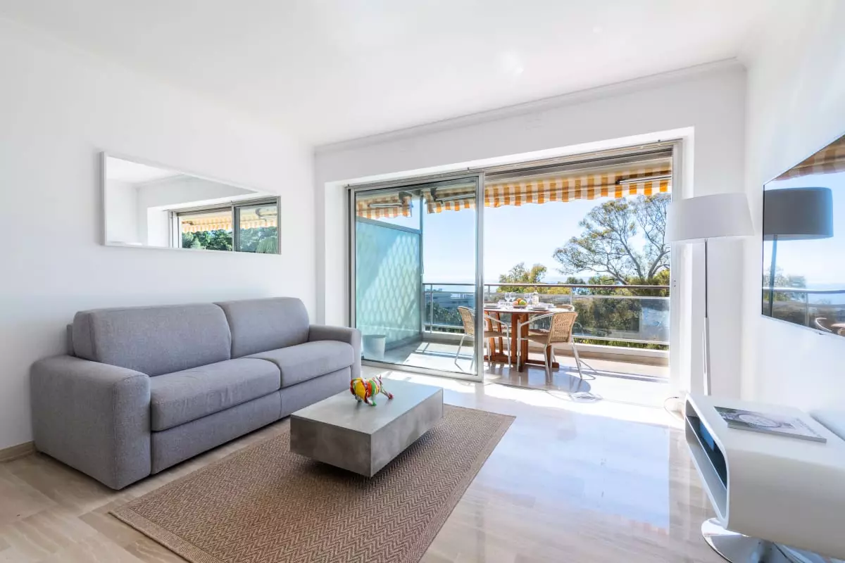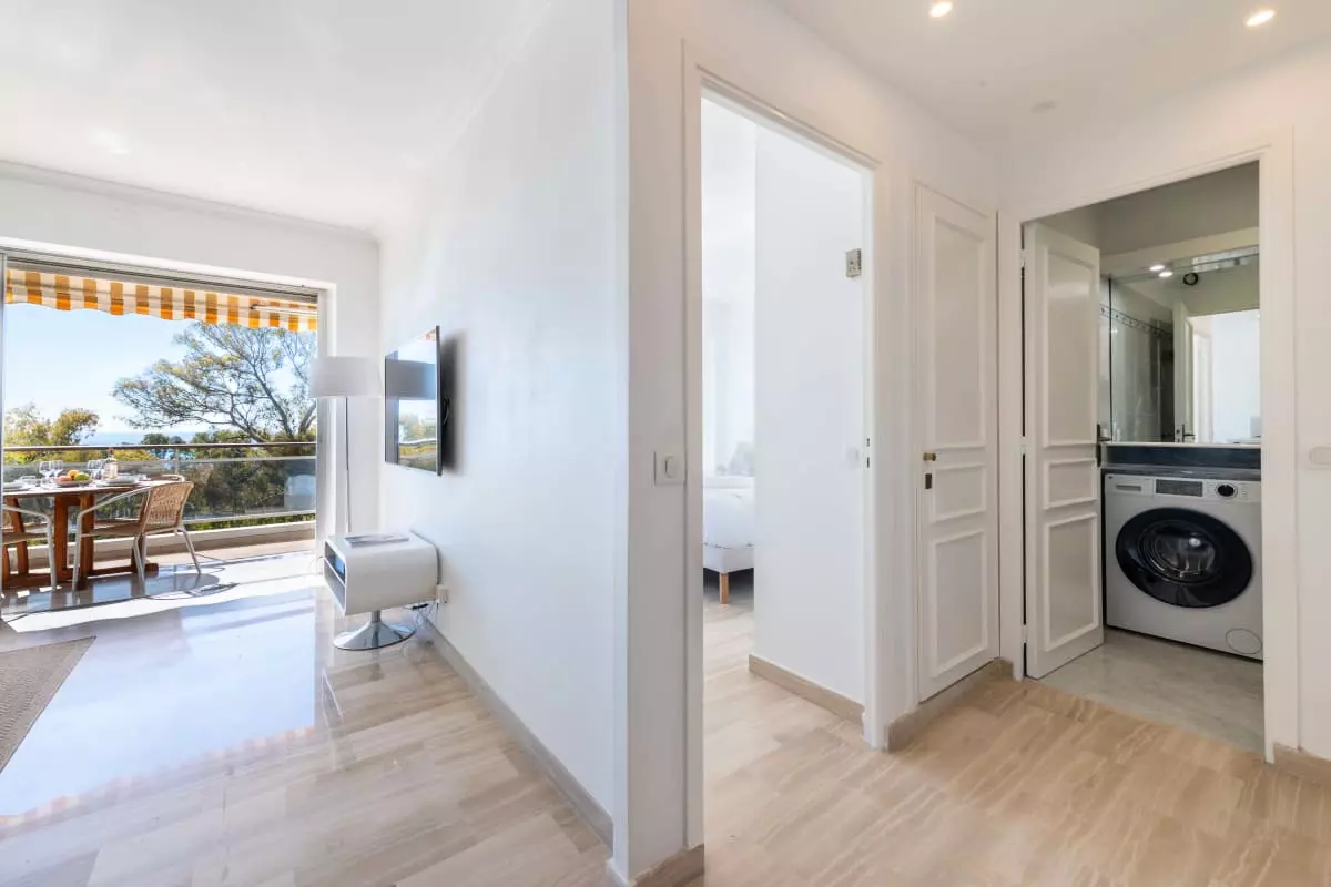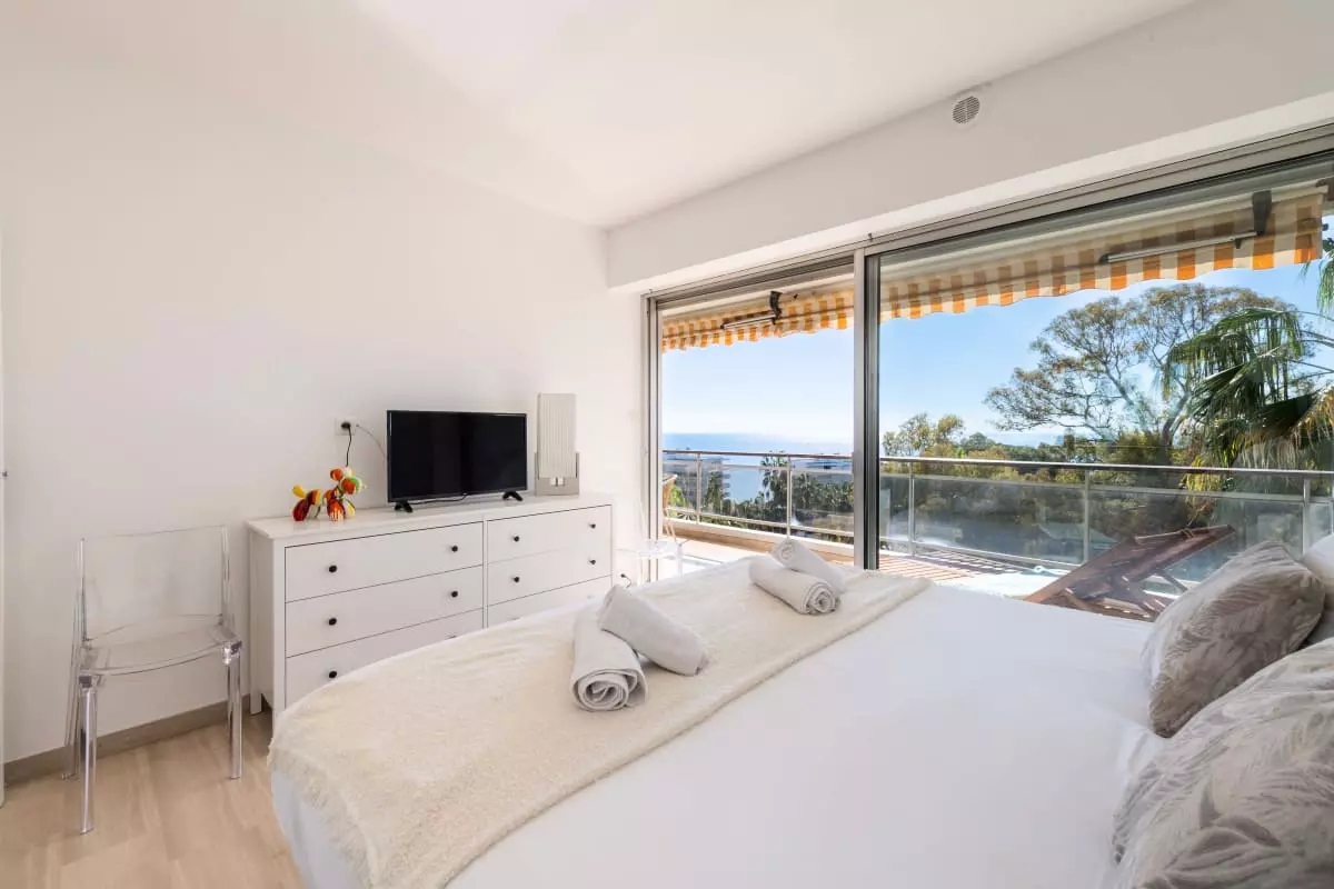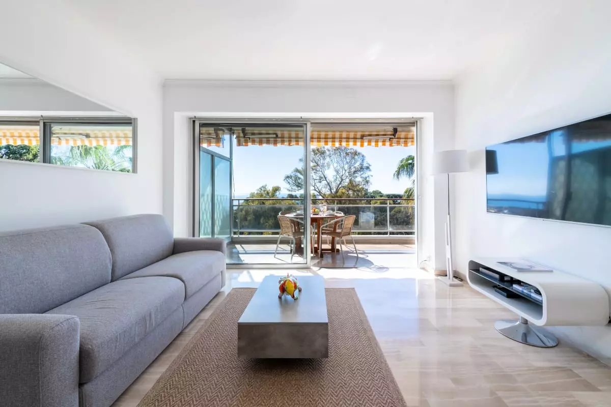 Perched atop a hill overlooking the sea, in a verdant residence, this apartment offers spectacular views stretching from Cap d'Antibes to the Lérins Islands. The south-facing terrace quickly becomes the place where you'll spend most of your time, enjoying breakfasts with a view of the horizon and evenings watching the lights of the bay.