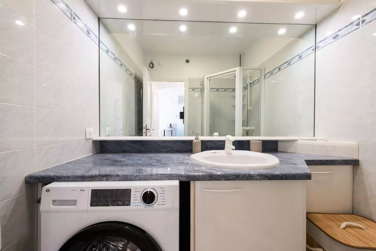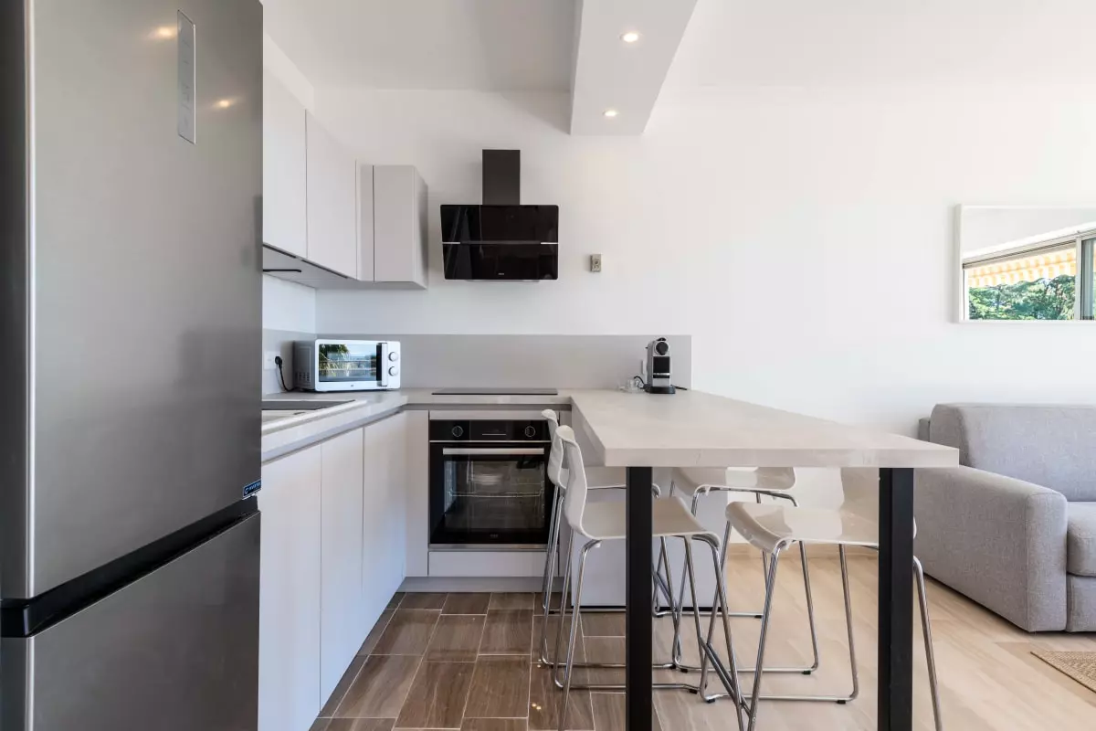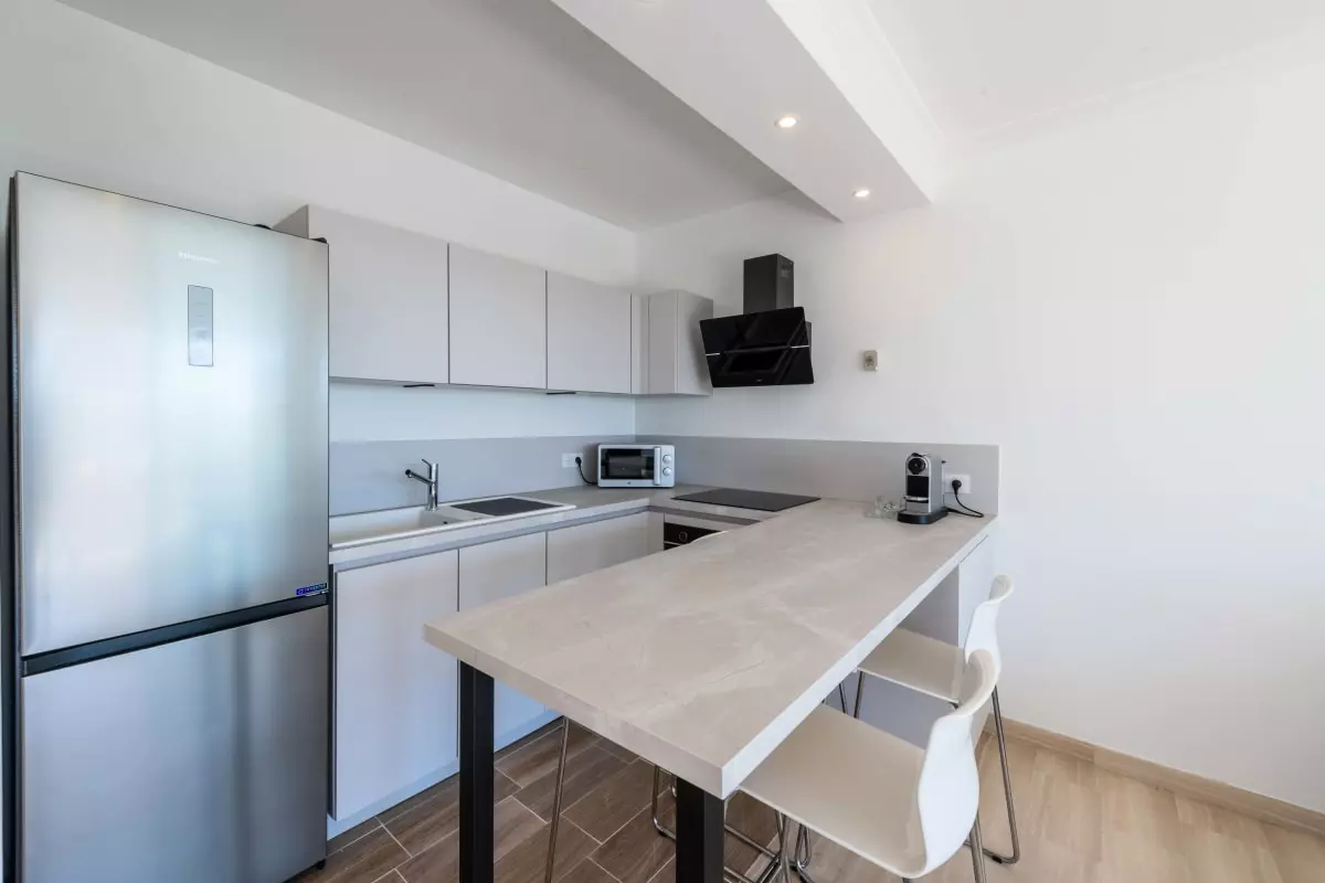 From the entrance, you enter the main living area. The living room features a sofa that converts into a 140x190 cm bed, as well as a large-screen smart TV. The open-plan kitchen is fully equipped and blends seamlessly into this welcoming space.