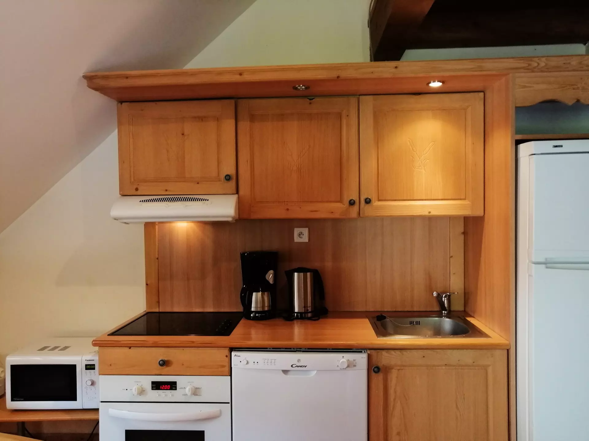 * Kitchen area: ceramic hob, oven, fridge/freezer, dishwasher, coffee maker, storage cupboards;